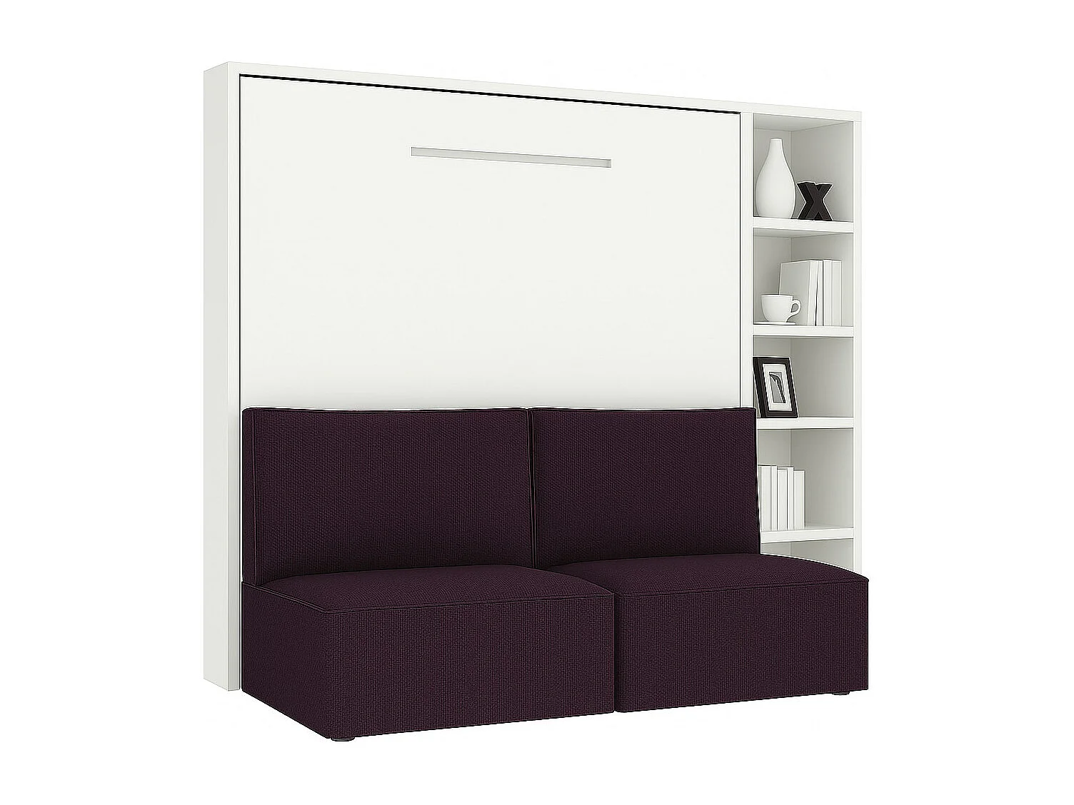 Lit escamotable horizontal LOGIA-160x200-Canapé Violet-Structure Blanche-Version lit+canapé+étagère