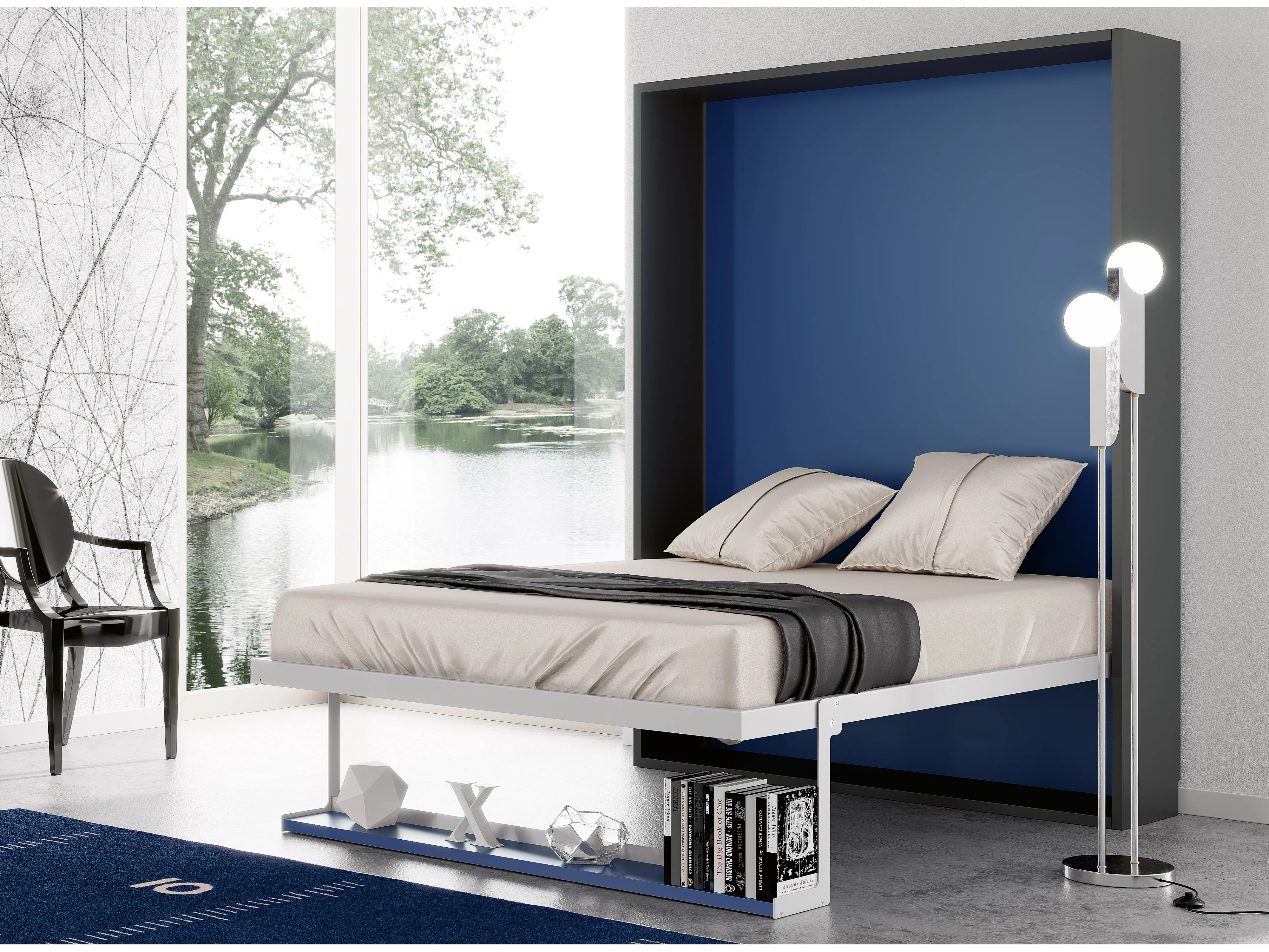 Lit escamotable vertical 90x190 avec étagère Habitat-Avec matelas-Cadre Blanc-Façade Blanche