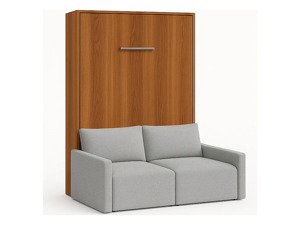 Lit escamotable vertical avec canapé tissu VALENCIA-Avec matelas-90x190-Canapé Gris clair-Structure Noyer