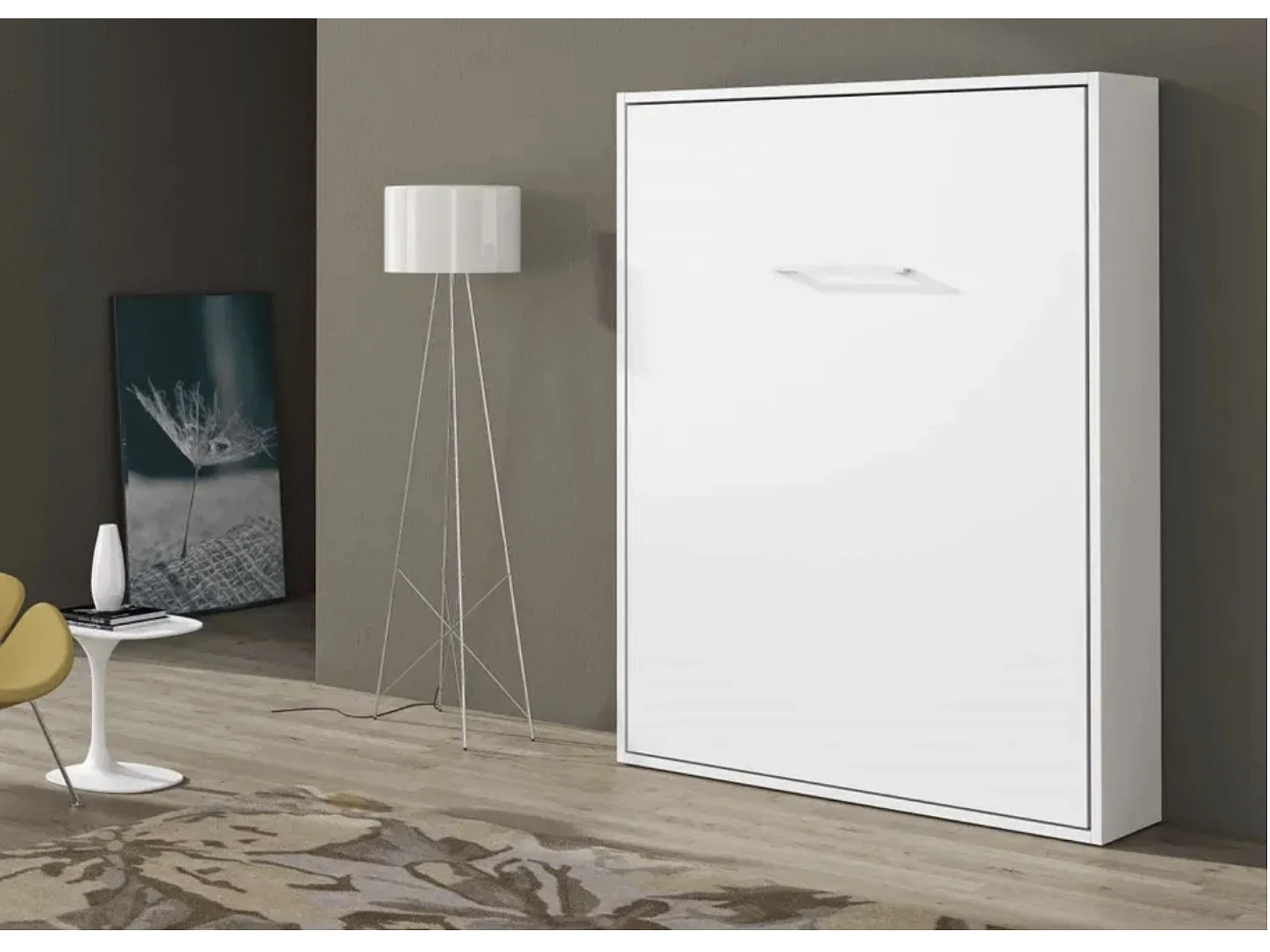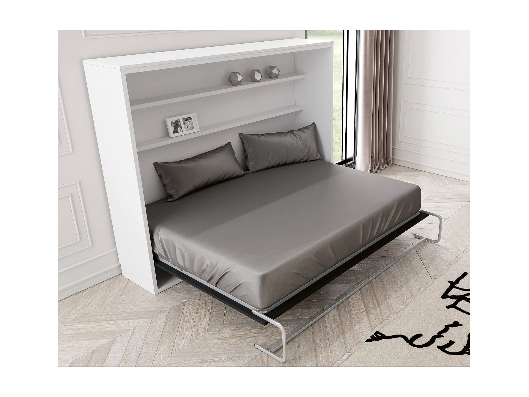 Lit escamotable vertical avec étagères intérieures PAOLA-140x200-Cadre Blanc-Façade Blanche