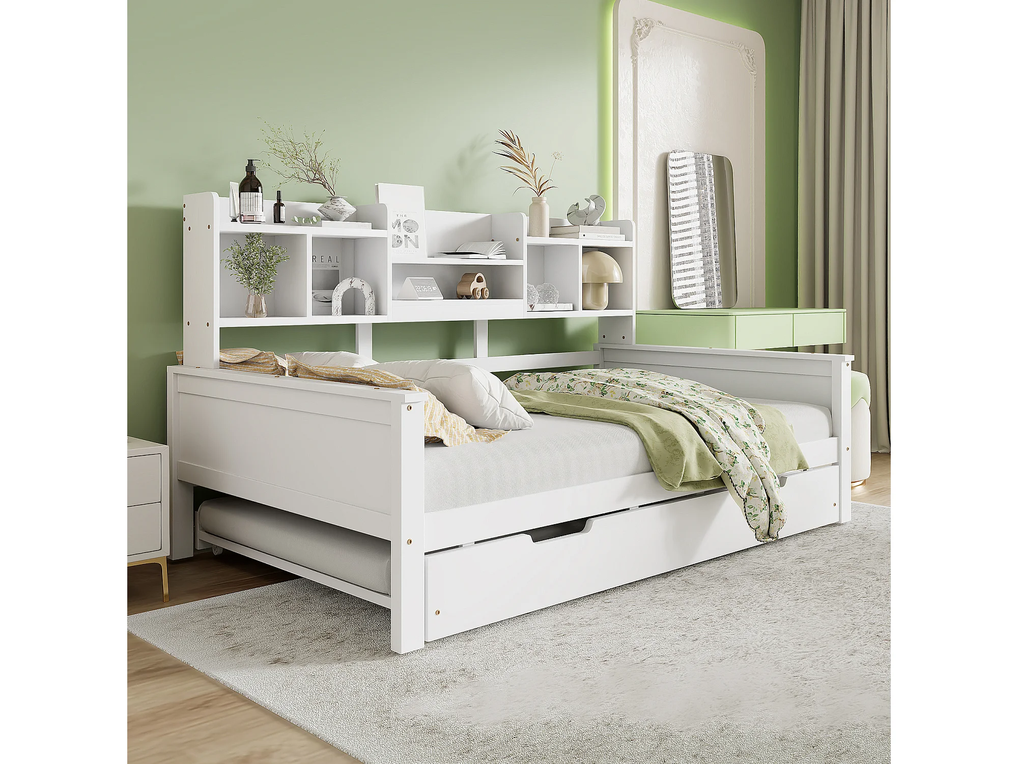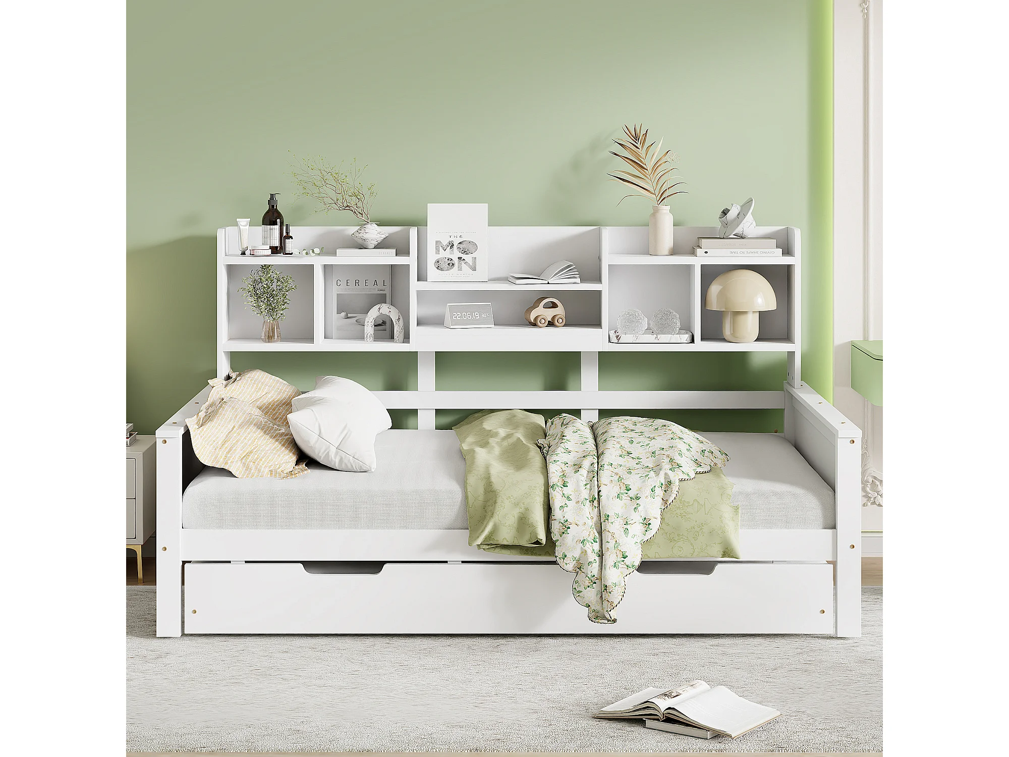 Lit gigogne 90x200/190 cm avec compartiment de rangement et sommier, finition bois blanc, sans matelas