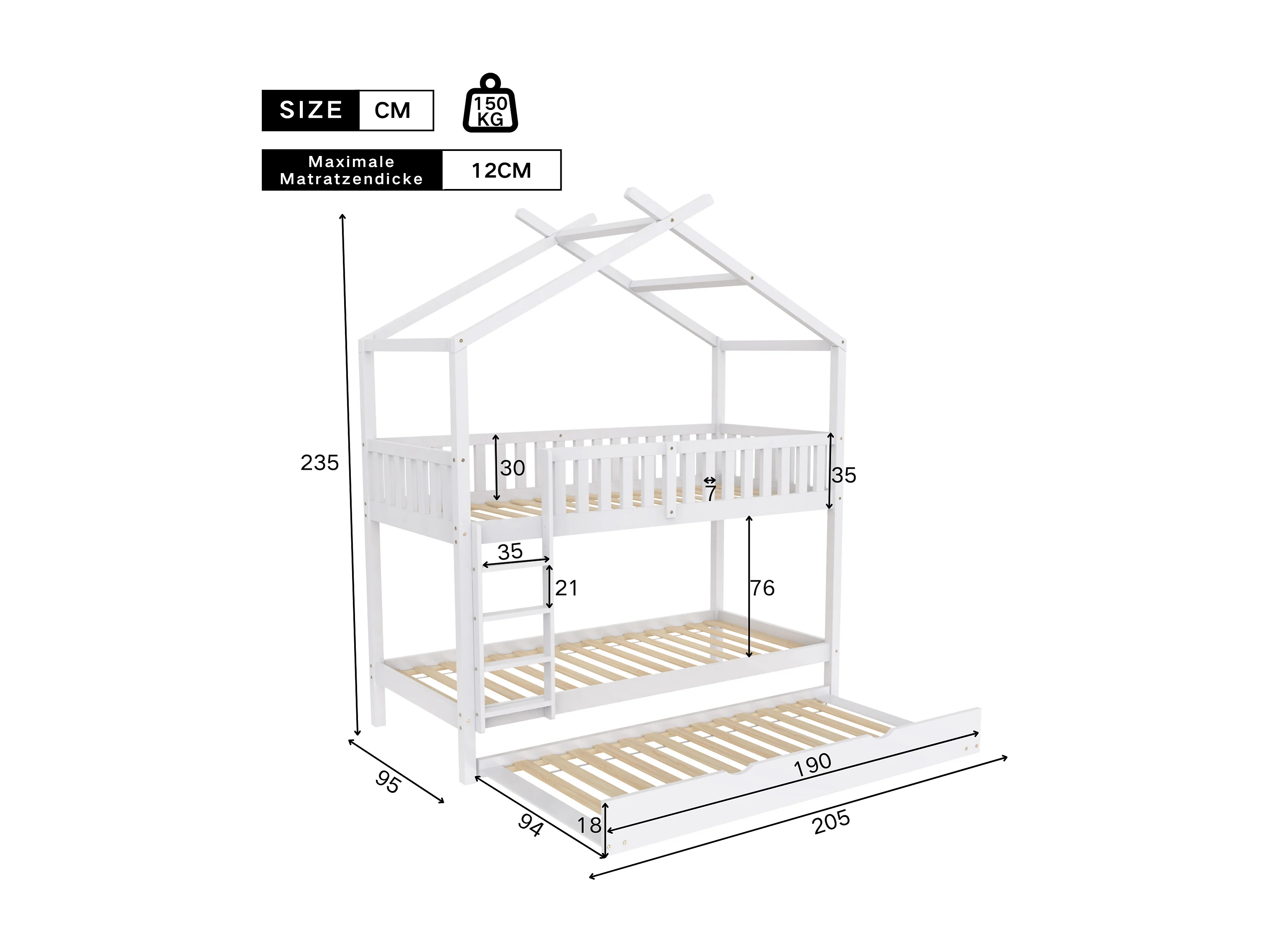 Lit gigogne enfant 90×200 cm avec 3 couchages, structure en bois massif blanc, gain de place