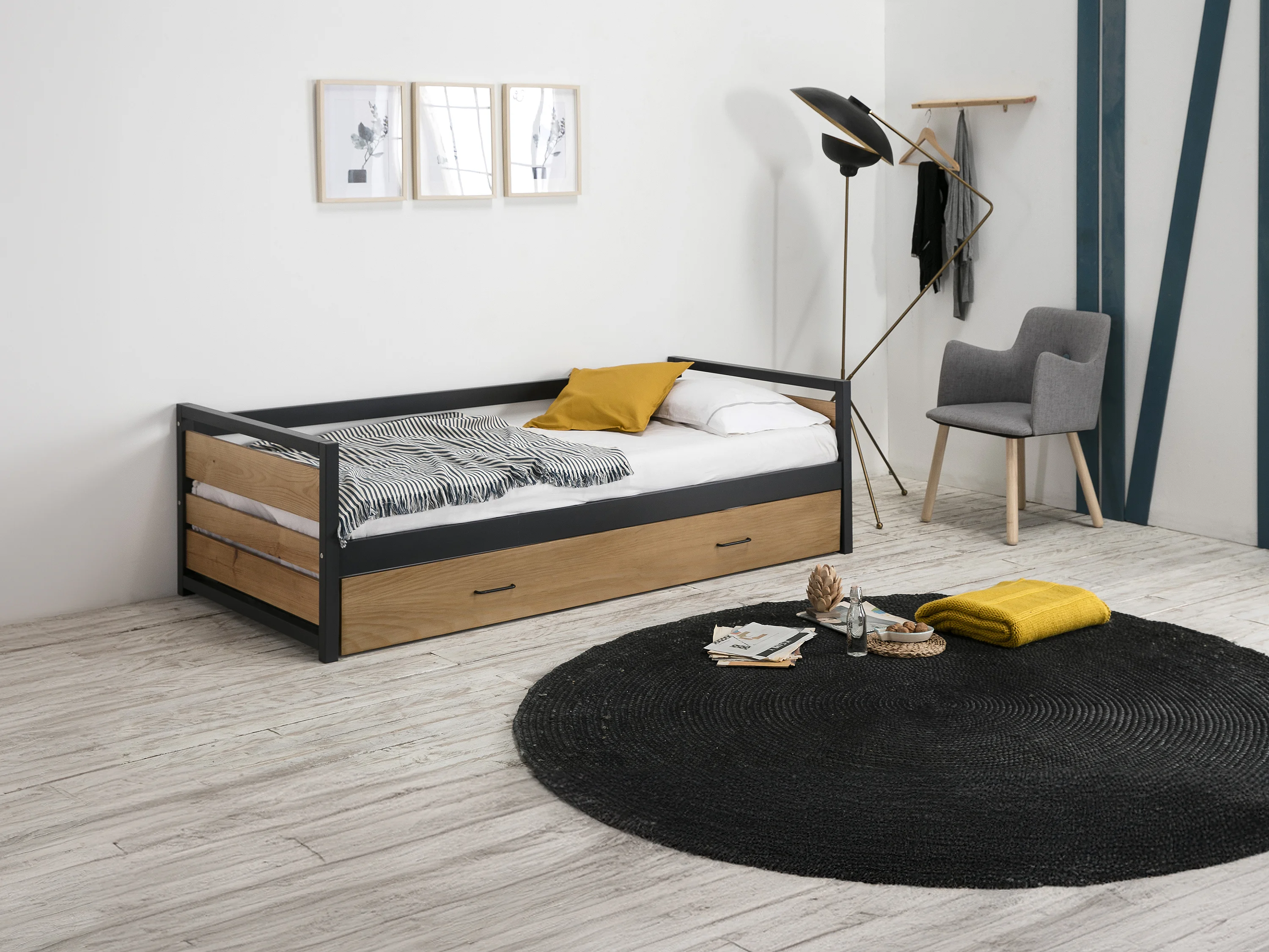 Lit gigogne industriel BOSTON - 2 x 90 x 190 cm - MDF, Pin et métal - Coloris : Noyer et anthracite + Matelas