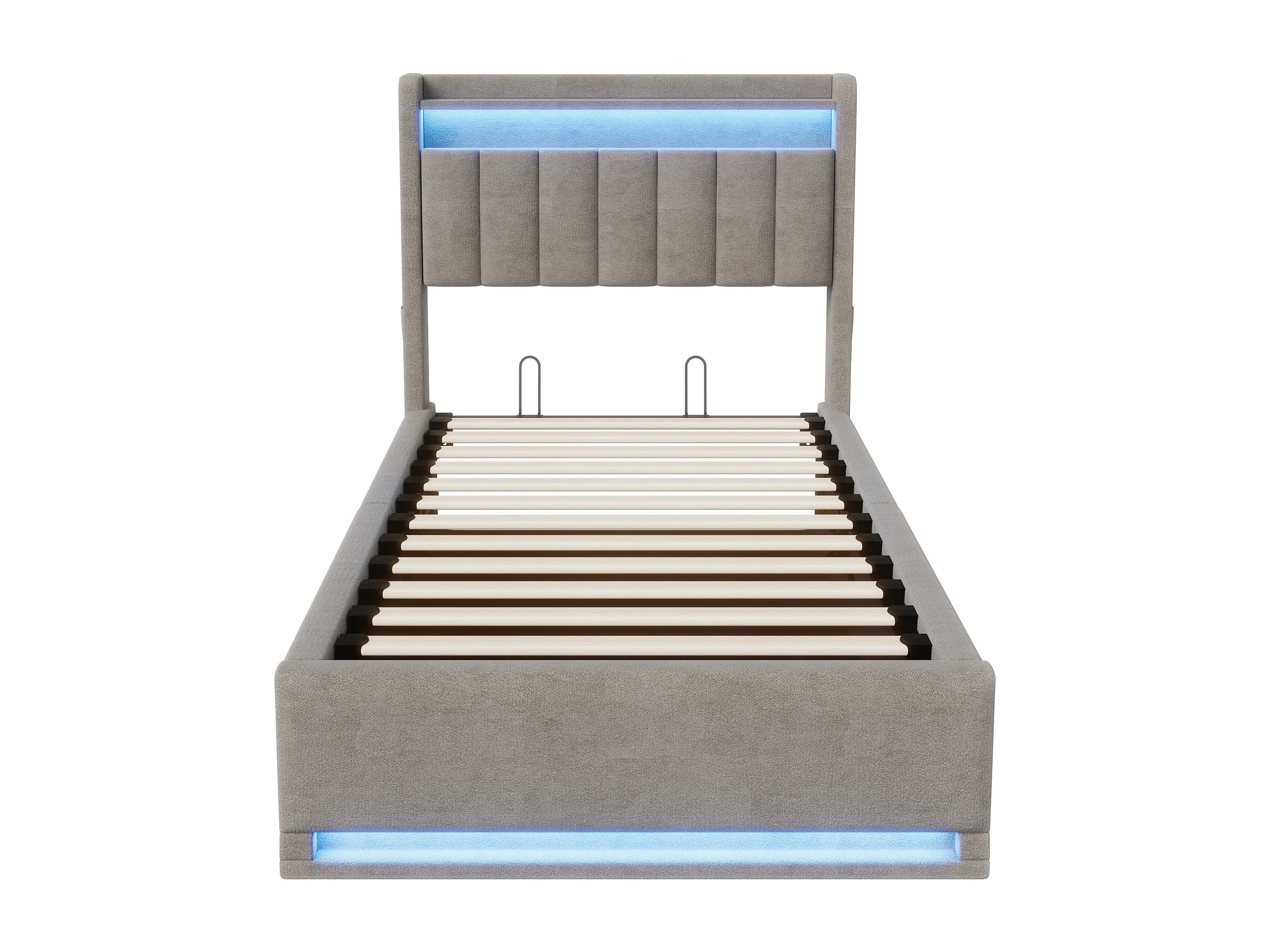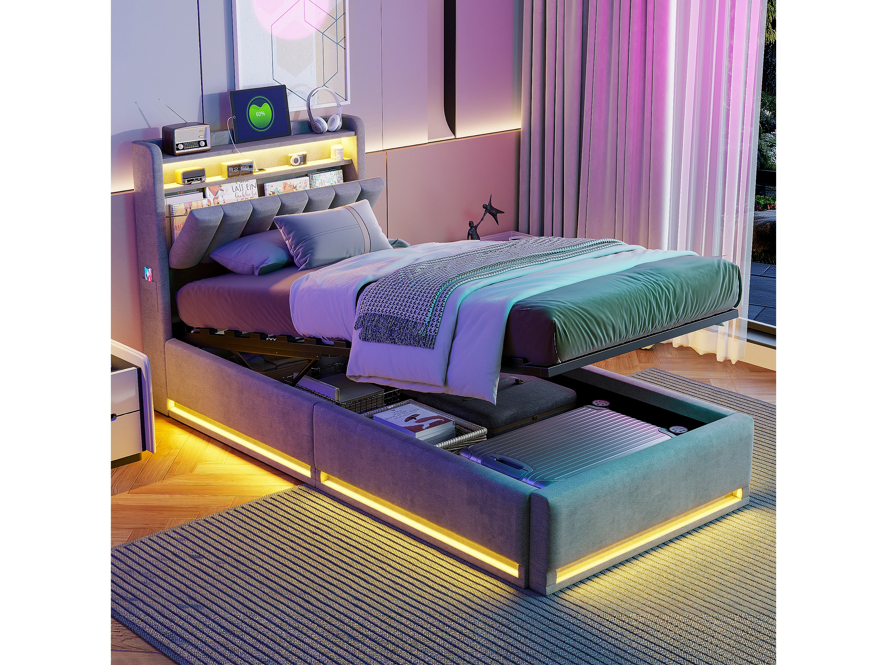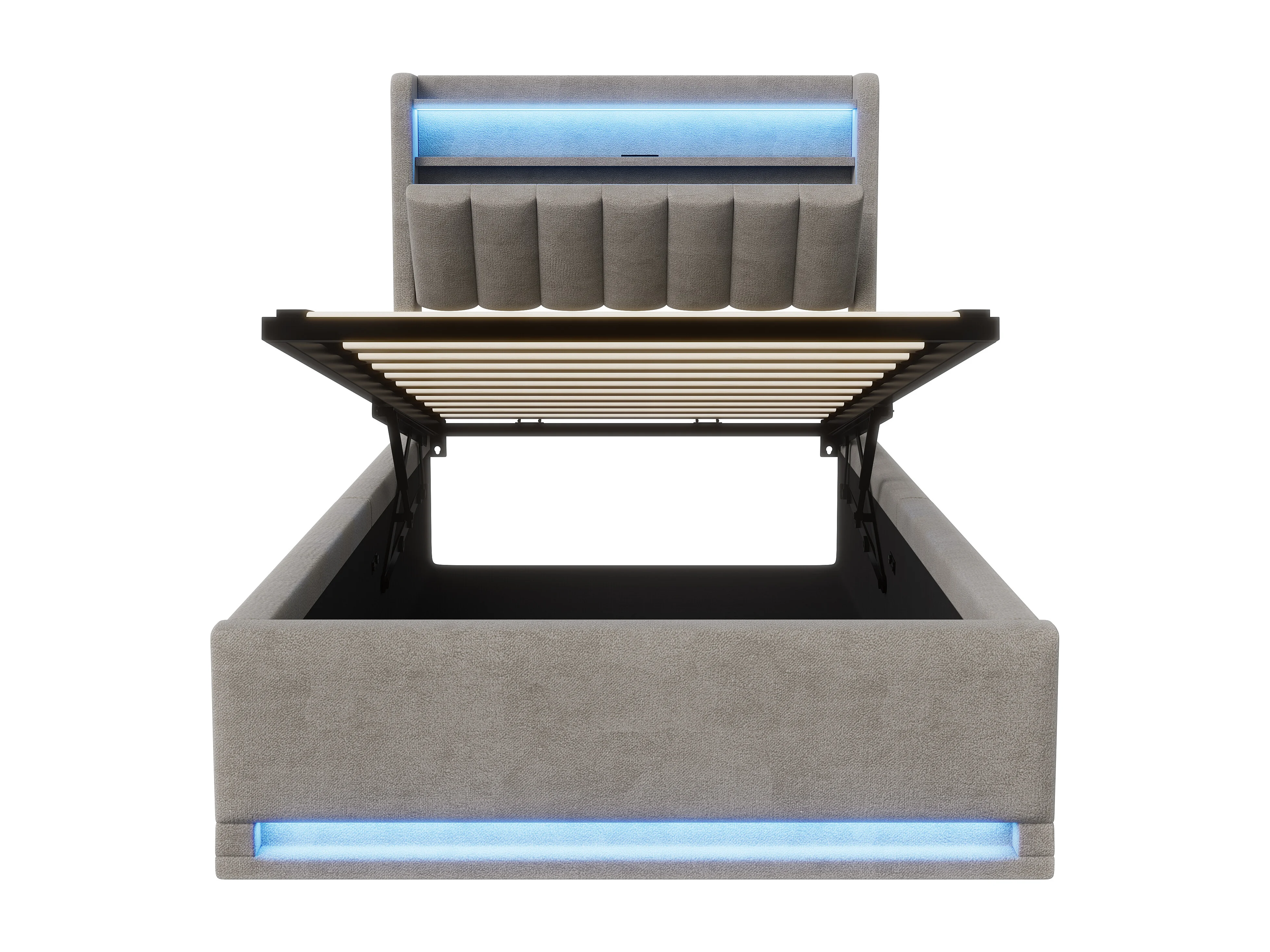 Lit LED RGB 90x200 cm avec Tête de Lit Multifonctionnelle, Rangement, Chargeur USB & USB-C – Velours Gris ou Beige