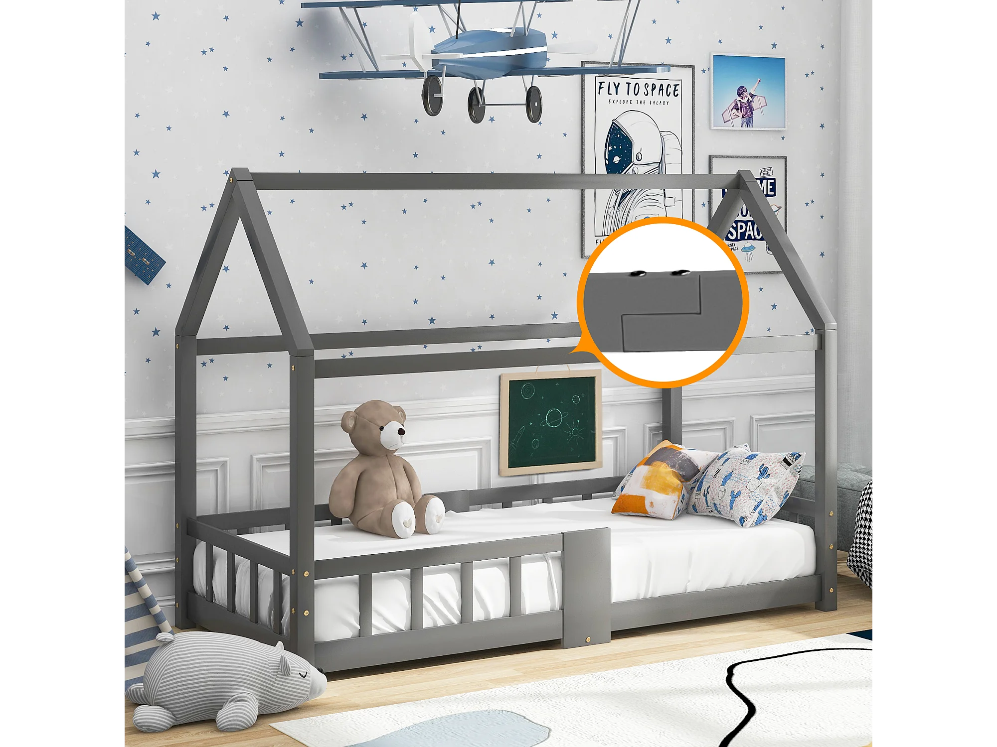 Lit maison Kinderbett 90x200 cm en bois de pin pour chambre d’enfant, tableau et lattes inclus, garde-corps, Gris, sans matelas