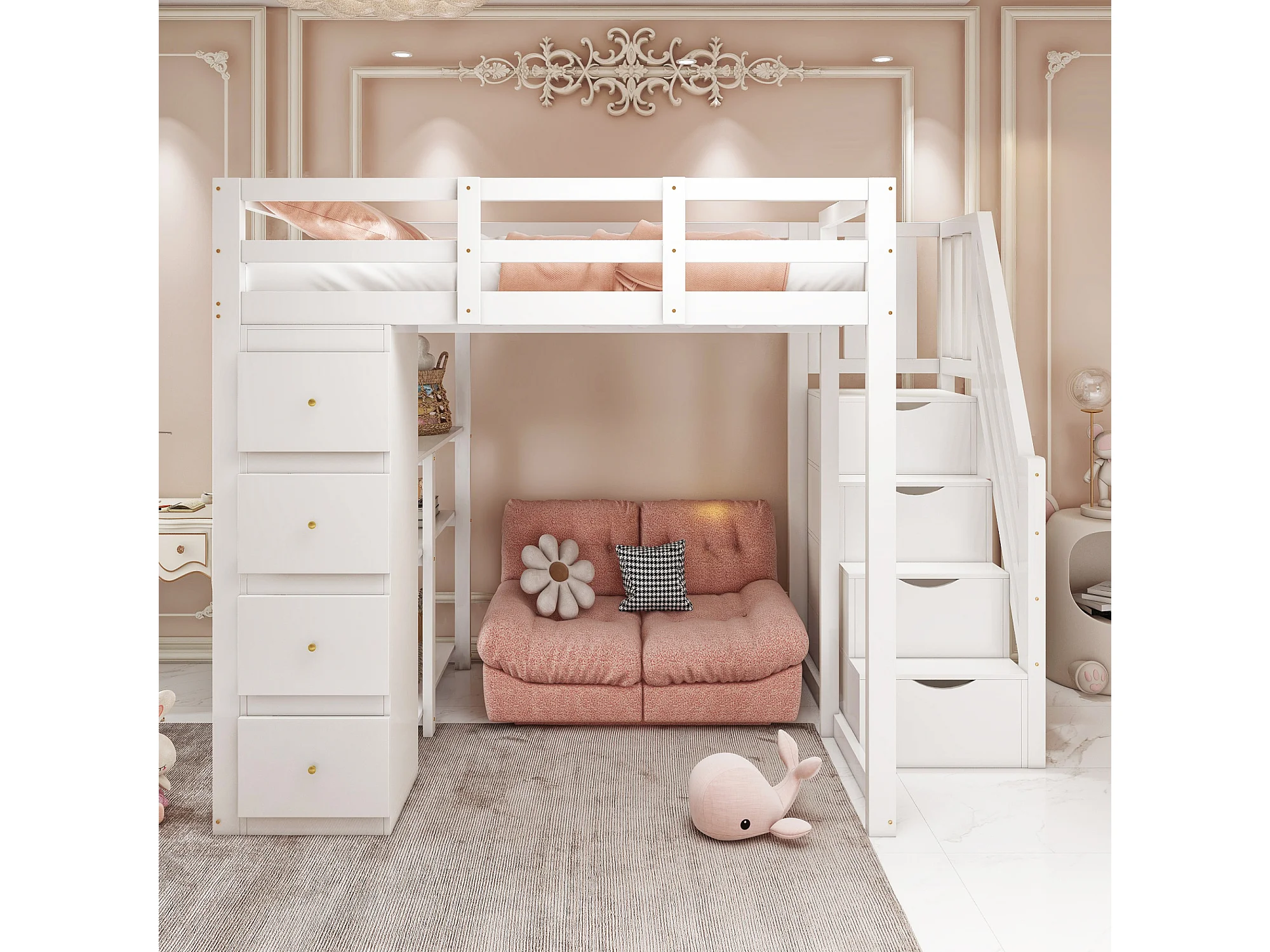 Lit mezzanine 140x200 cm blanc, avec commode, rangements et échelle à tiroirs, lit multifonction en bois massif