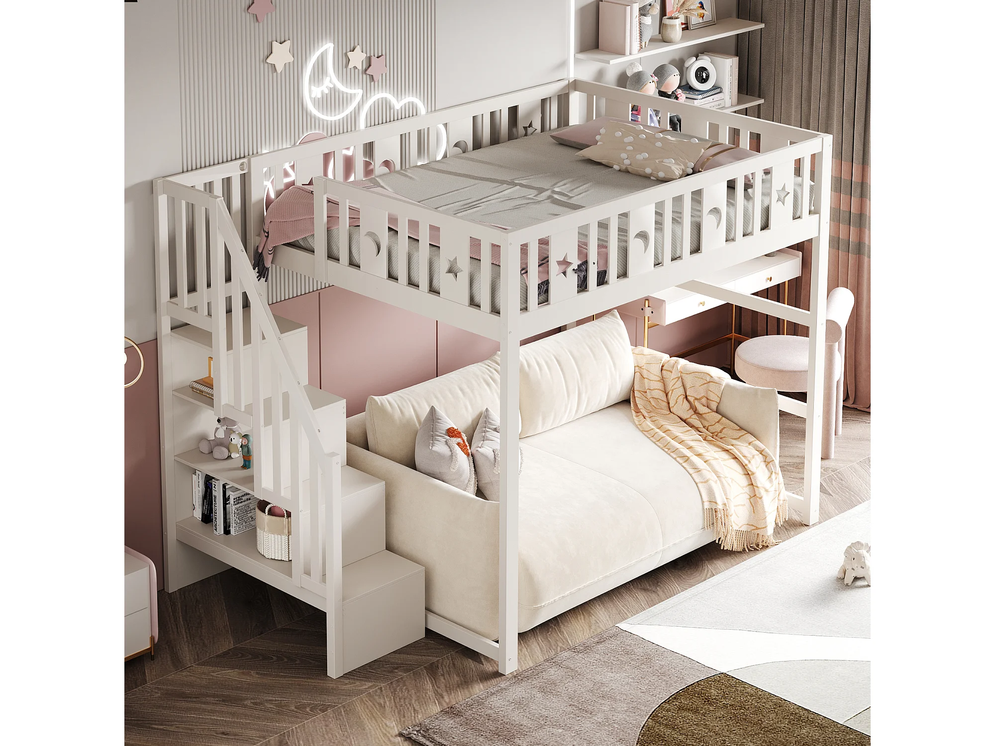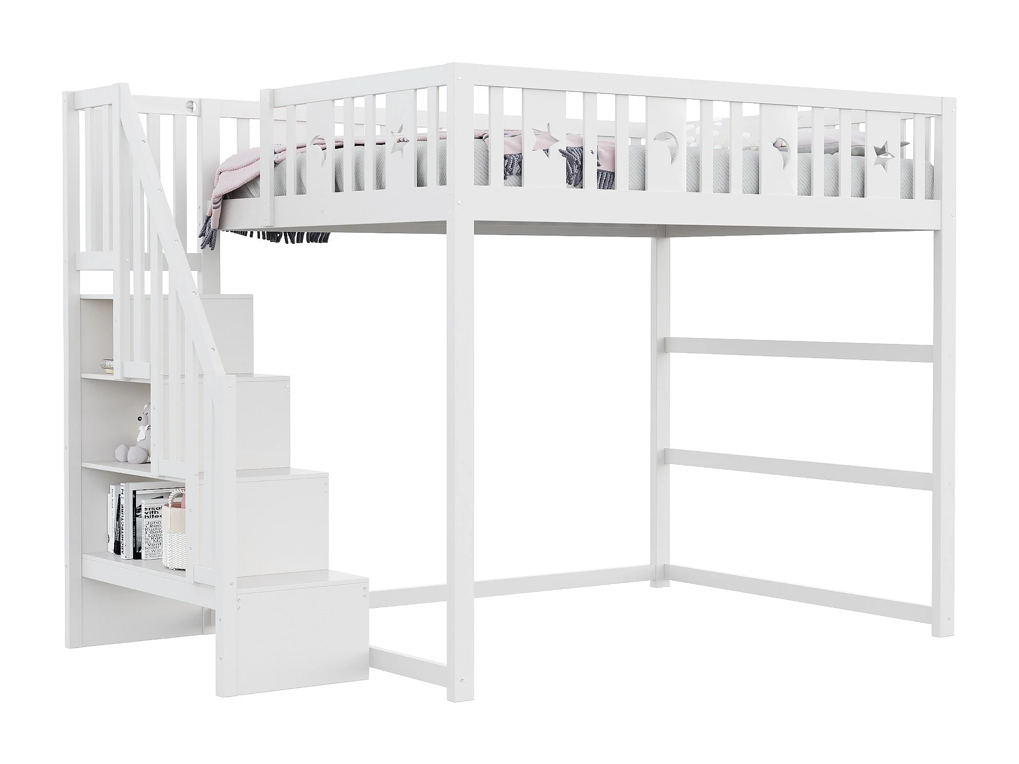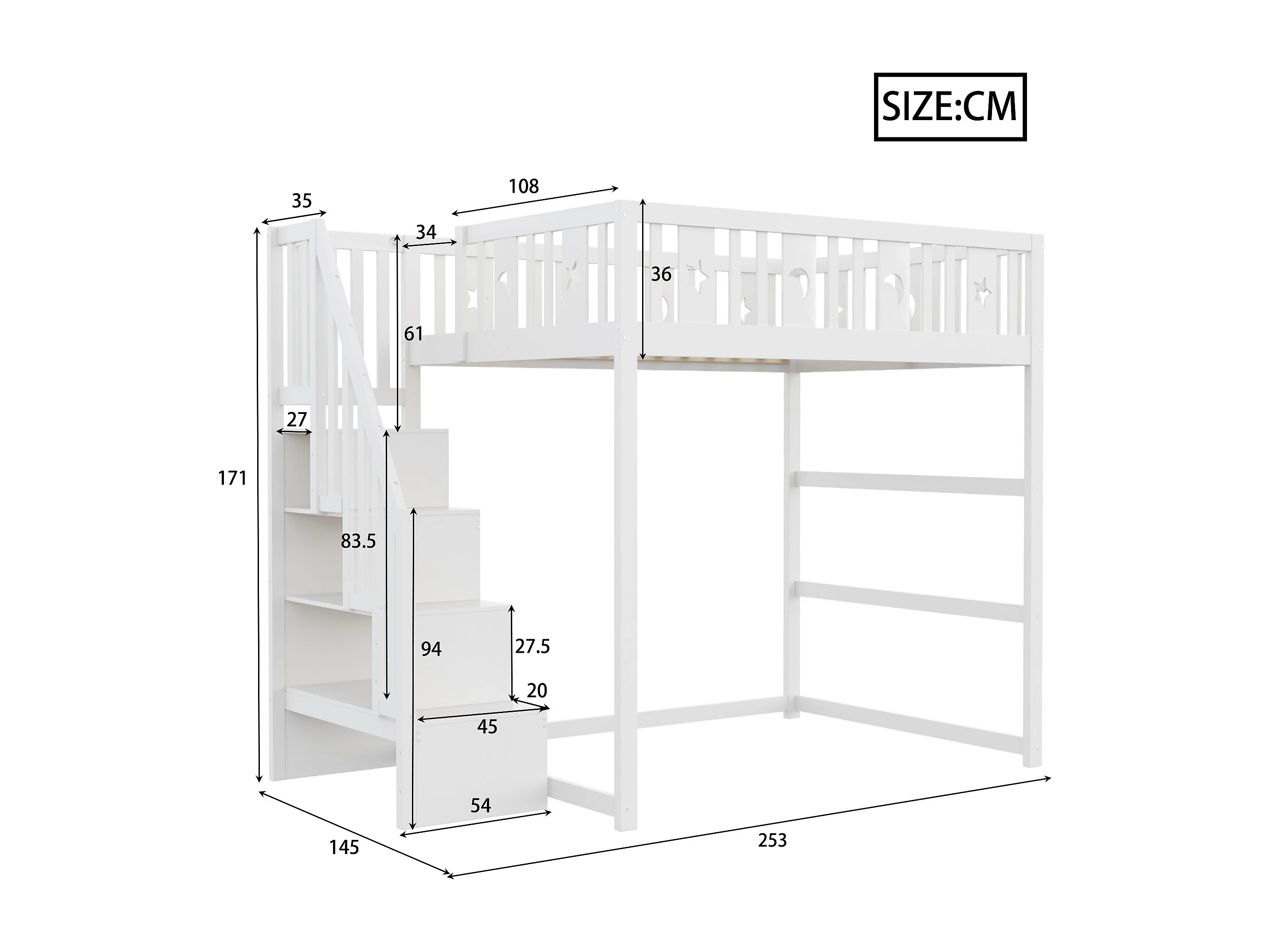 Lit mezzanine 140x200 cm, bois massif, échelle et barrières de sécurité, décoration étoiles et lune, tiroirs, lit enfant, blanc