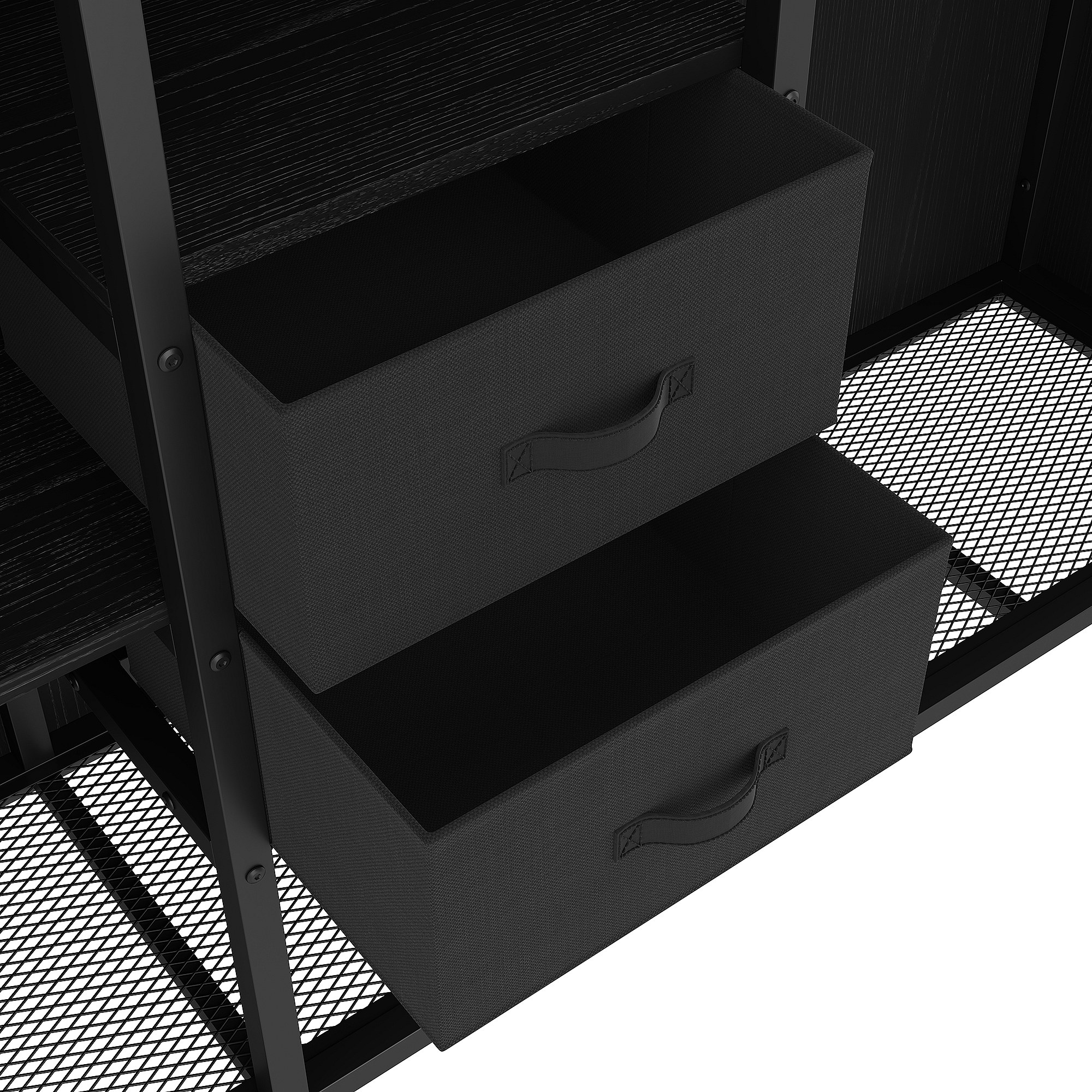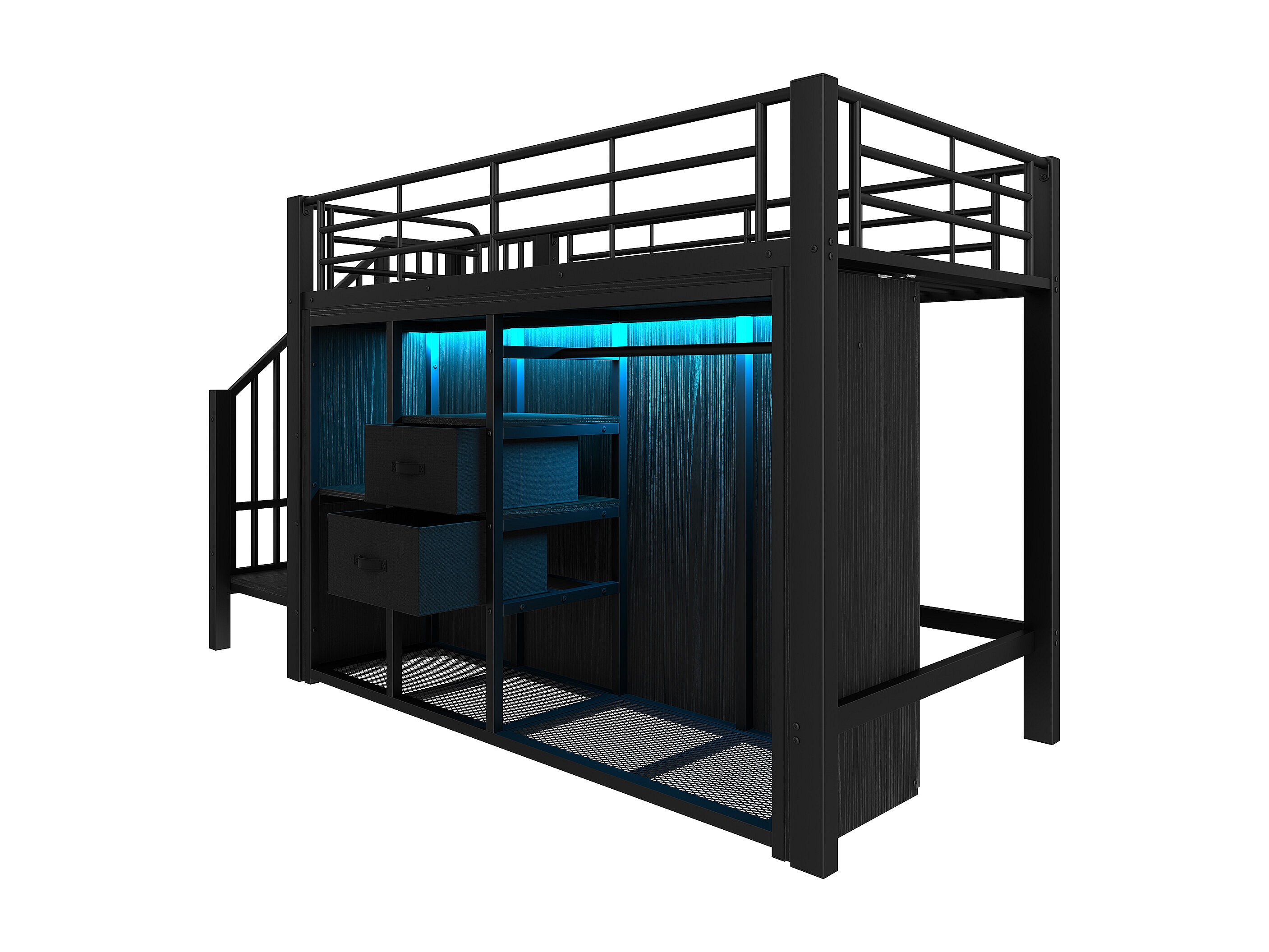 Lit mezzanine 90x200 cm - avec 2 tiroirs - armoire ouverte - avec éclairage LED - compartiments de rangement - noir (matelas non inclus)