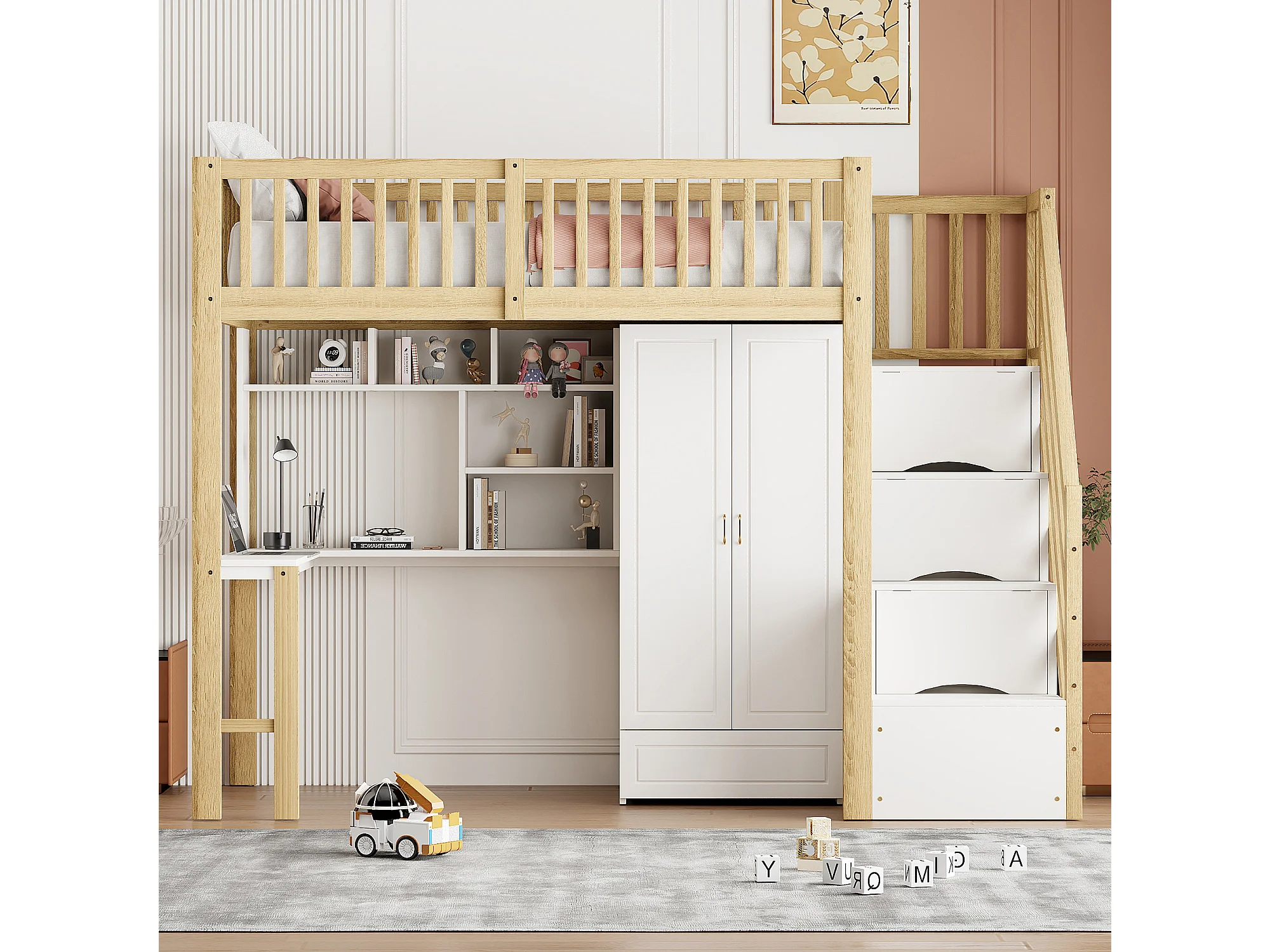 Lit mezzanine 90x200 cm avec dressing, bureau et escalier de rangement, structure en bois naturel