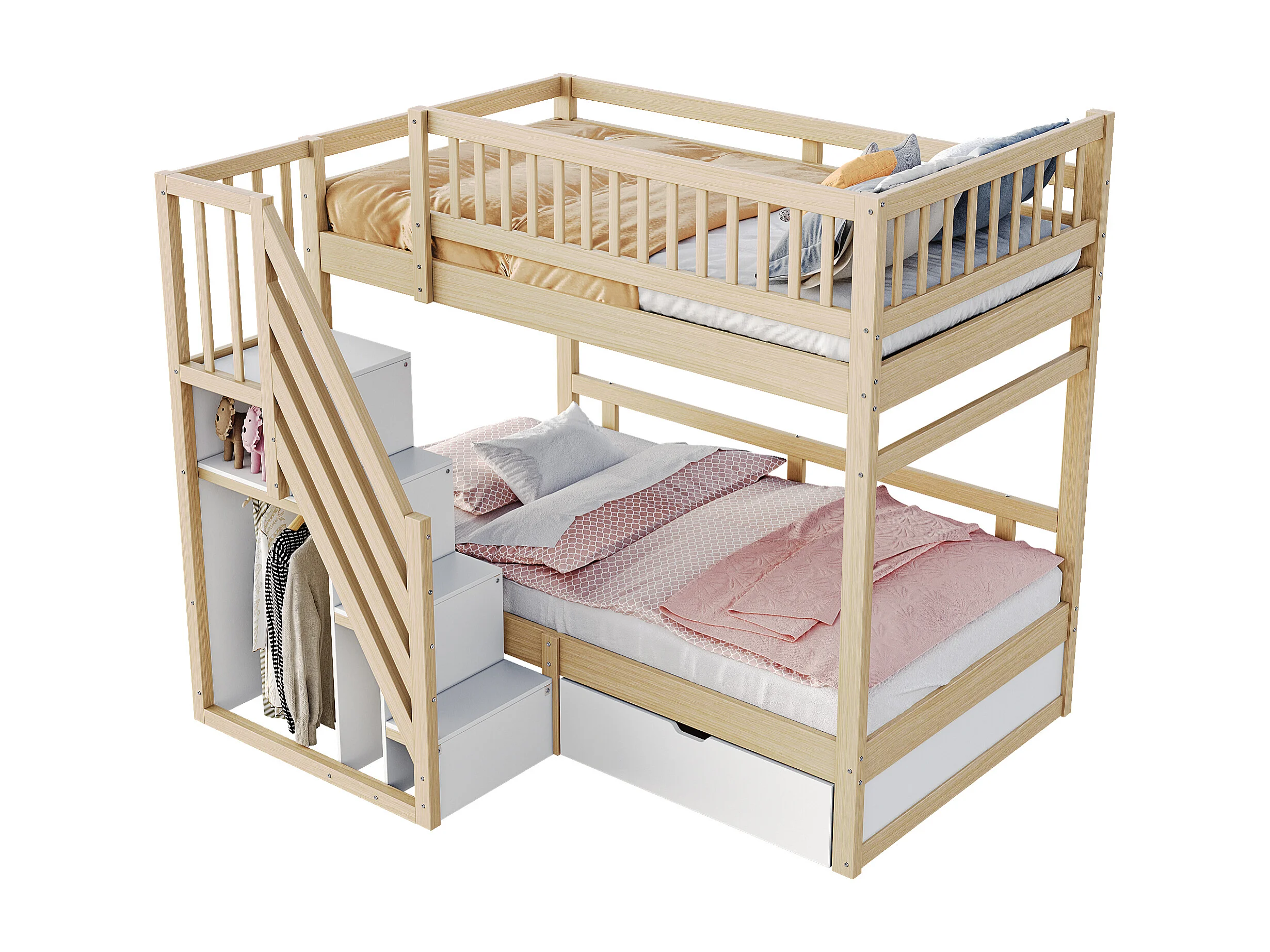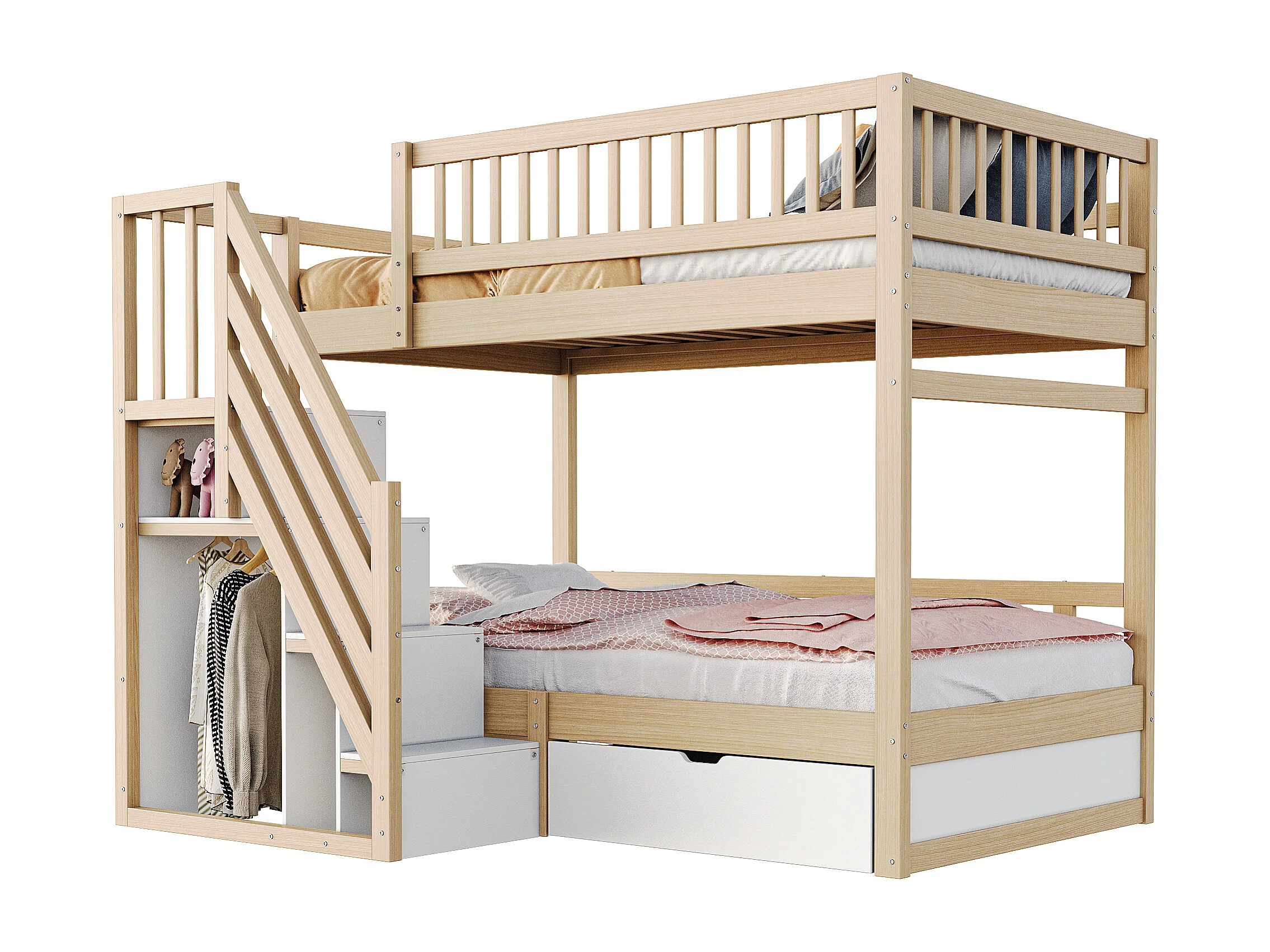 Lit mezzanine 90x200 cm, bois massif, barrières hautes, lattenrost, échelle sécurisée avec rangement, tiroirs, lit junior, bois naturel