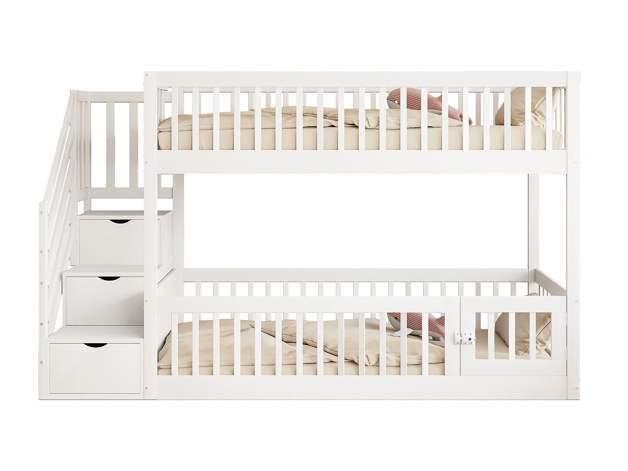 Lit mezzanine 90x200 cm, bois massif, échelle sécurisée, tiroirs de rangement, lit simple, lit junior, espace de rangement, blanc