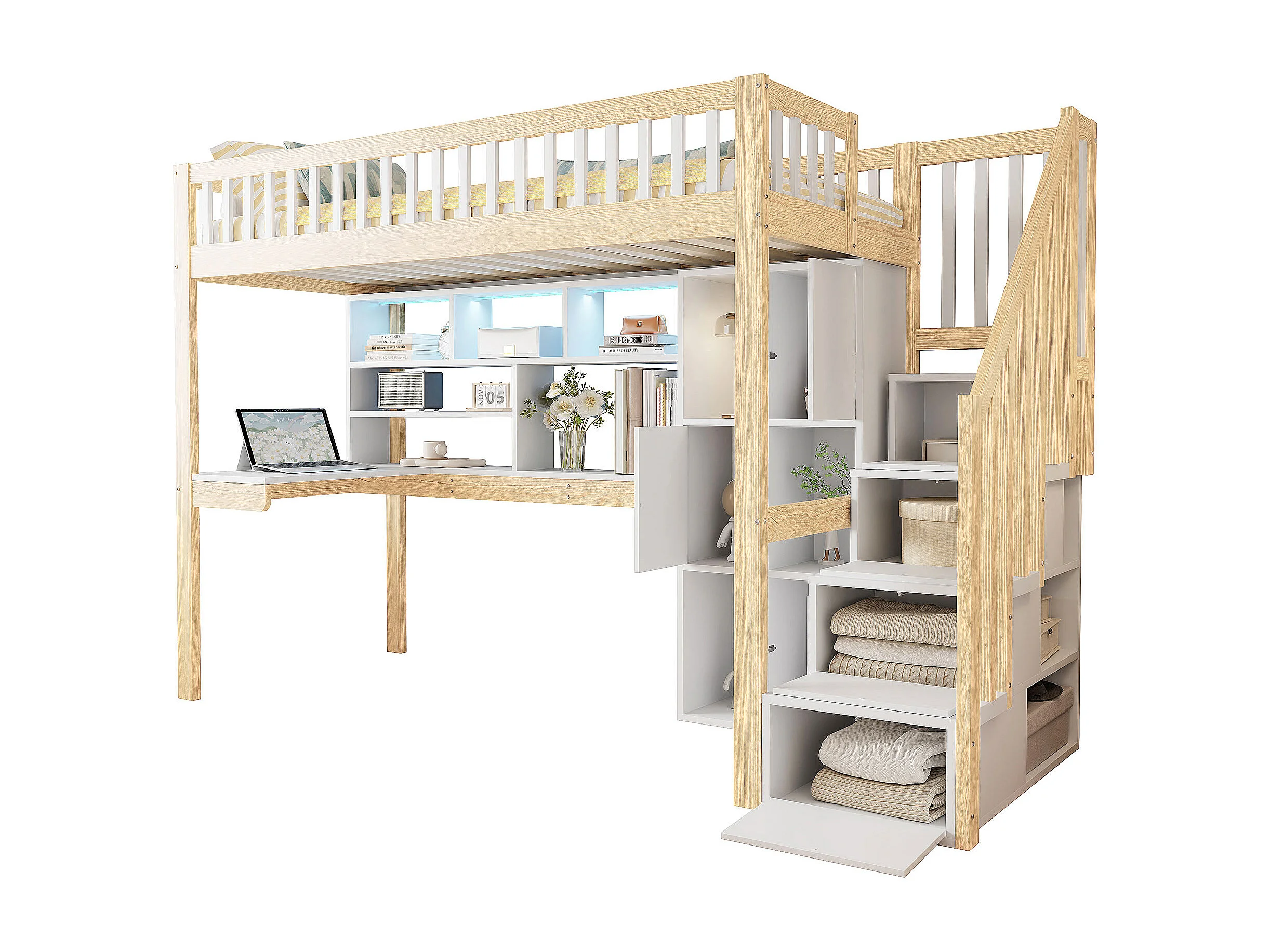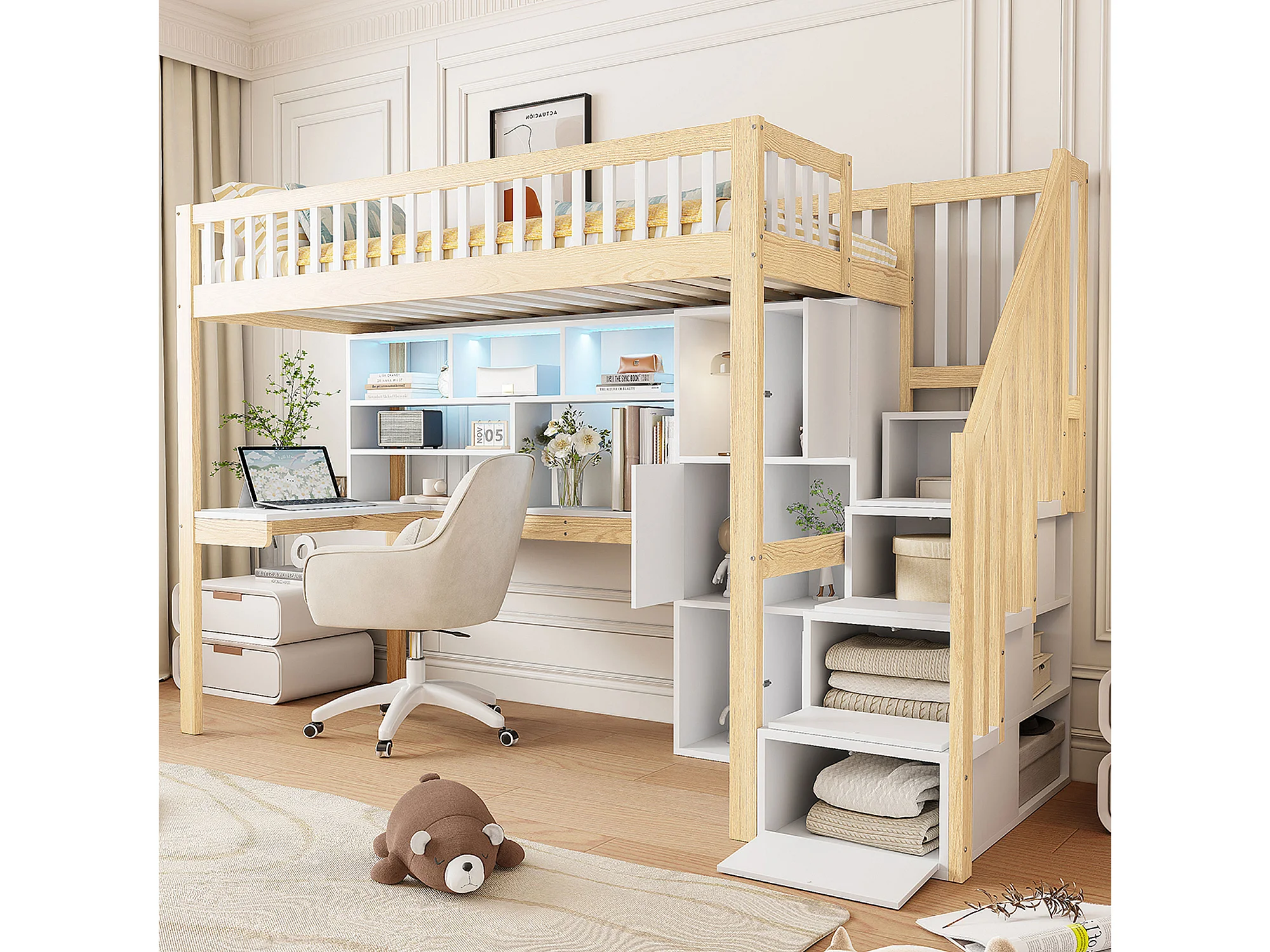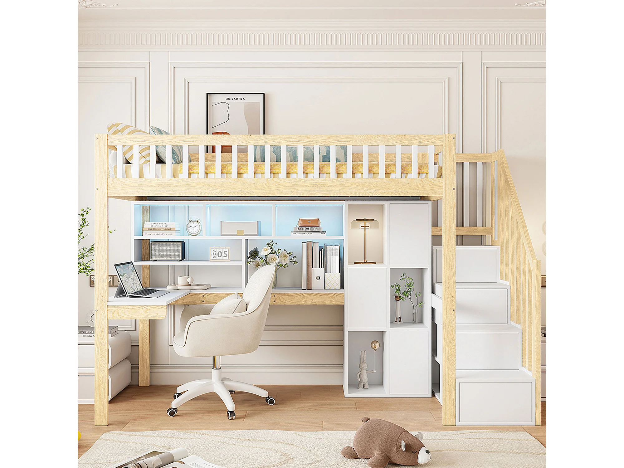 Lit mezzanine 90x200 cm en bois blanc et naturel, avec LED, bureau, étagères, rangements ouverts et échelle intégrée