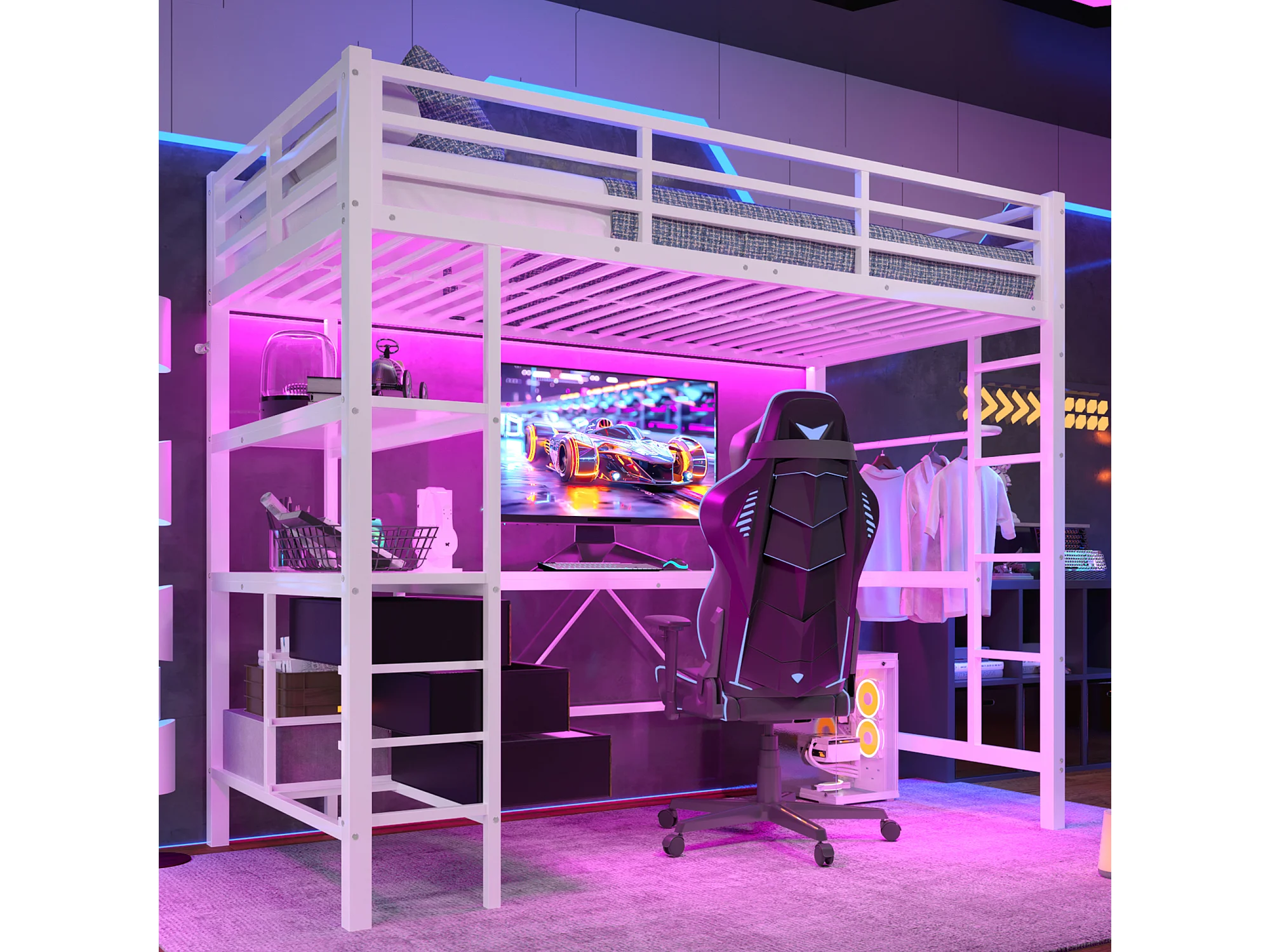 Lit mezzanine 90x200 cm en métal blanc, avec LED, bureau, 3 tiroirs, étagères, prise USB, garde-corps et escalier intégré