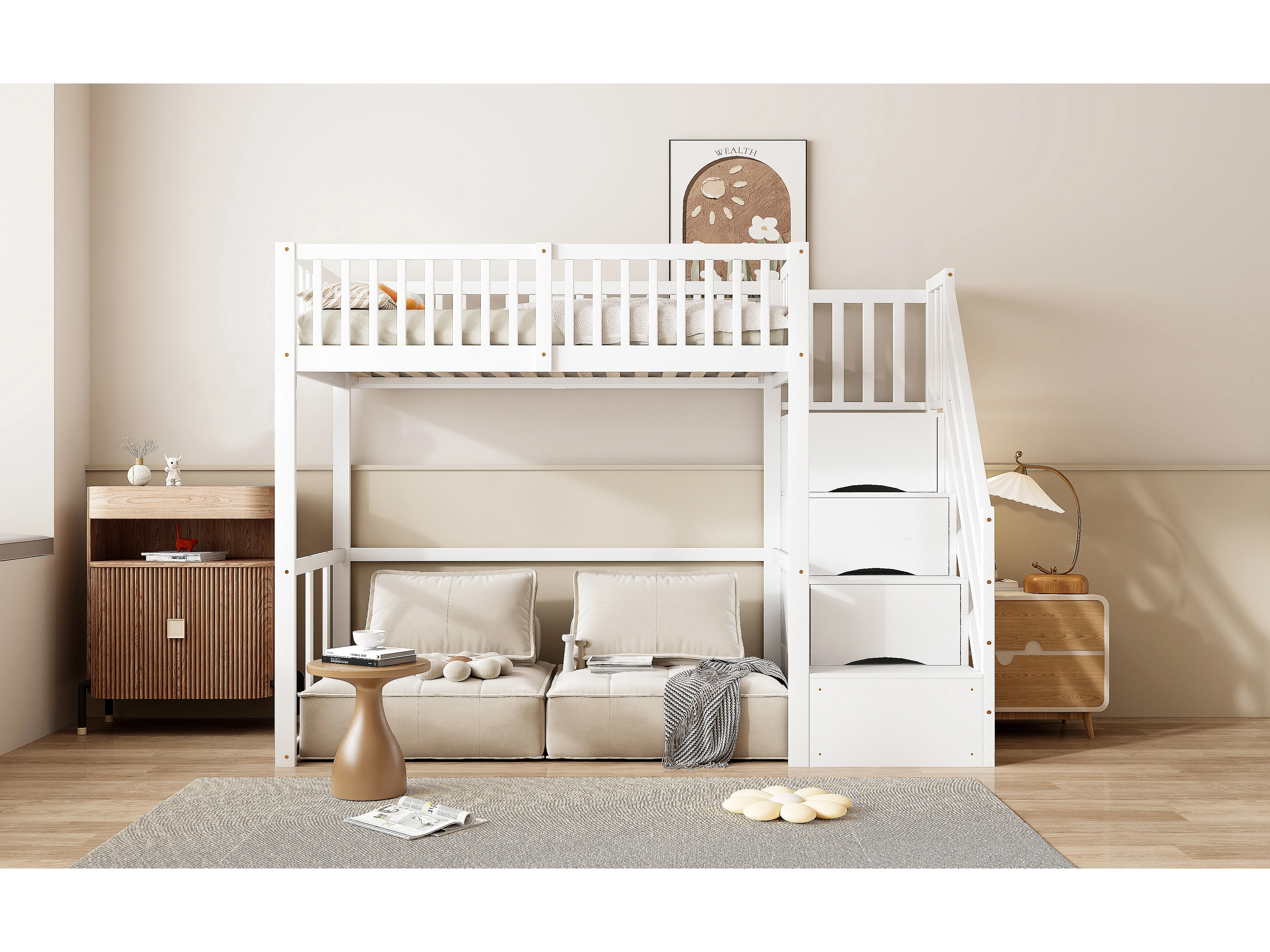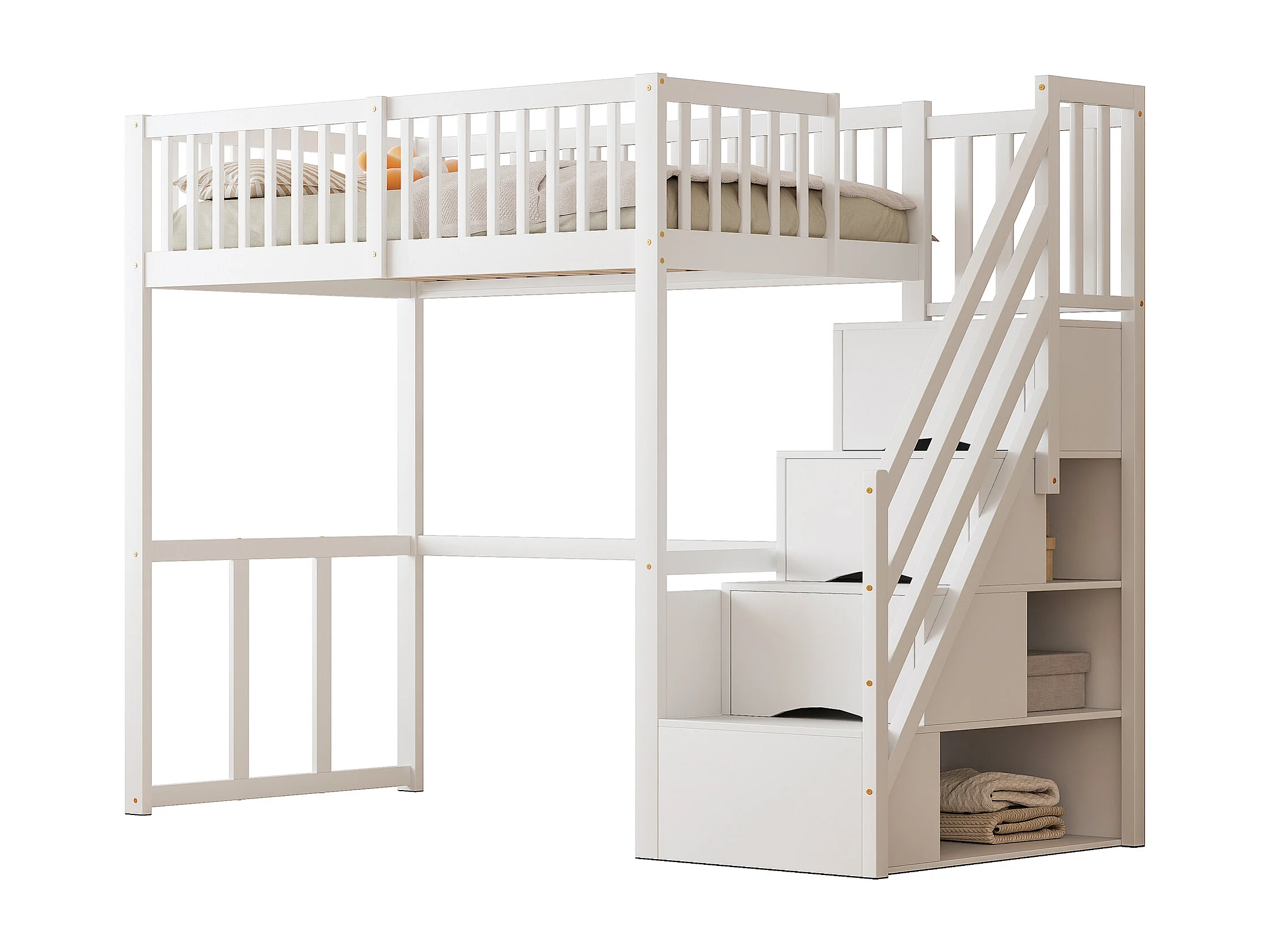 Lit mezzanine 90x200 cm en pin massif blanc avec échelle de rangement sécurisée pour enfants et ados