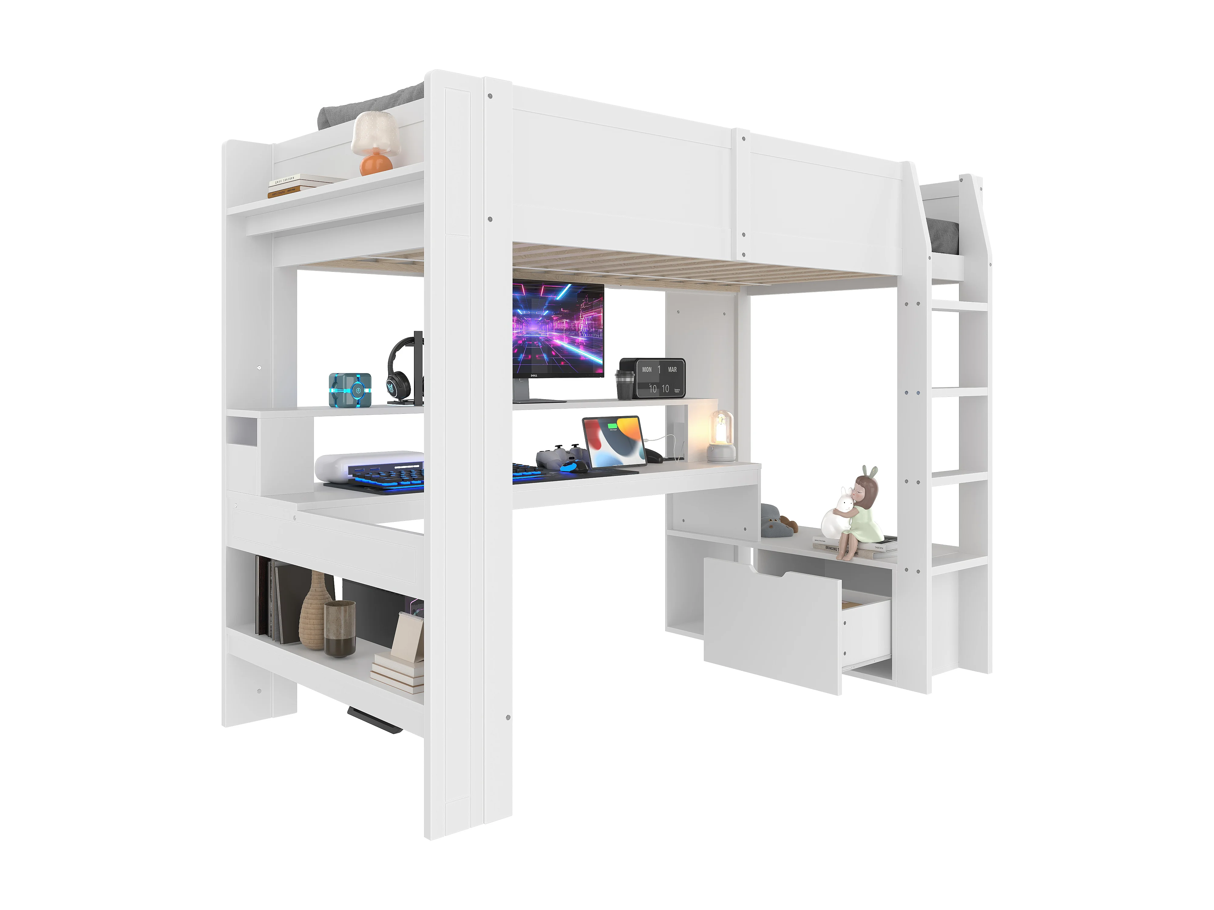 Lit mezzanine 90x200 cm, lit gaming avec bureau, LED, tiroir, étagères, sans matelas, Blanc