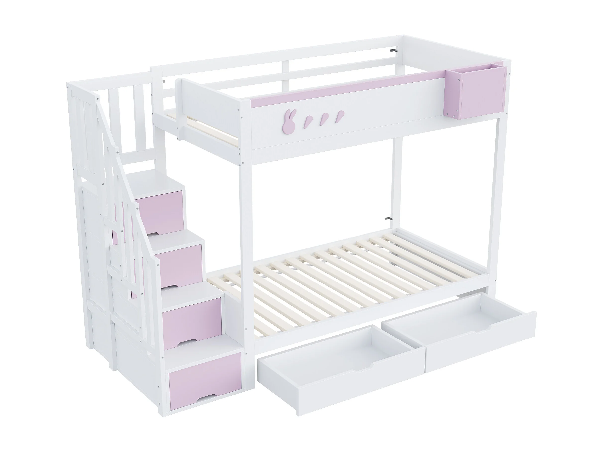 Lit mezzanine 90x200 cm, motifs lapin et carotte, étagère amovible, échelle sécurisée, tiroirs, lattenrost, lit double, blanc + rose