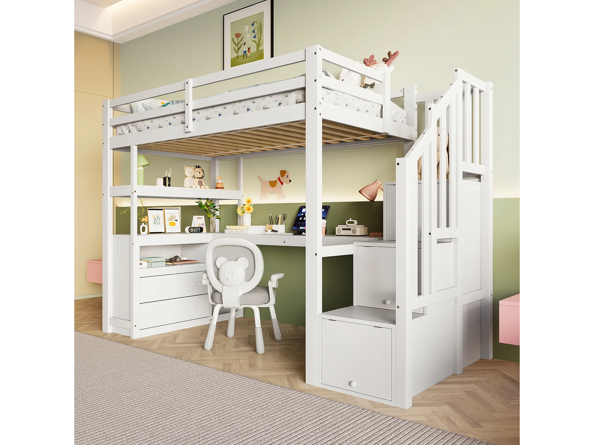 Lit mezzanine 90x200 cm pour enfant, lit avec bureau, échelle et deux tiroirs, Blanc