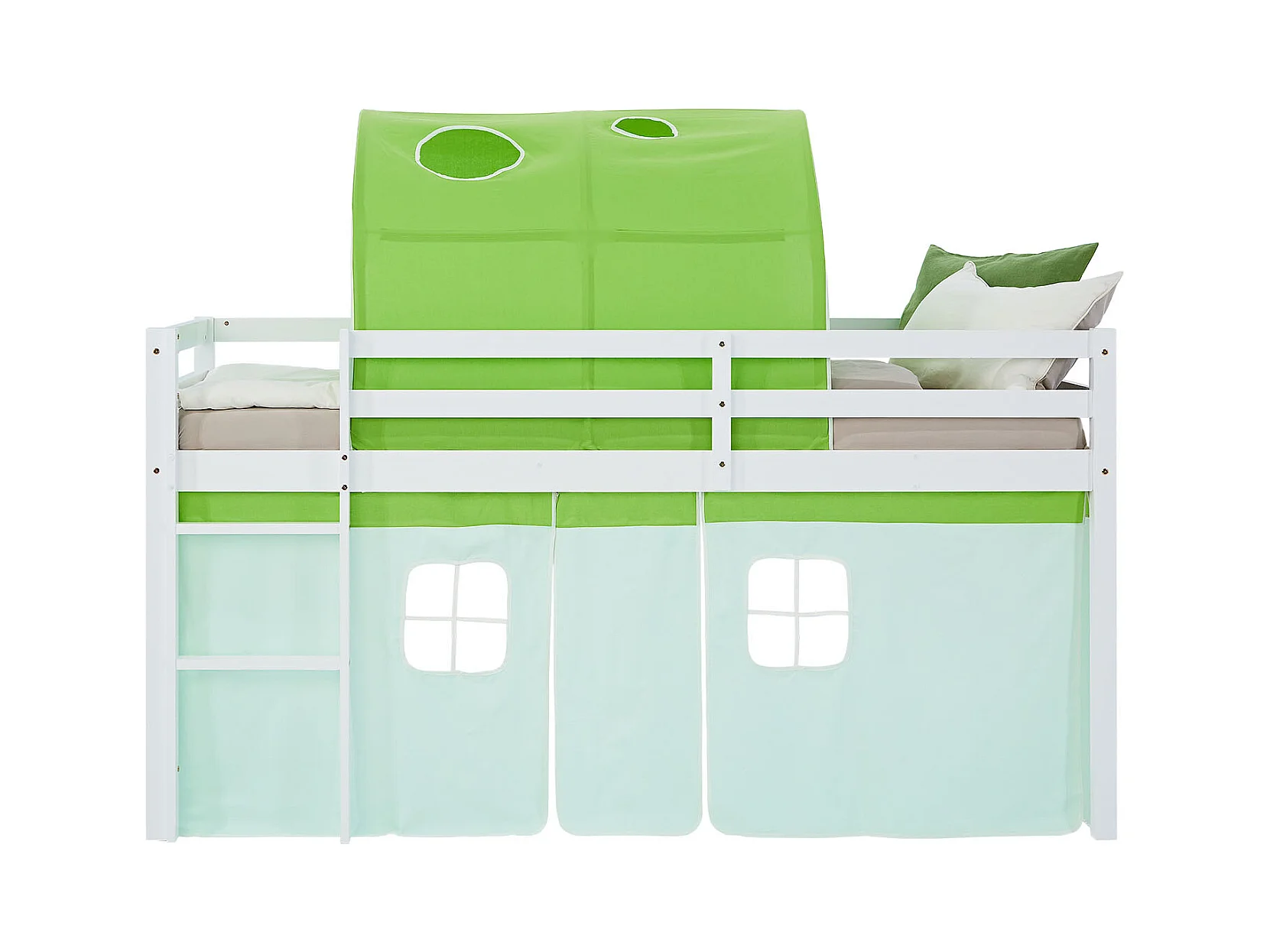 Lit mezzanine 90x200 cm vert en pin massif avec rideau tunnel