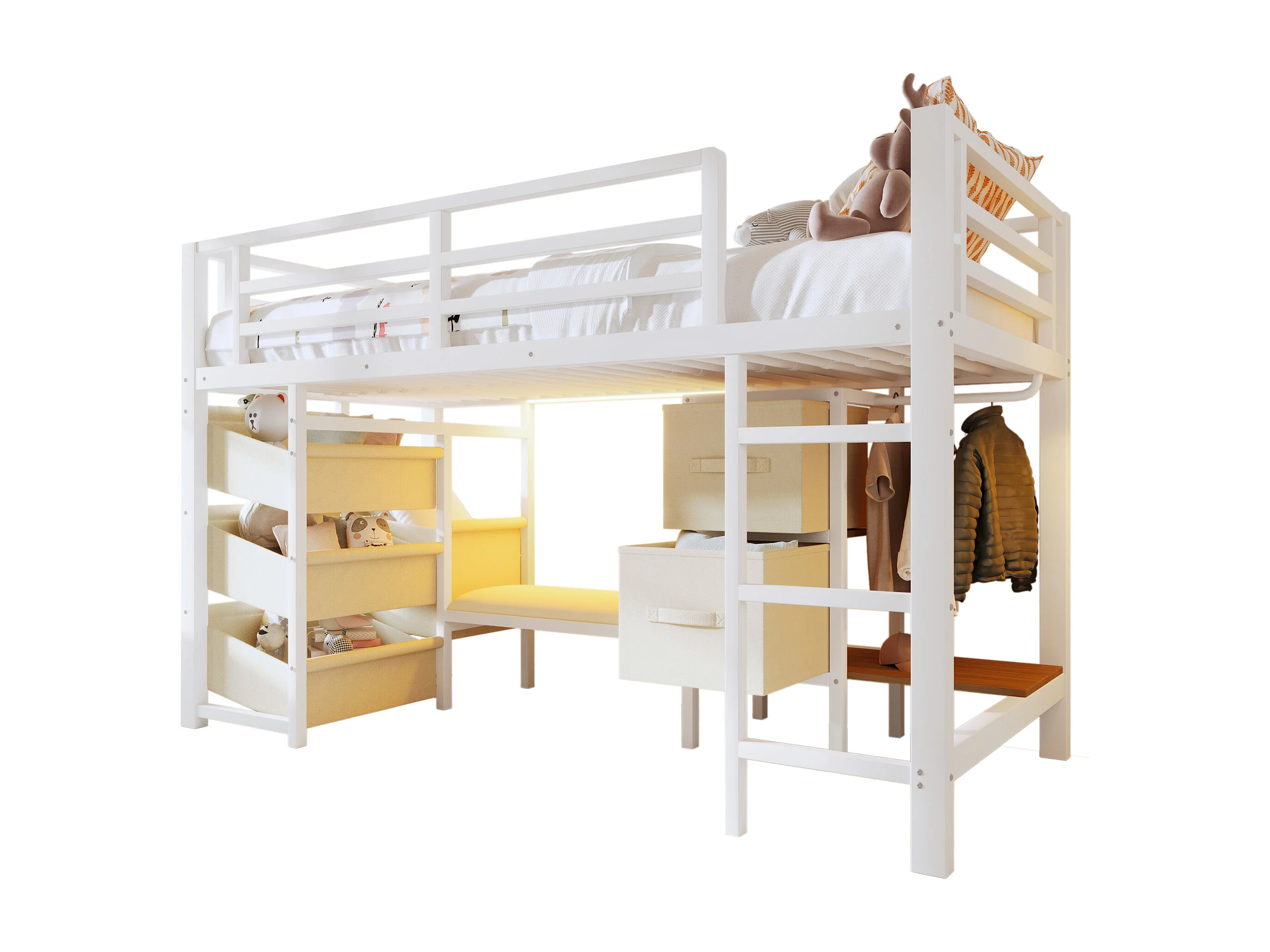 Lit mezzanine 90x200cm - avec 2 tiroirs - avec poches de rangement en tissu - avec lumière LED - blanc (matelas non inclus)