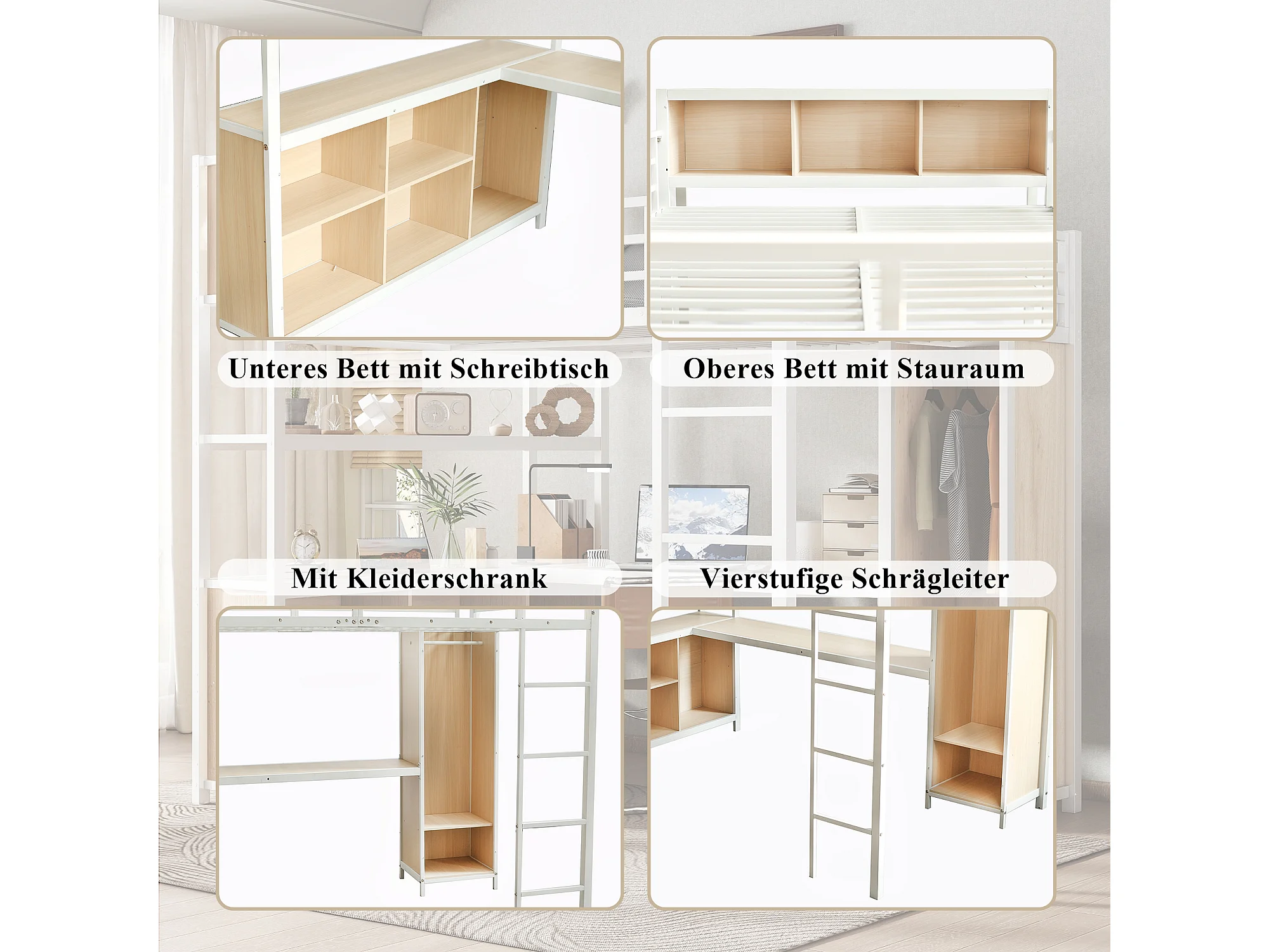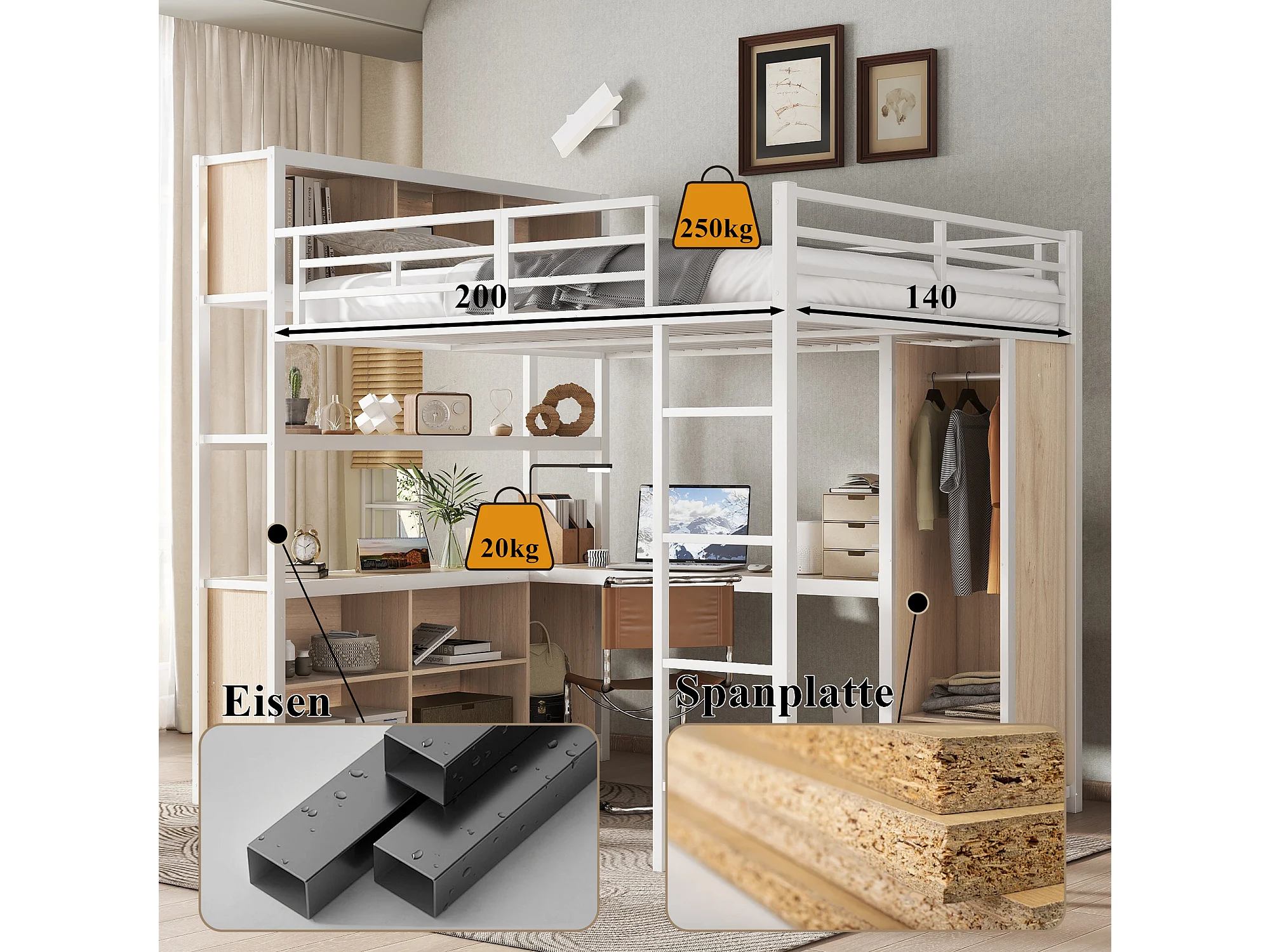 Lit mezzanine en fer - 140 x 200 cm - avec étagère de rangement + bureau + penderie - fer + aggloméré - blanc