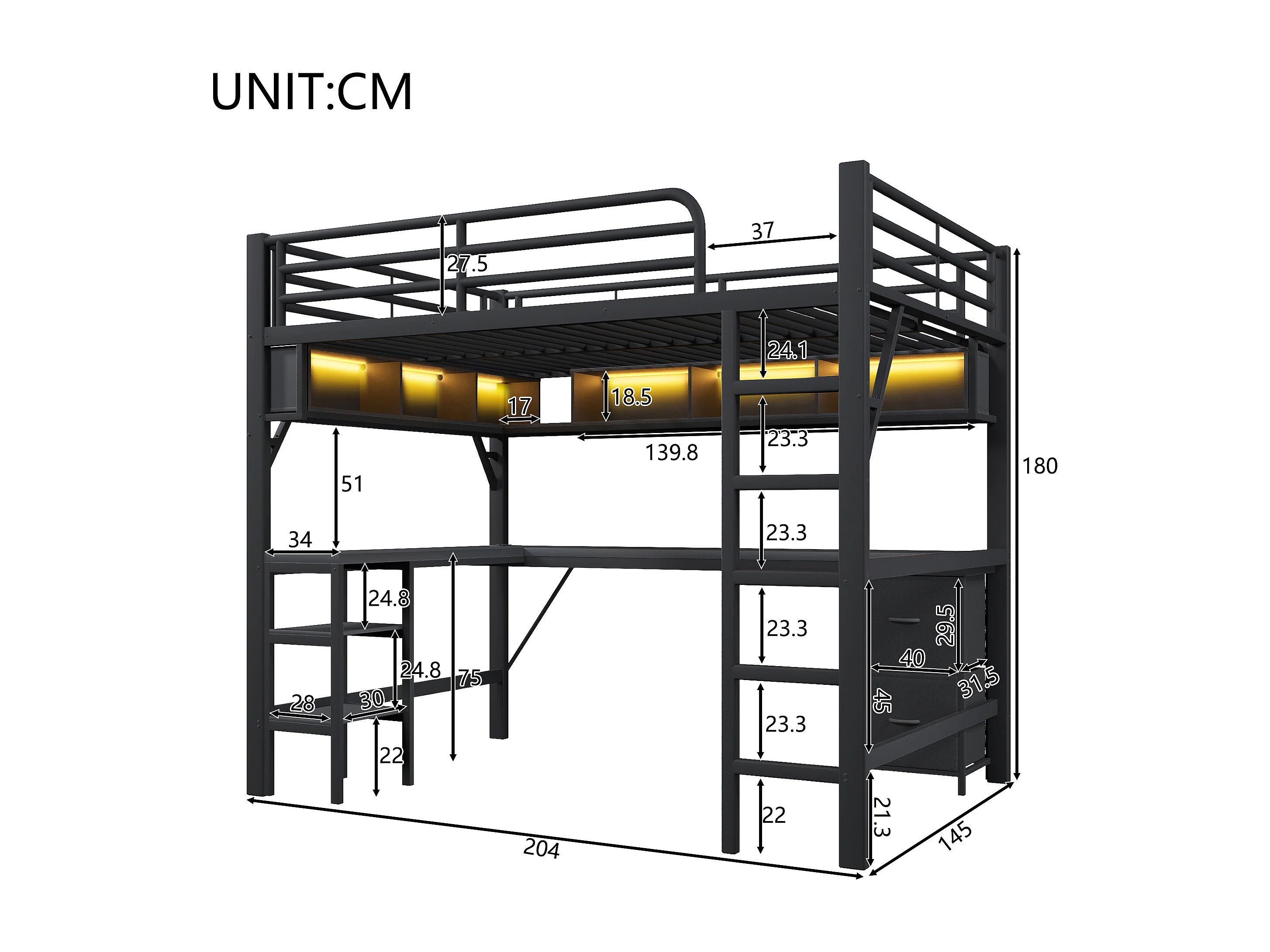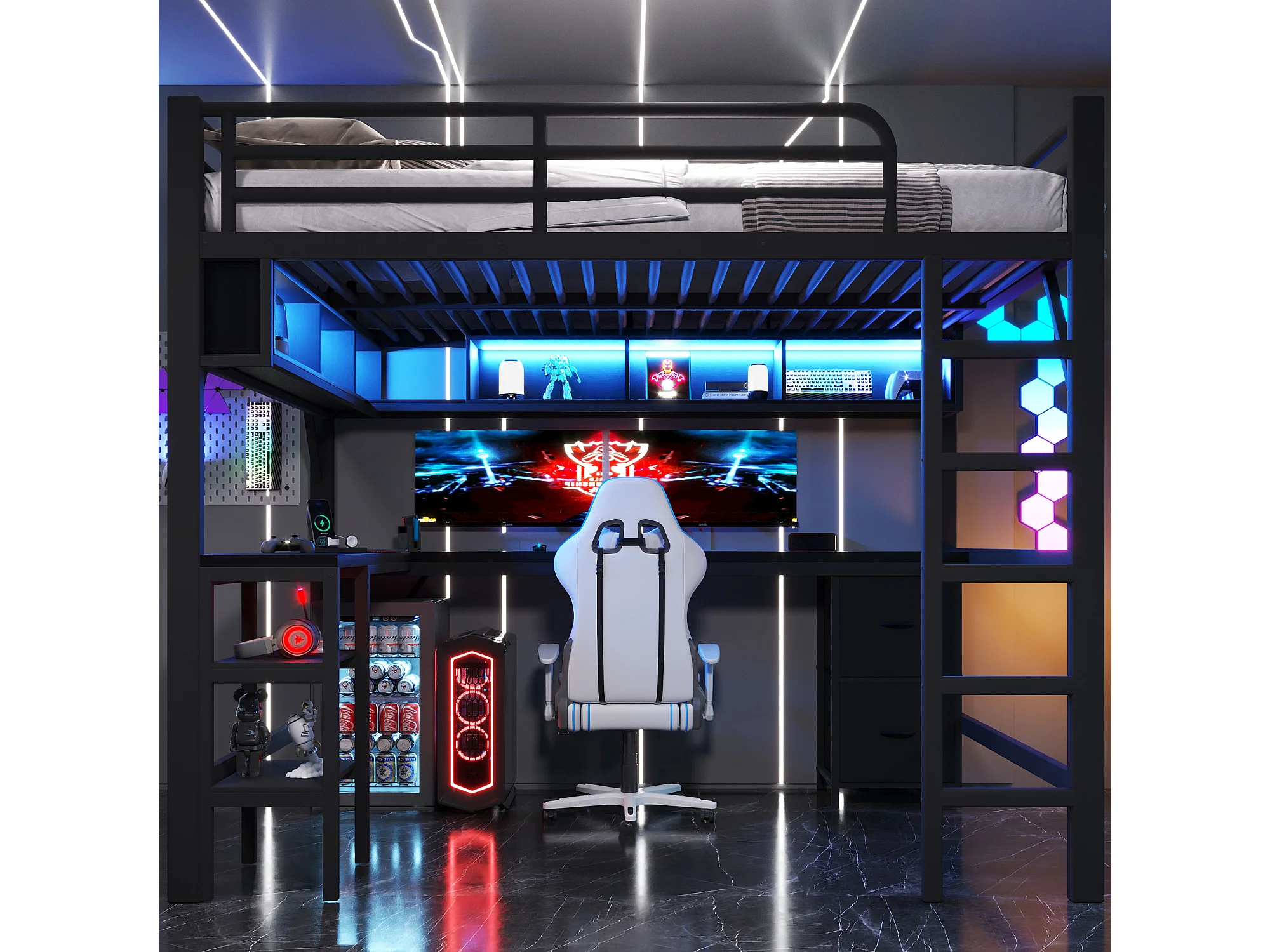Lit mezzanine en métal pour enfant - 140 x 200 cm - avec bibliothèque + bureau + armoire + USB + Leds - noir