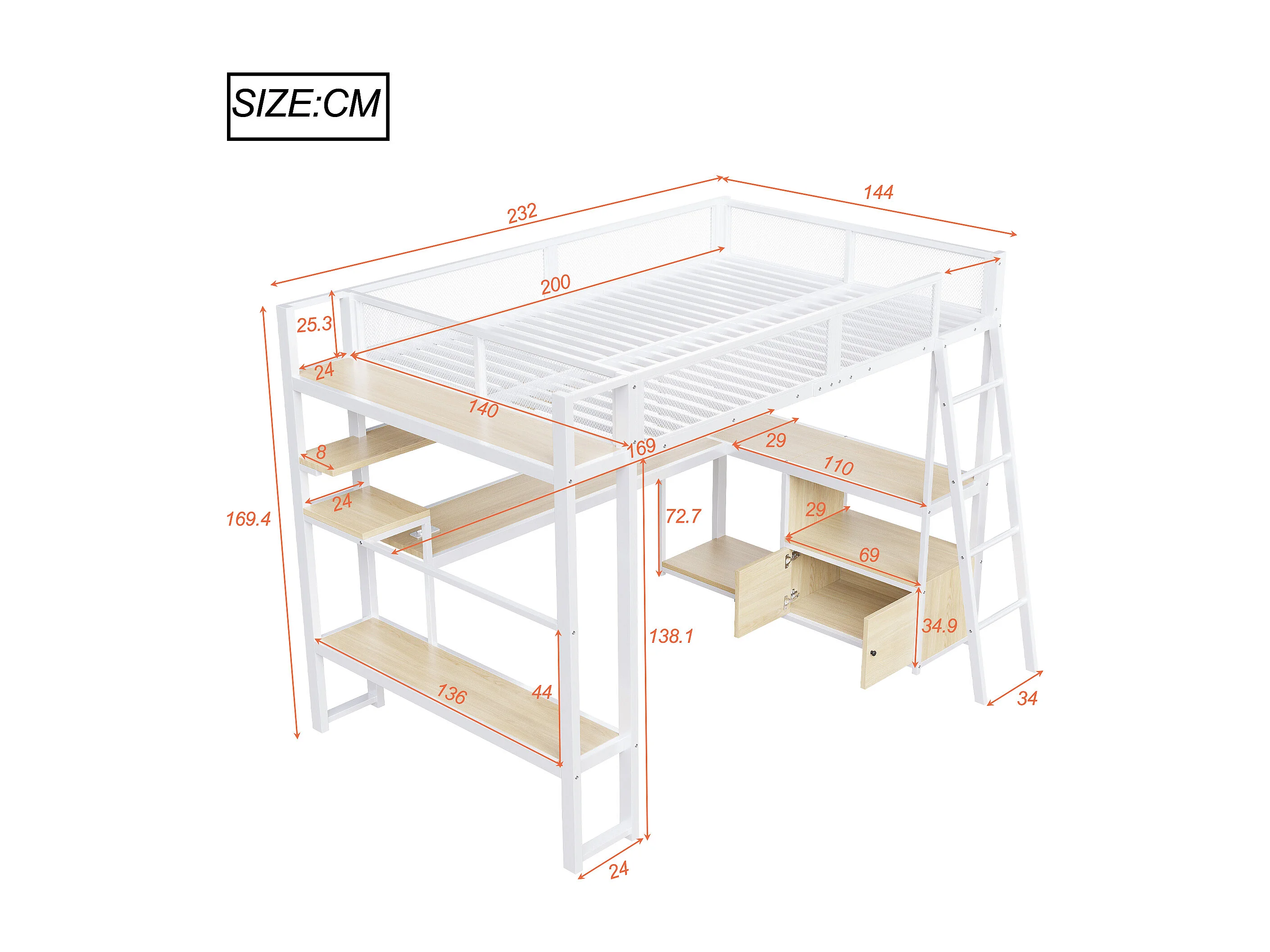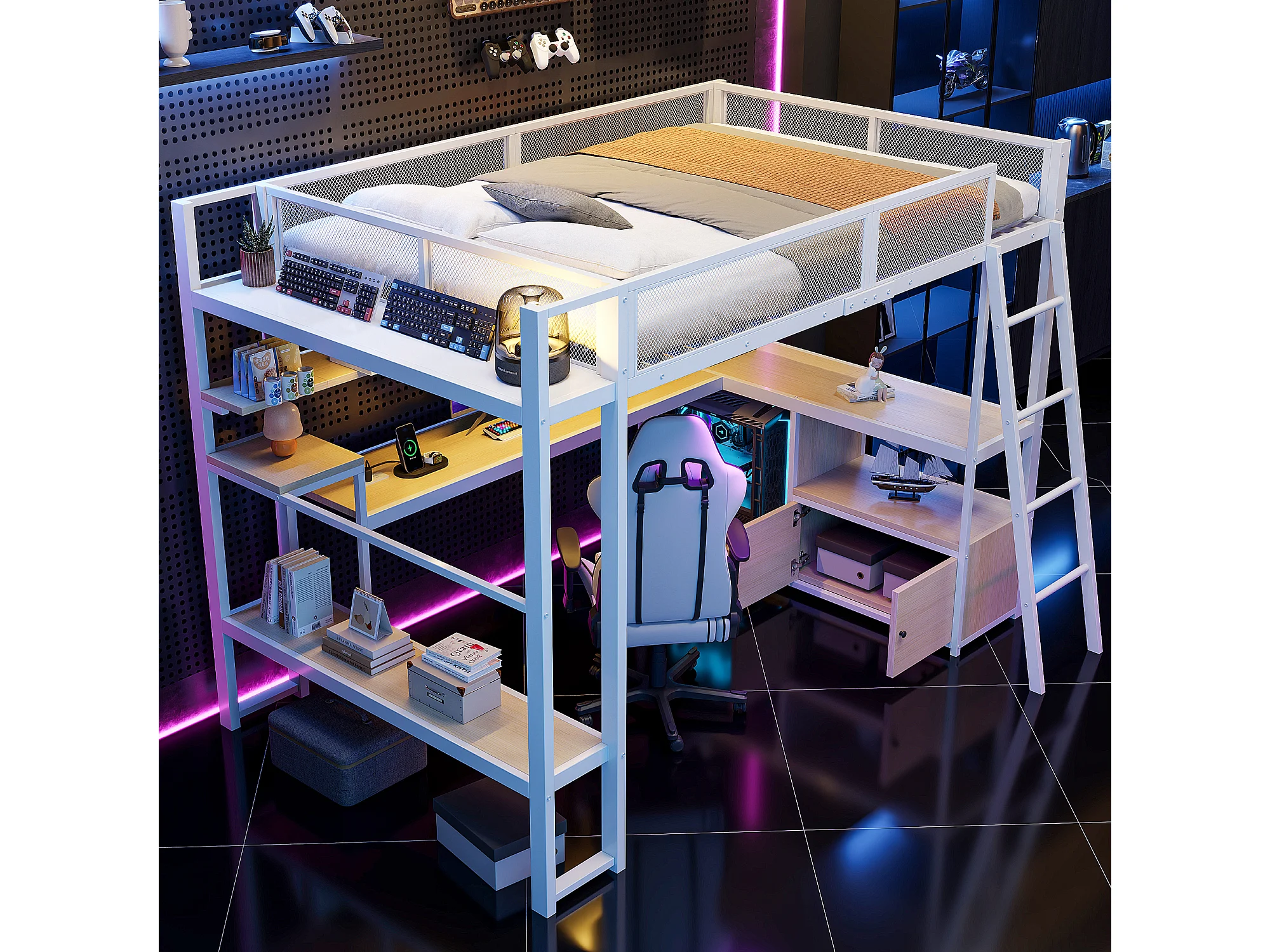 Lit mezzanine en métal pour enfant - 140 x 200 cm - avec bureau intégré + Leds + rangements - blanc