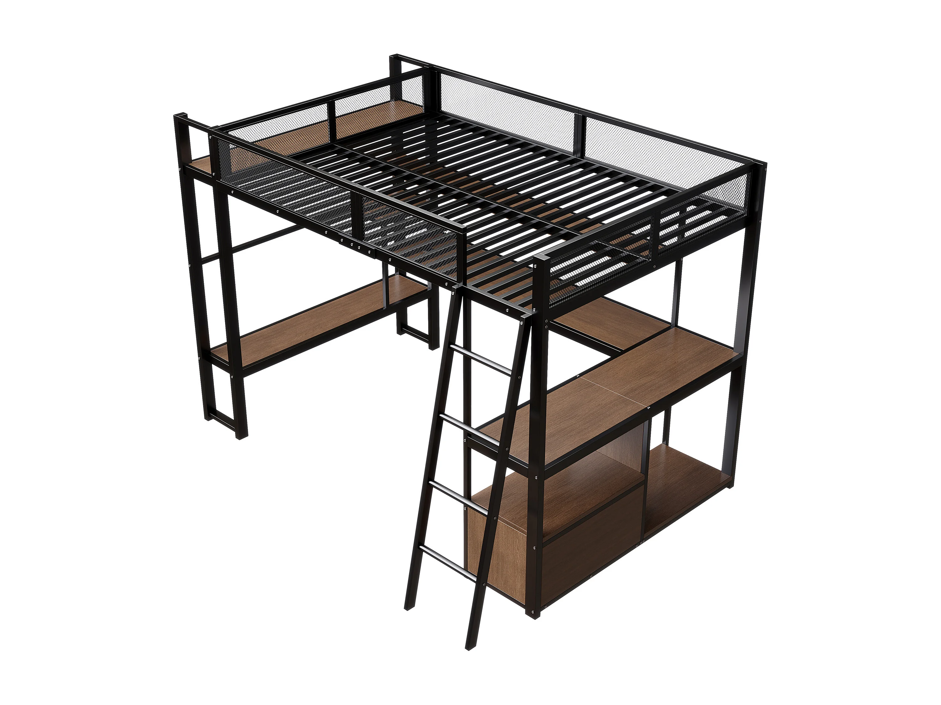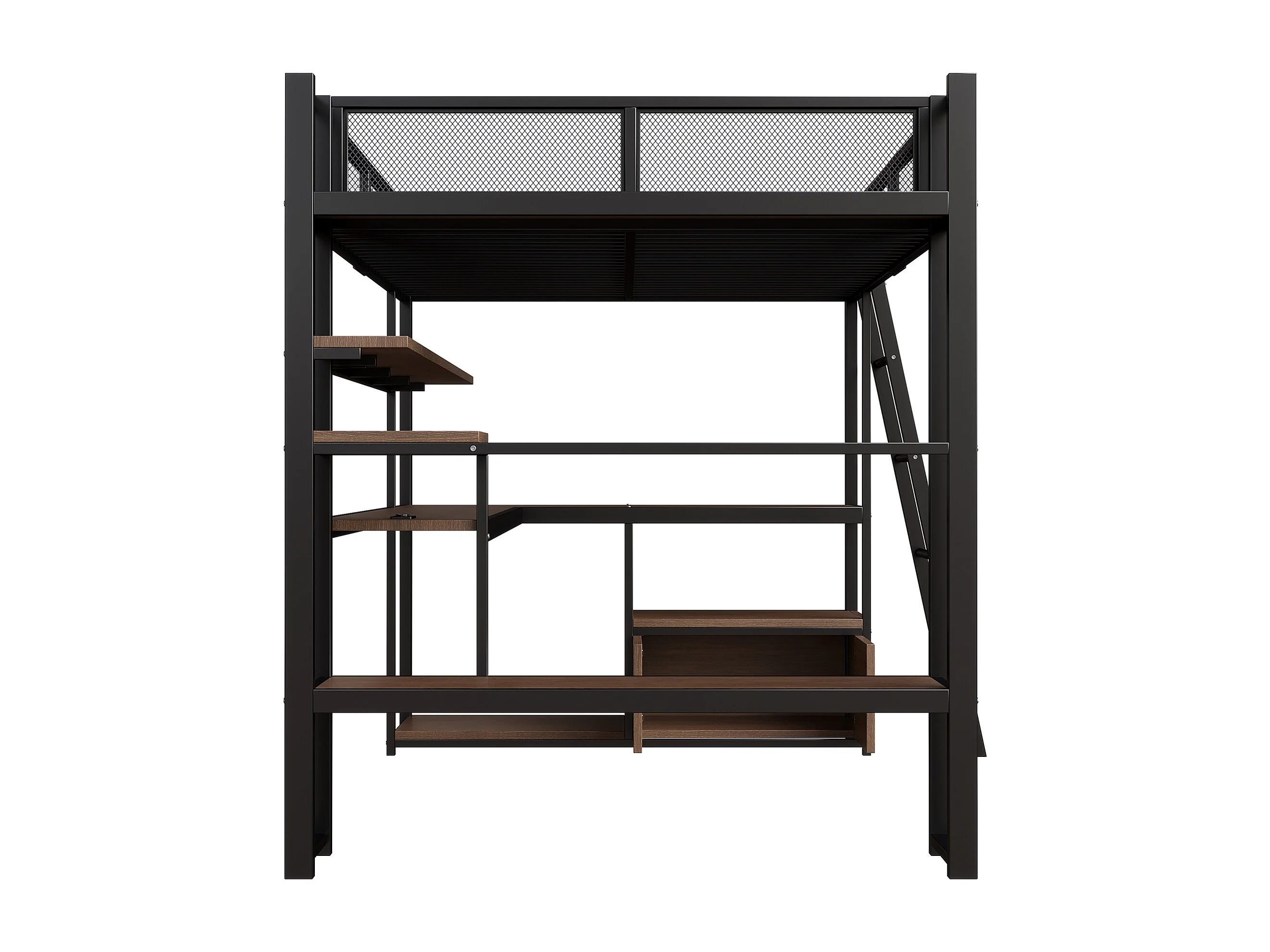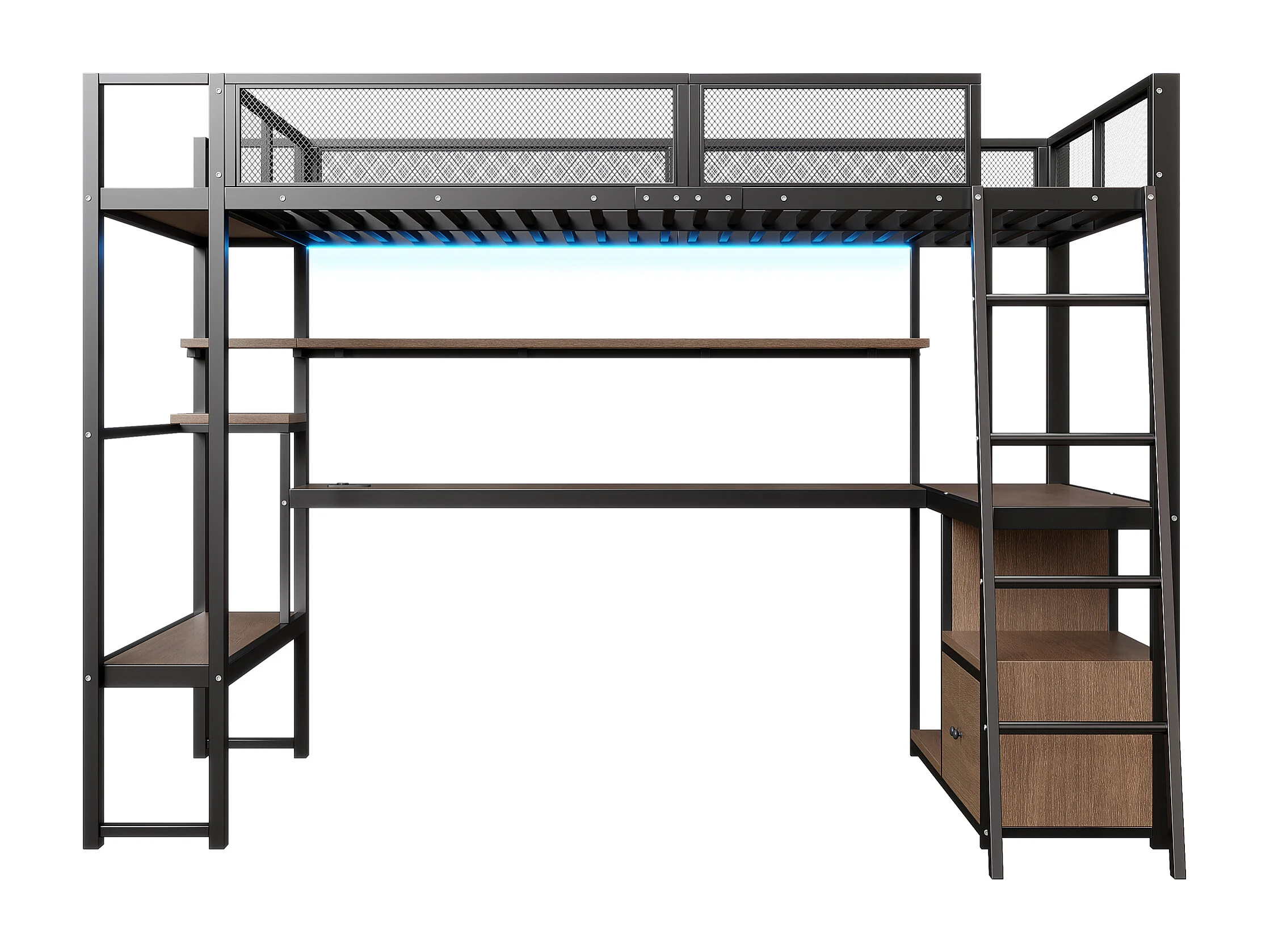 Lit mezzanine en métal pour enfant - 140 x 200 cm - avec bureau intégré + Leds + rangements - noir