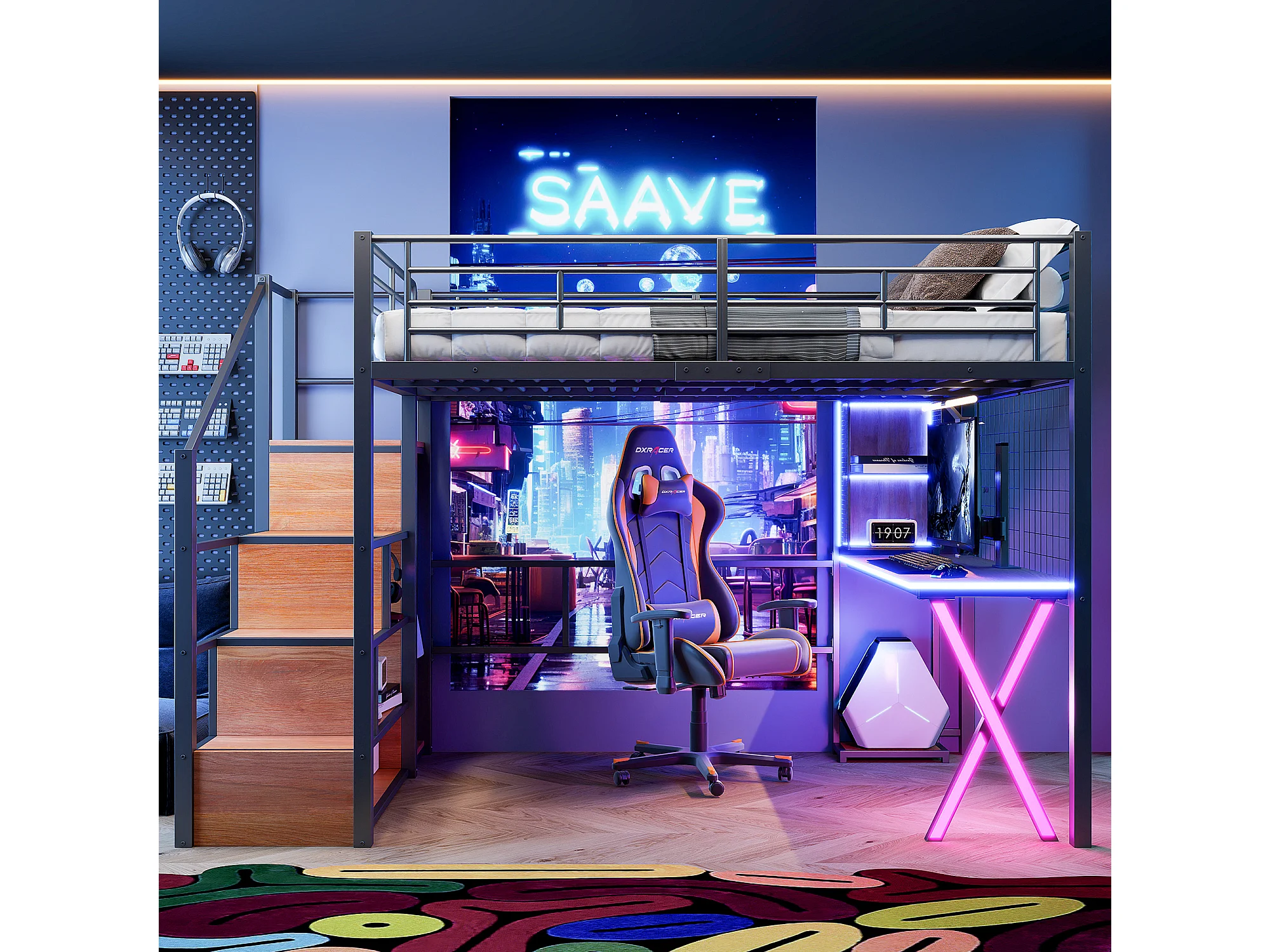 Lit Mezzanine Enfant 140×200 cm - LED - Escalier de Rangement - Bureau - Penderie - Métal Noir, sans matelas