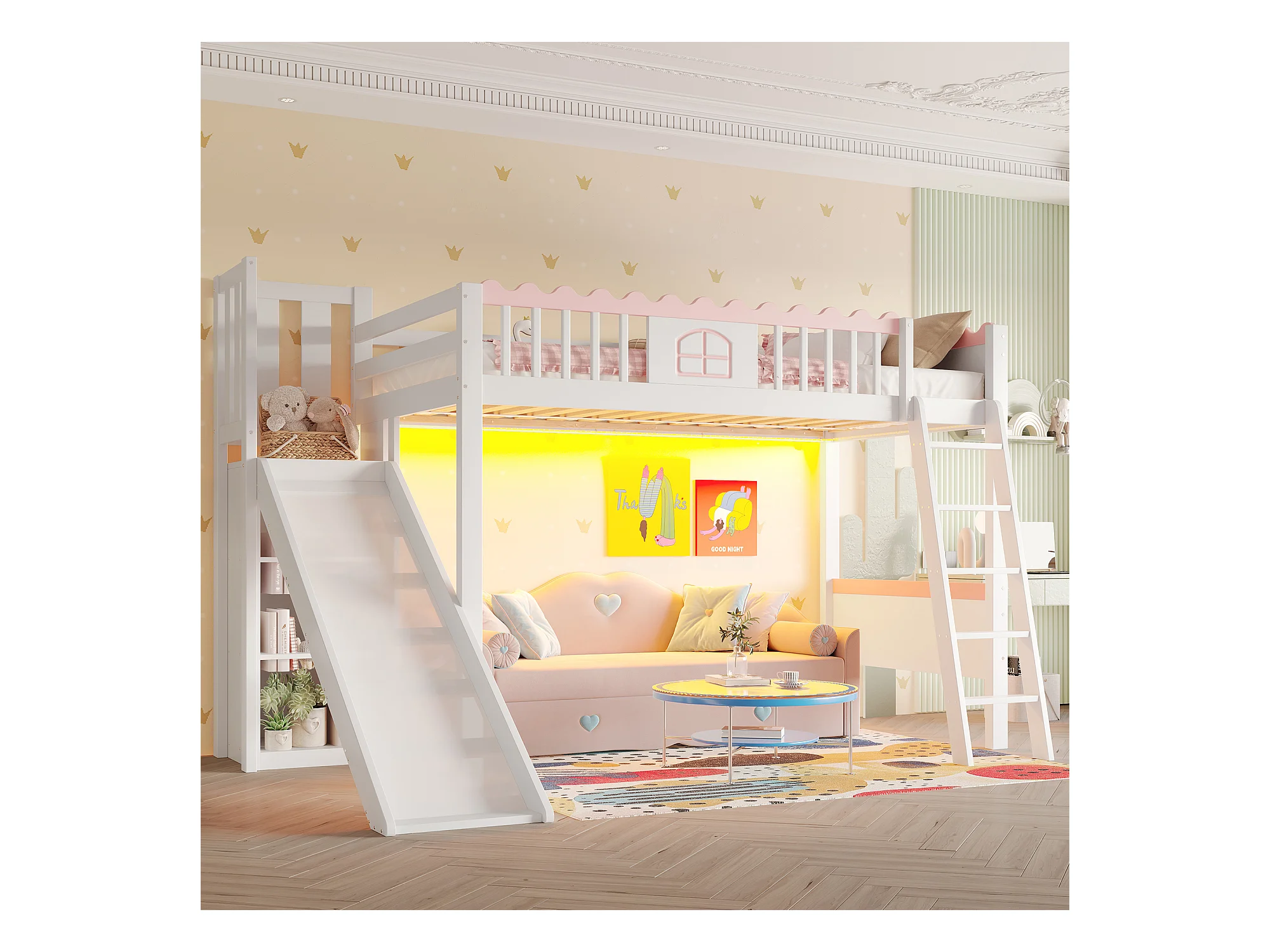 Lit mezzanine enfant 90x200 cm en pin, avec LED, étagères et toboggan, certifié EN747, blanc