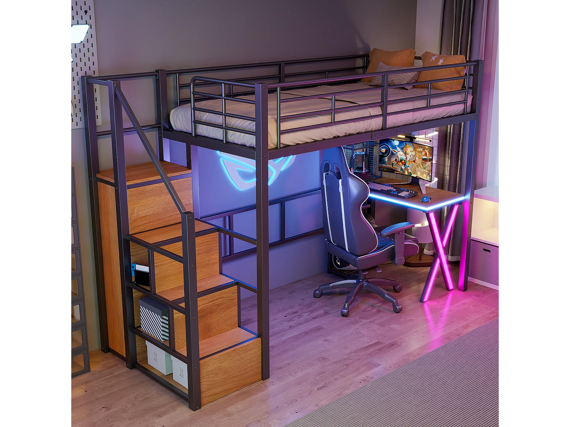 Lit Mezzanine Enfant 90×200 cm - LED - Escalier de Rangement - Bureau - Penderie - Métal Noir, sans matelas