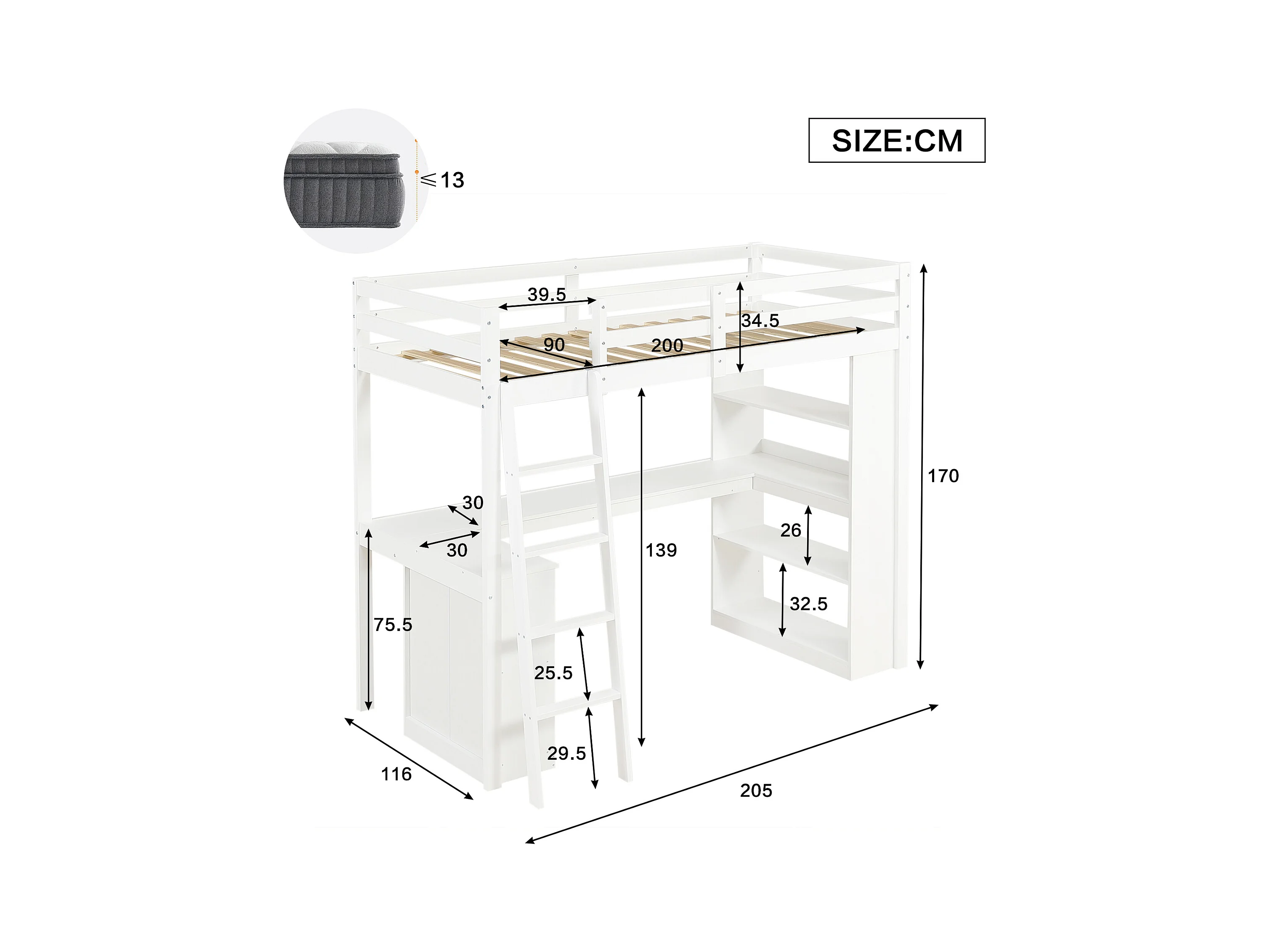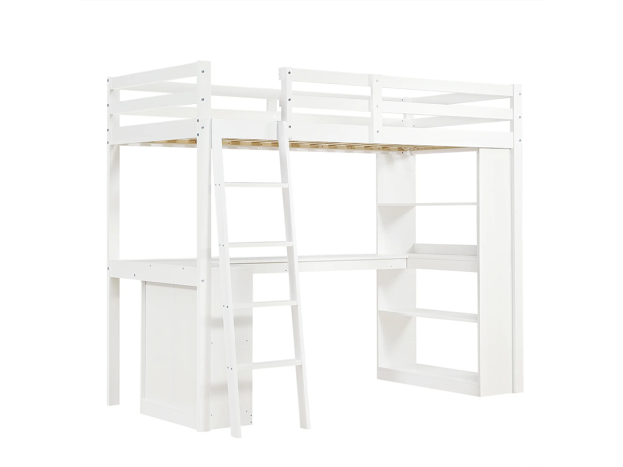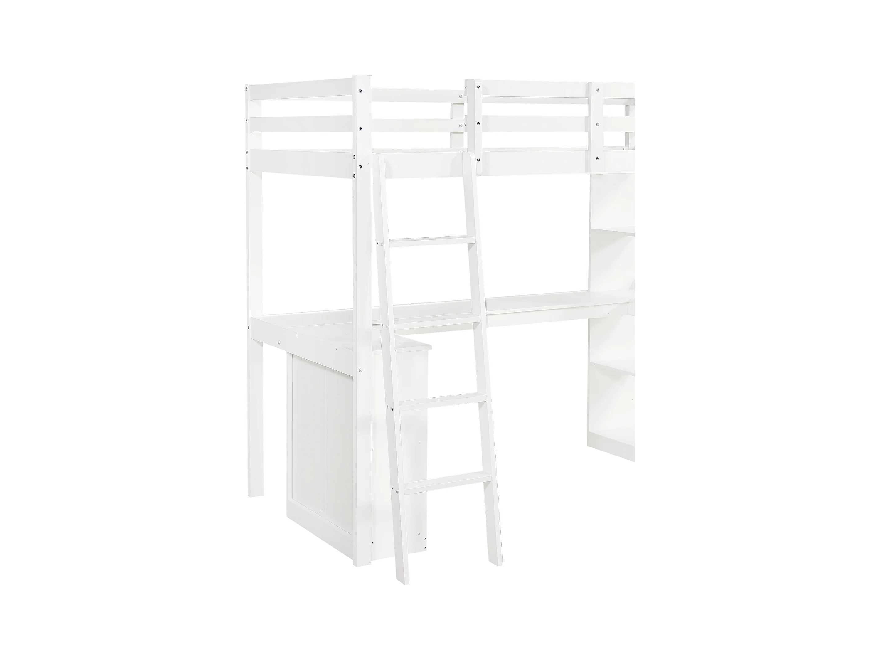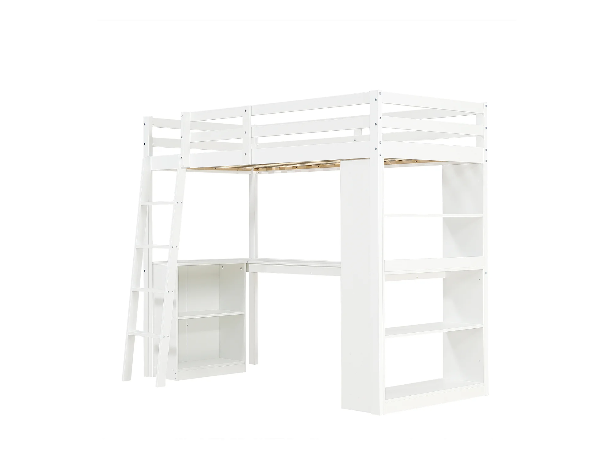 Lit mezzanine enfant blanc en bois avec étagères de rangement, table et échelle, tissu en feutre (sans matelas)