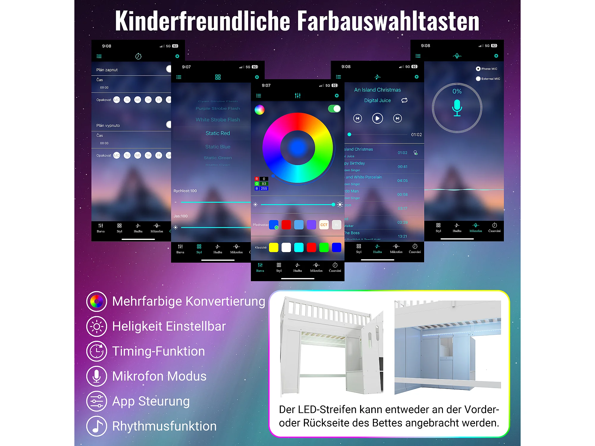 Lit mezzanine enfant 90x200cm - avec bande lumineuse LED - avec toboggan - Échelle de rangement - Blanc (Matelas non inclus)