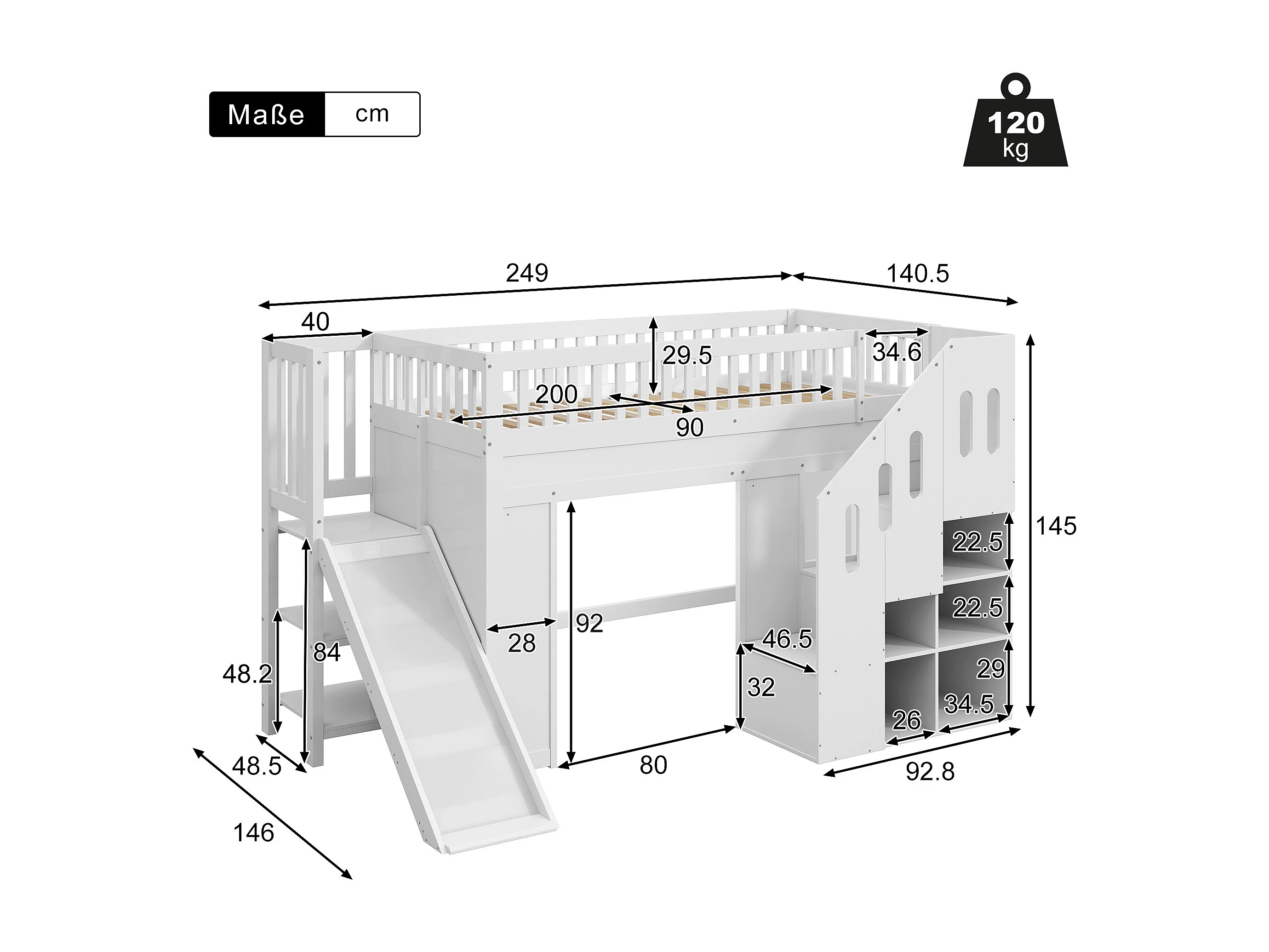 Lit mezzanine pour enfant - 90 x 200 cm - avec escalier de rangement + toboggan - bois - blanc