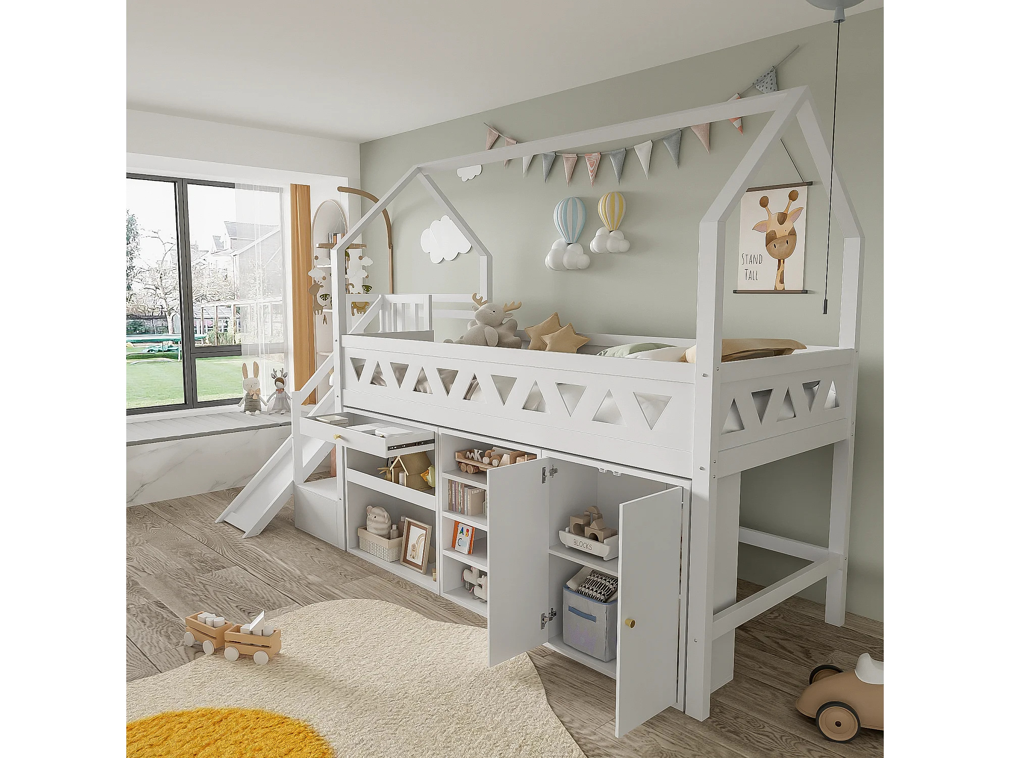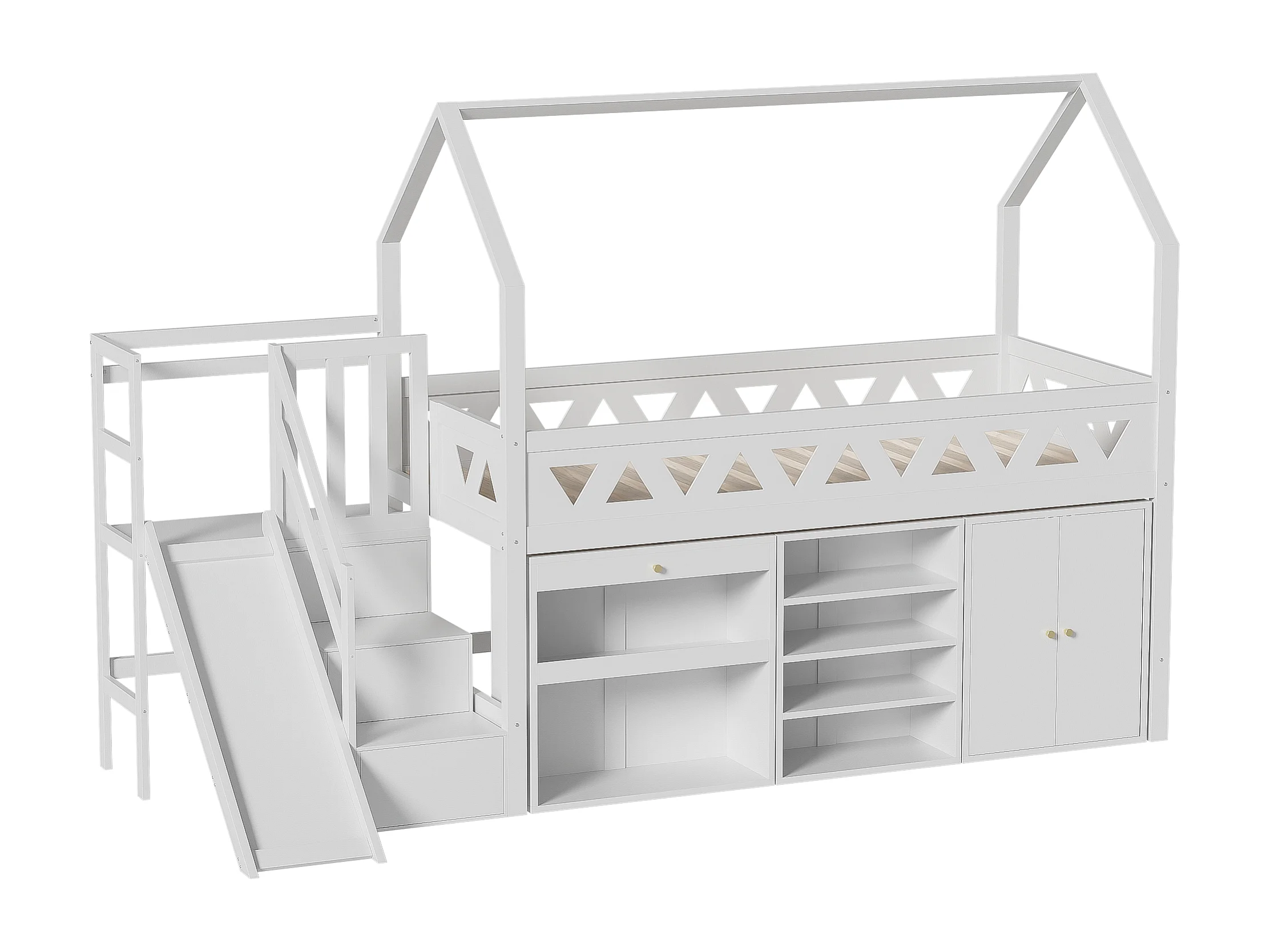 Lit mi - hauteur 90x200cm avec toboggan et rangement - Lit cabane en bois MDF - Blanc