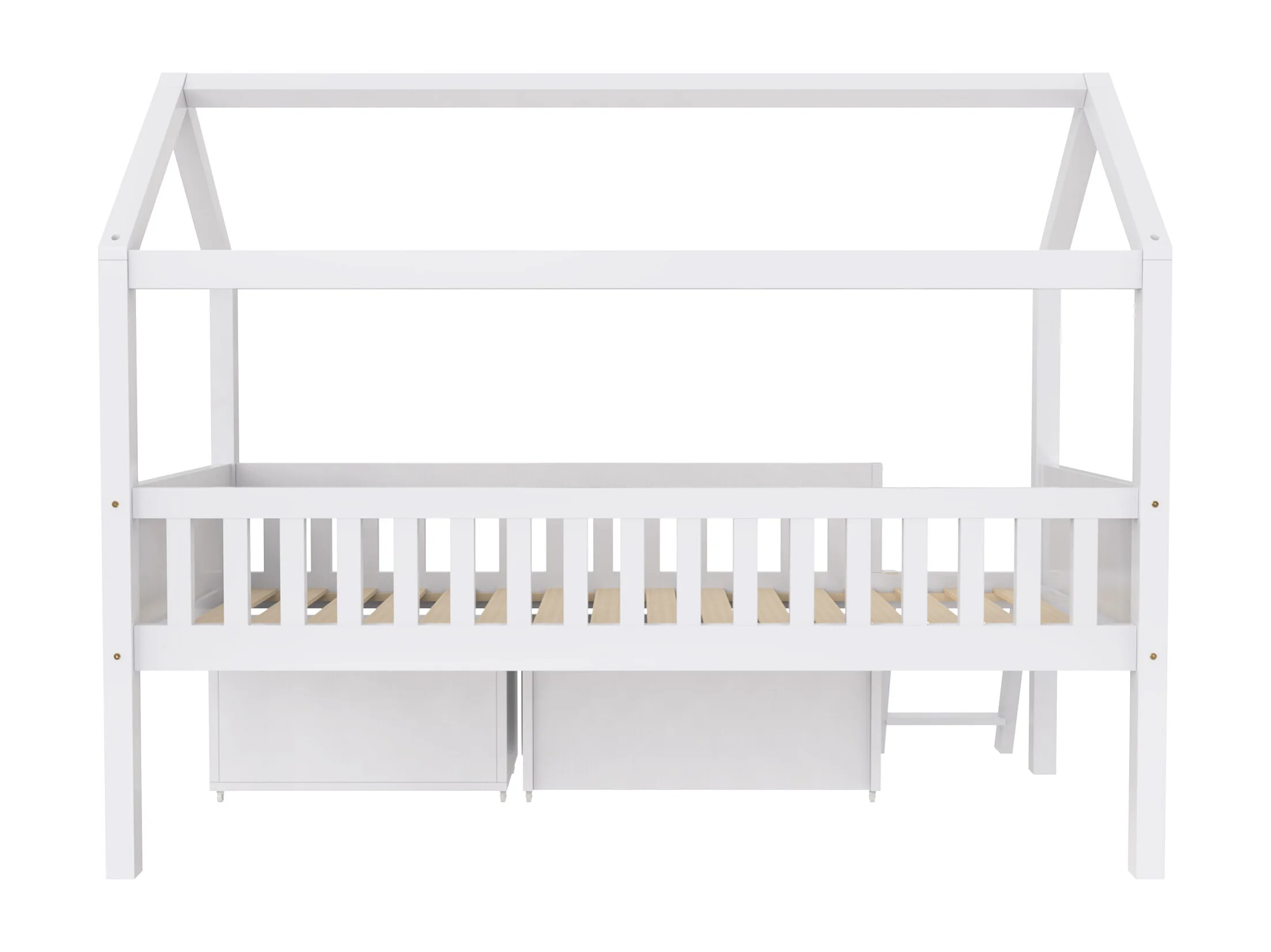Lit enfant 90x200 cm avec sommier - lit cabane avec tiroirs et rangement - bois - blanc (sans matelas)