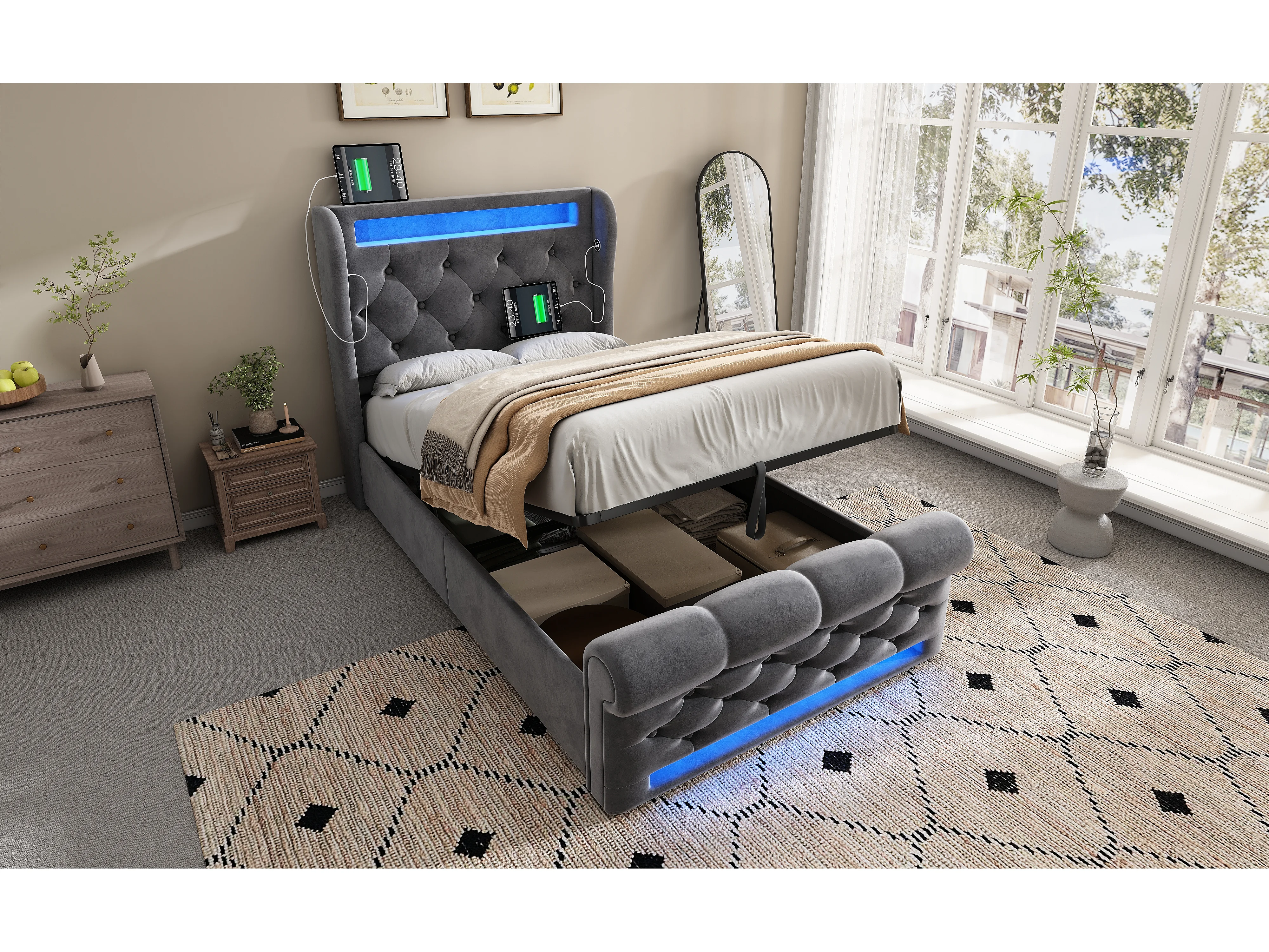 Lit moderne en velours 90x200 cm, avec éclairage LED, tête de lit de rangement et ports USB, gris