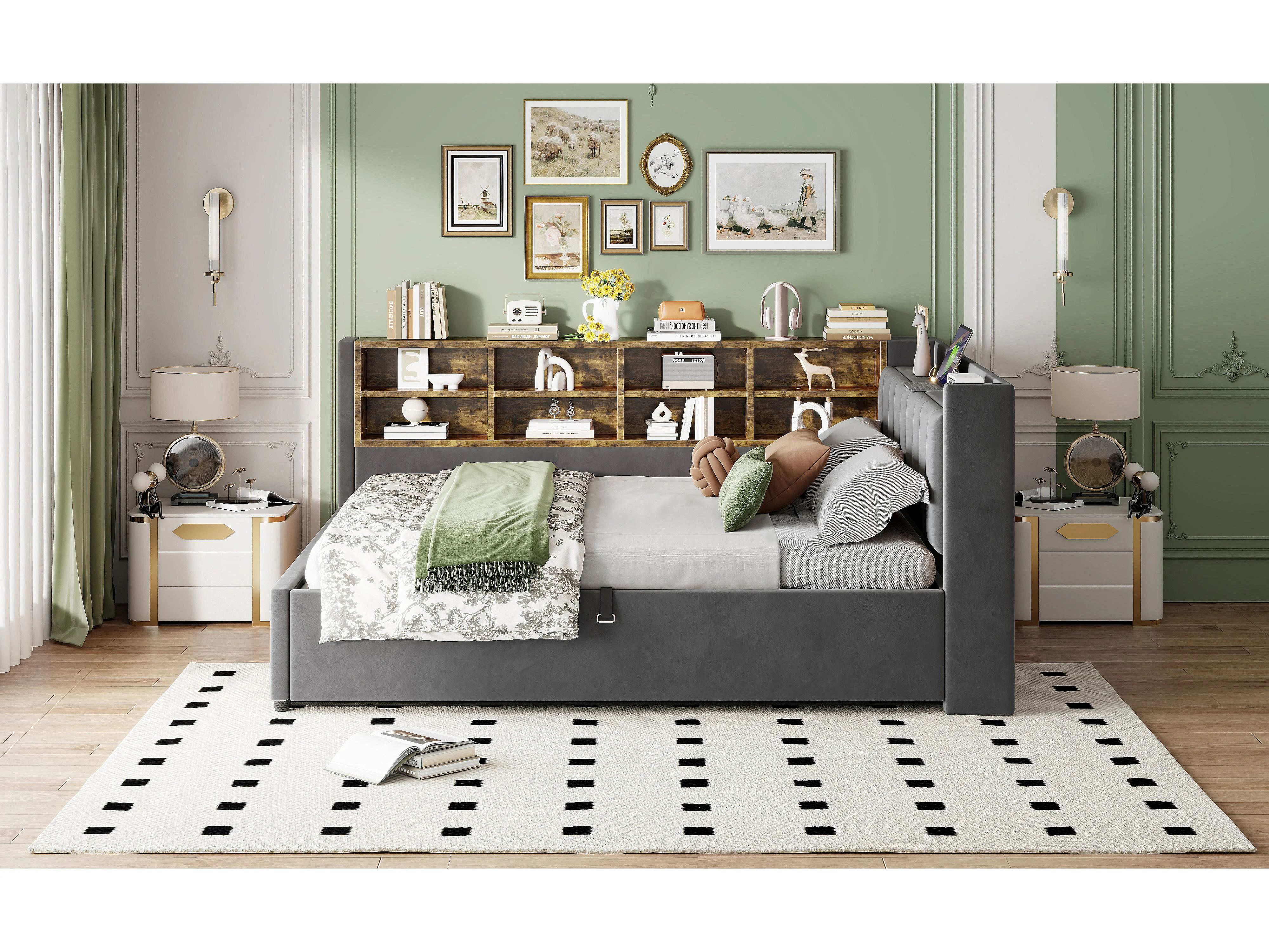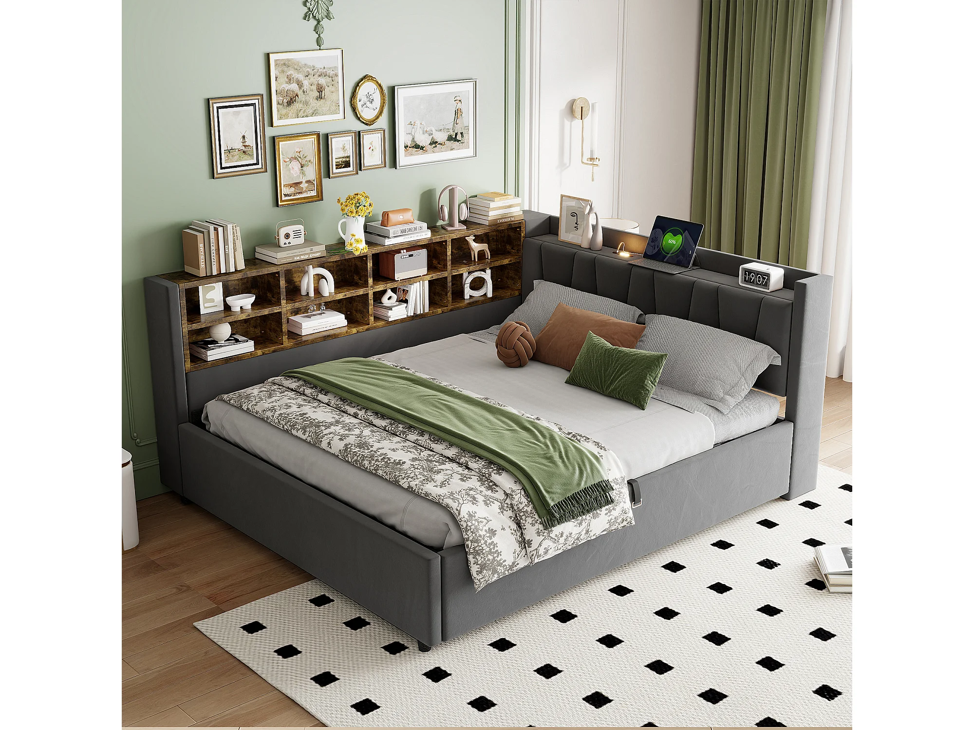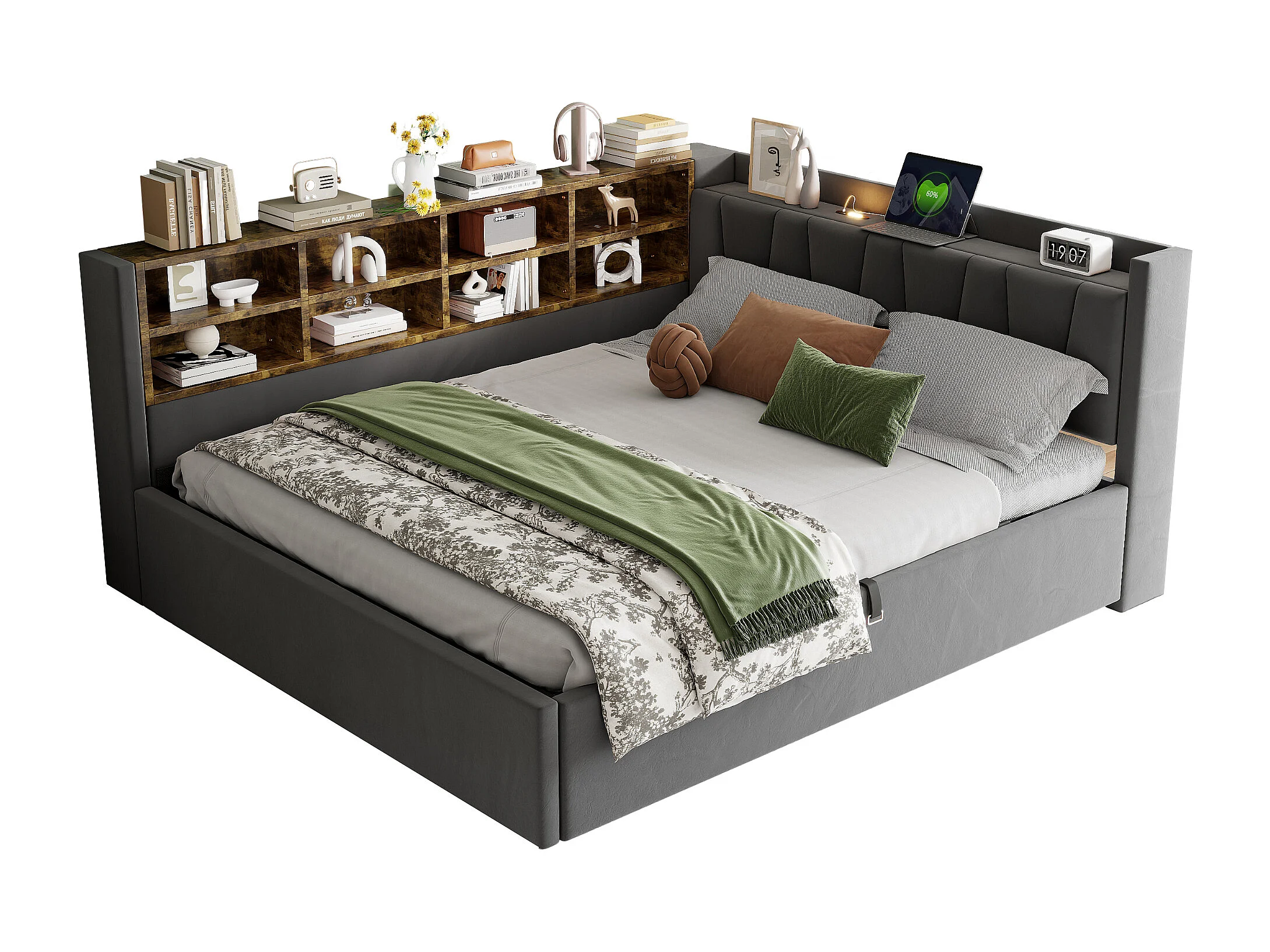 Lit multifonctionnel 140×200 cm, avec rangement hydraulique, éclairage nocturne et ports USB, en velours gris