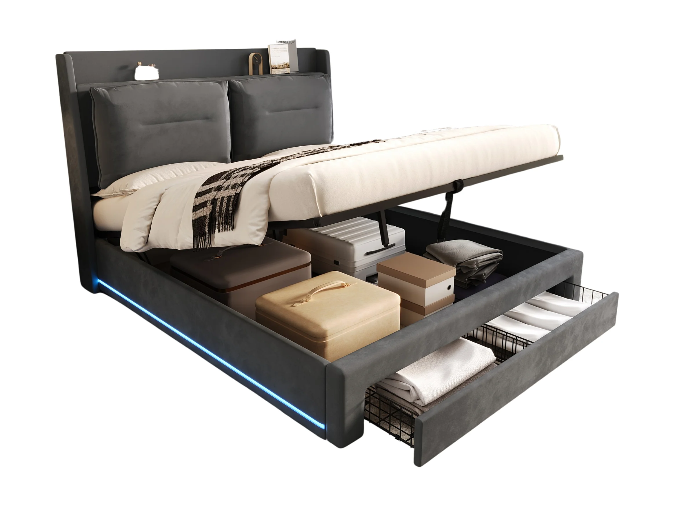 Lit multifonctionnel 180×200 cm en velours gris foncé avec éclairage LED et rangement hydraulique