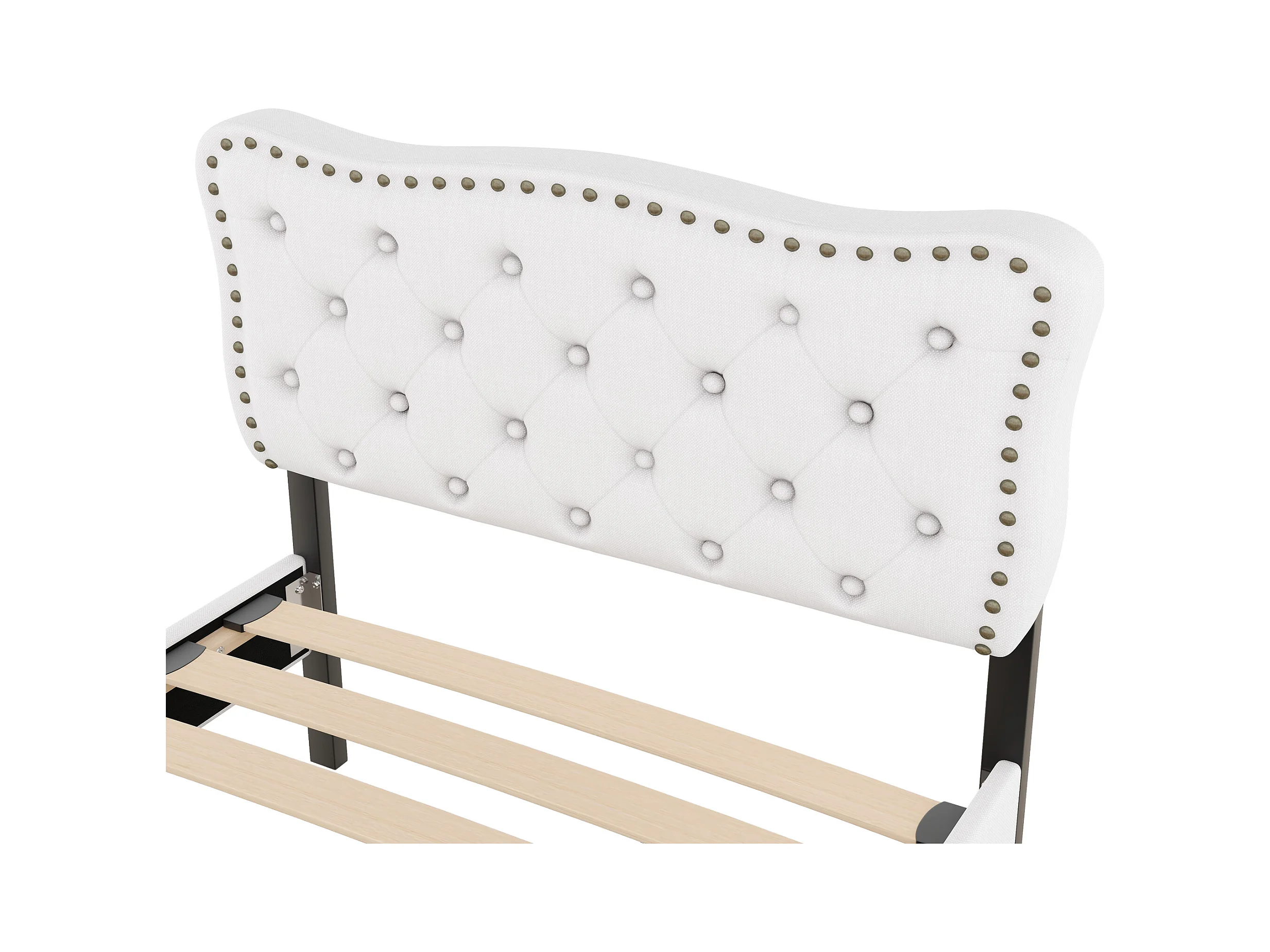 lit adulte 90x200cm, en lin beige clair, avec 2 tiroirs de rangement, tête de lit Capitonné, sans matelas