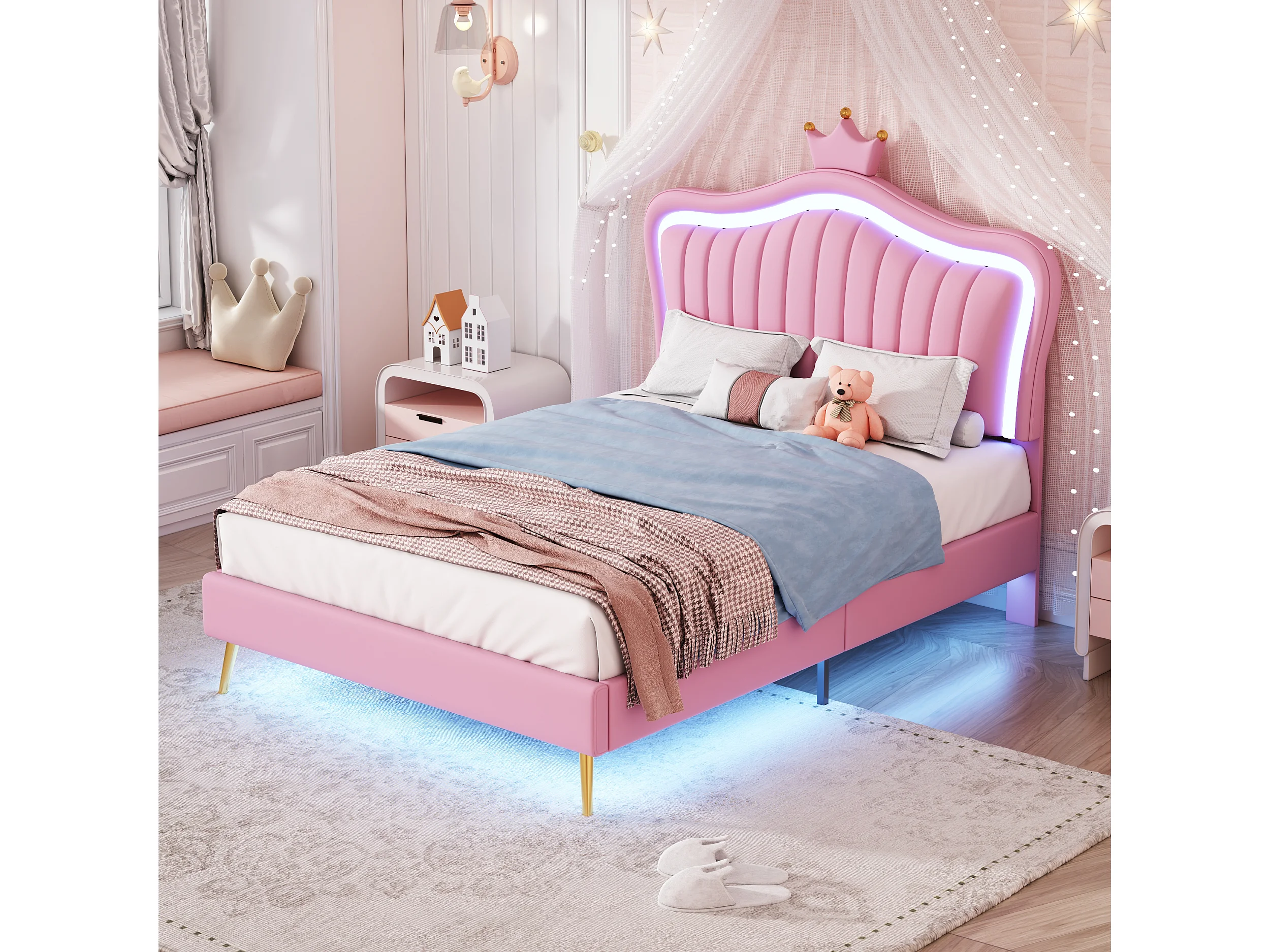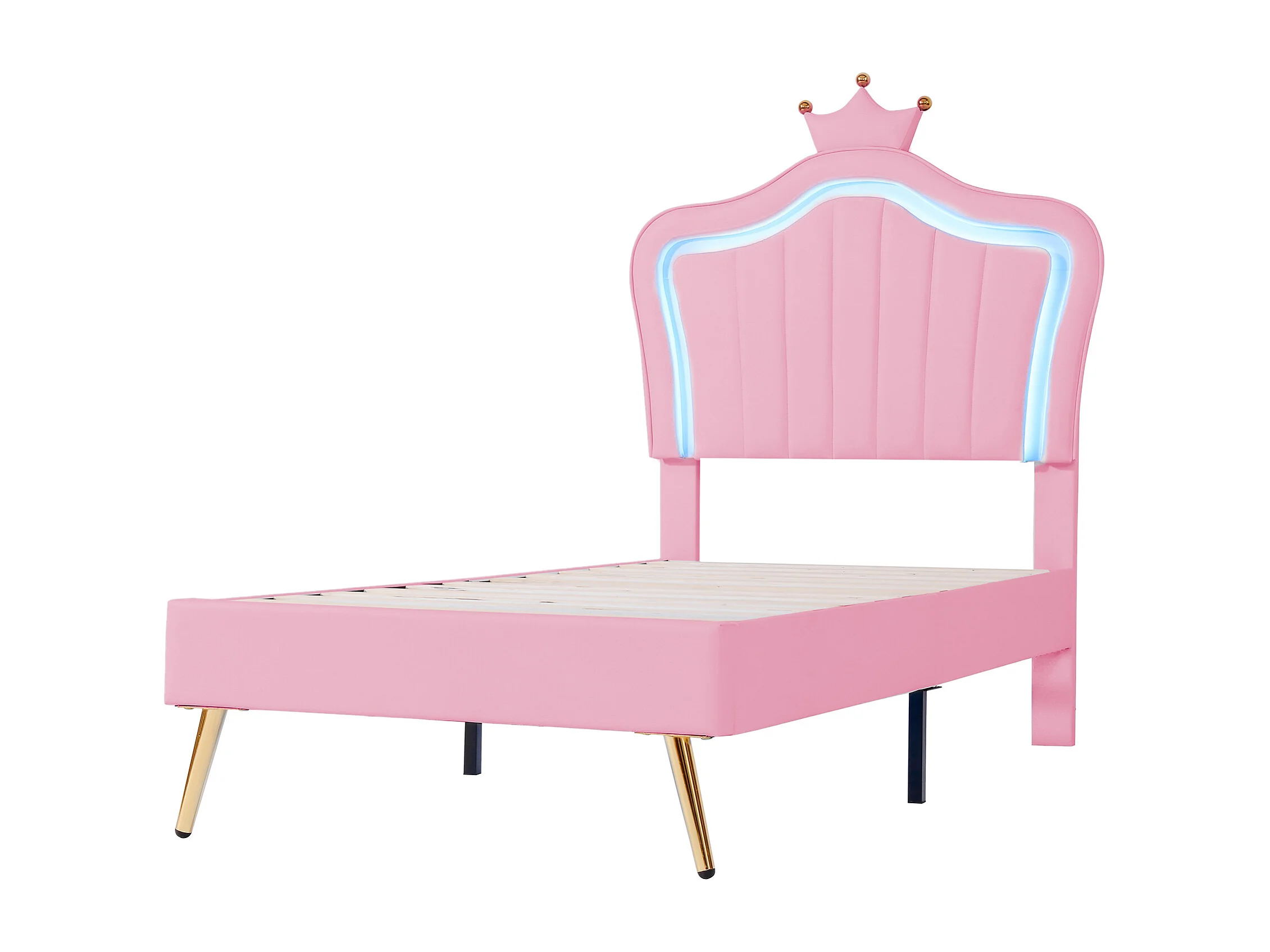 Lit princesse 90x200cm en PU rose - Tête de lit réglable et LED -Sans matelas
