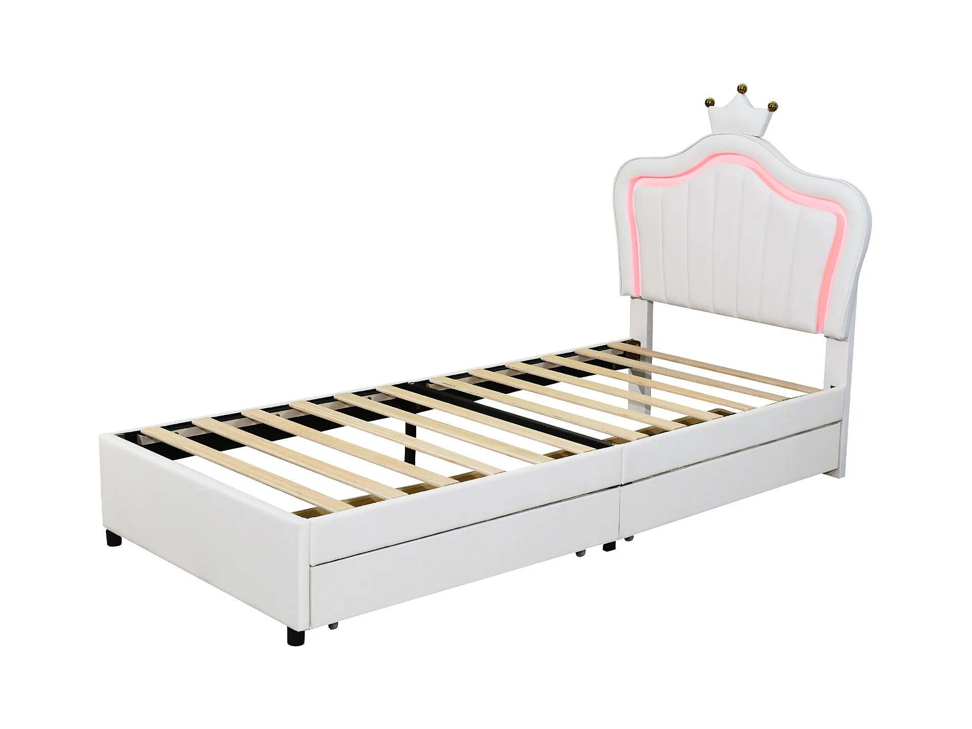 Lit princesse gigogne 90x200 cm avec 2 tiroirs, tête de lit en forme de couronne- PU Blanc(sans matelas)