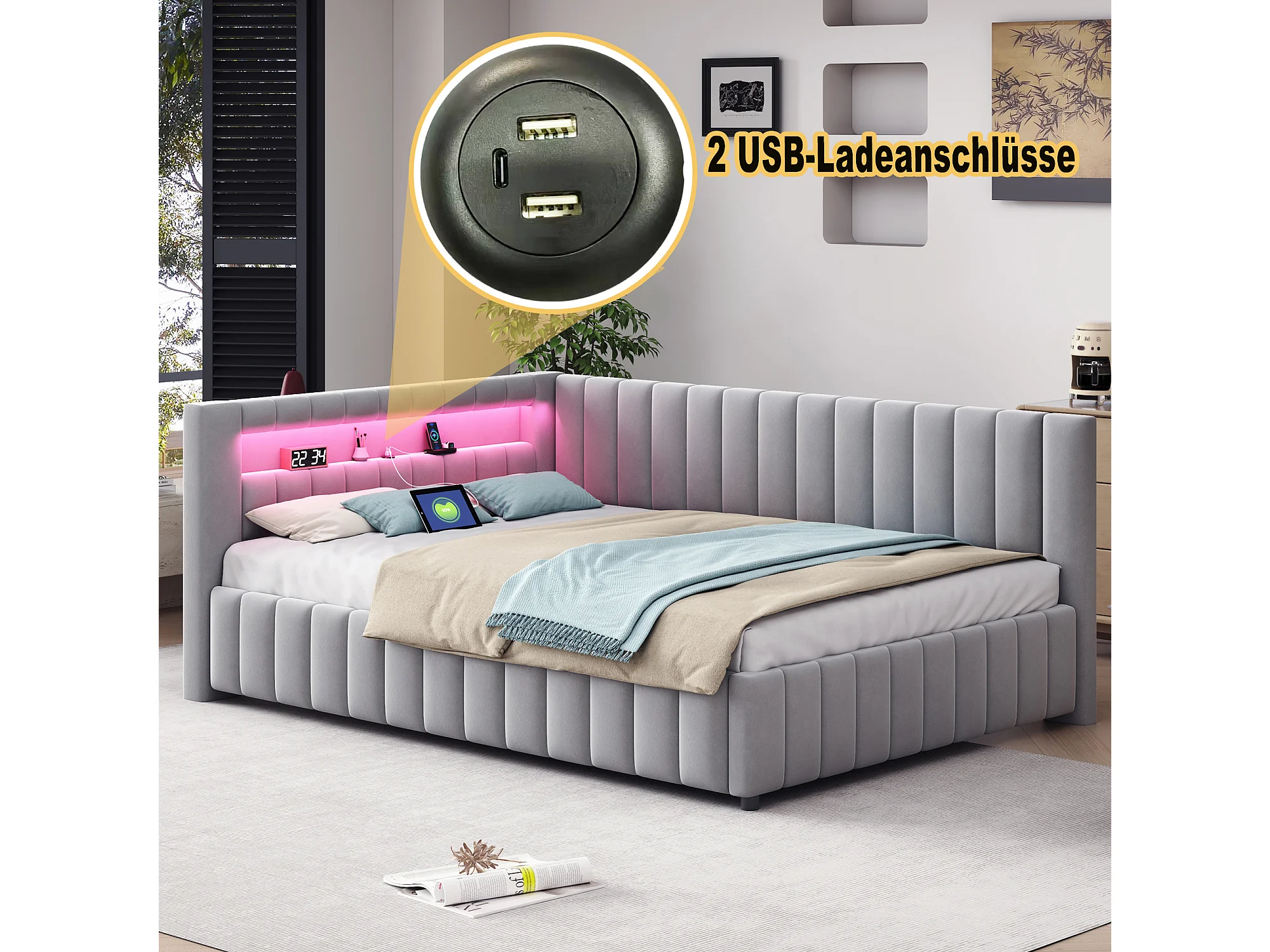 lit rembourré 140 x 200 cm, avec LED et USB, cadre de lit avec sommier à lattes en bois, gris