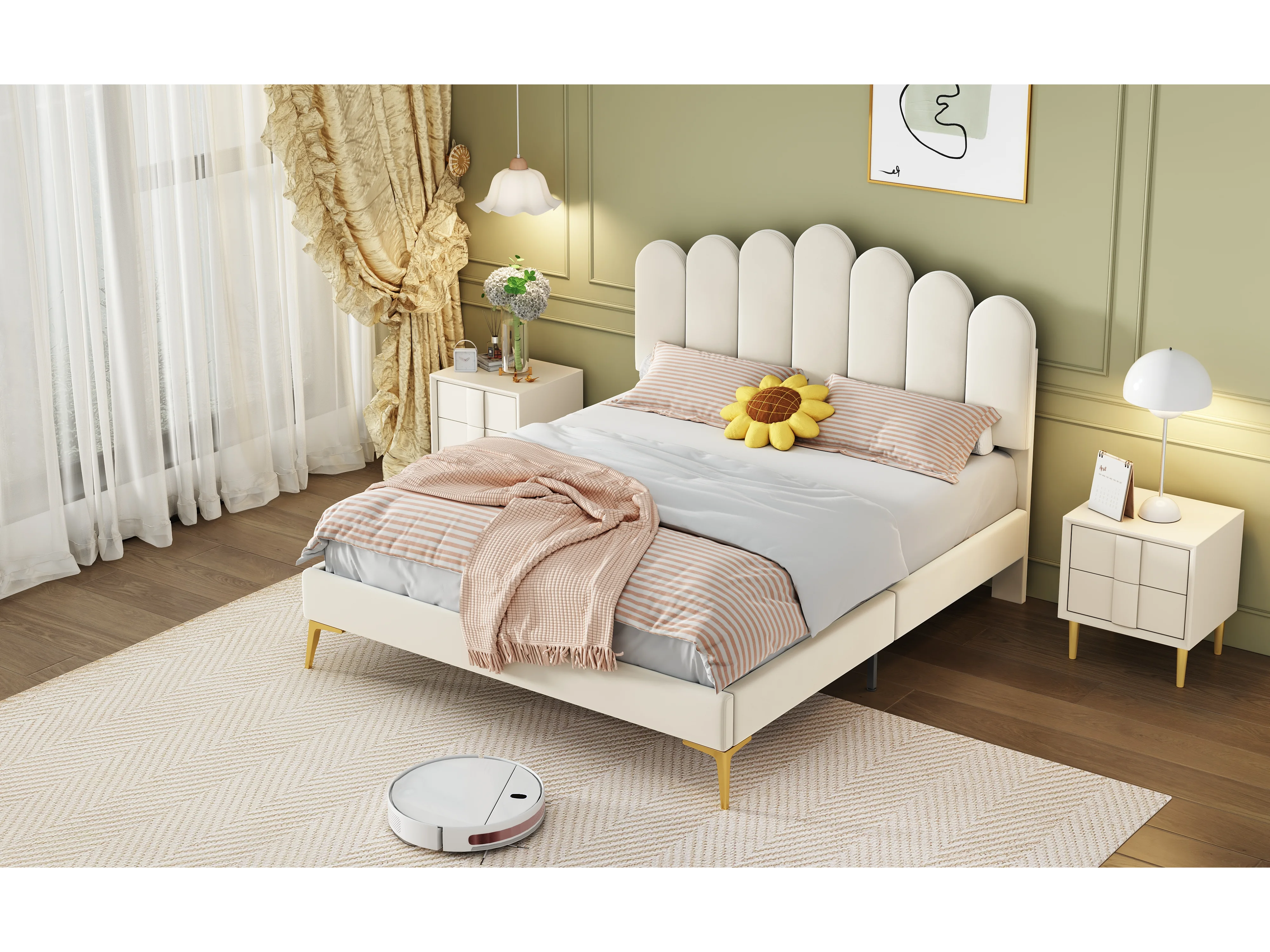 Lit rembourré 140x200 cm avec tête et sommier, velours beige, lit adulte ou junior, couchage supplémentaire