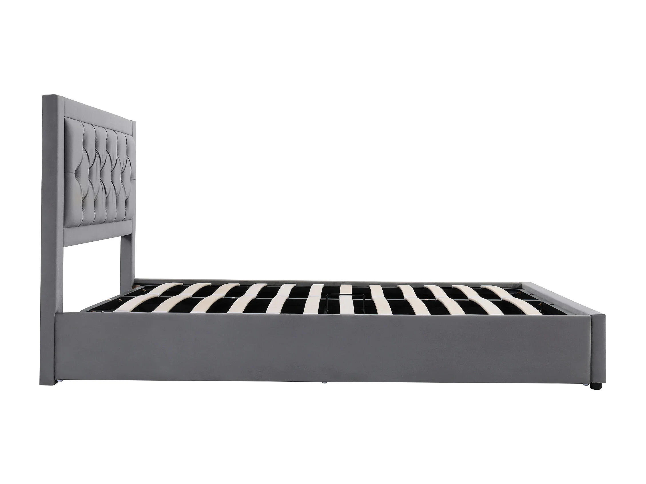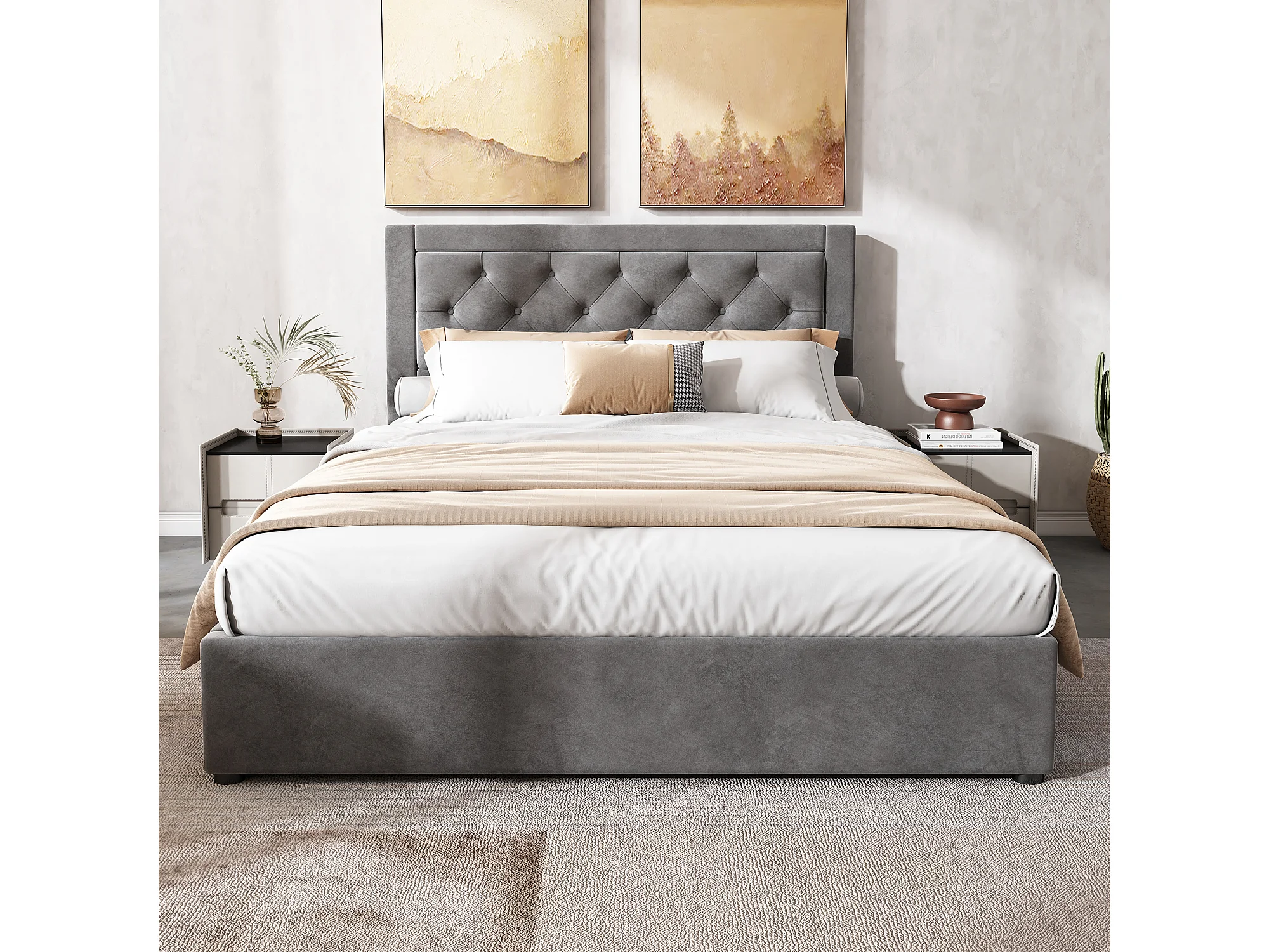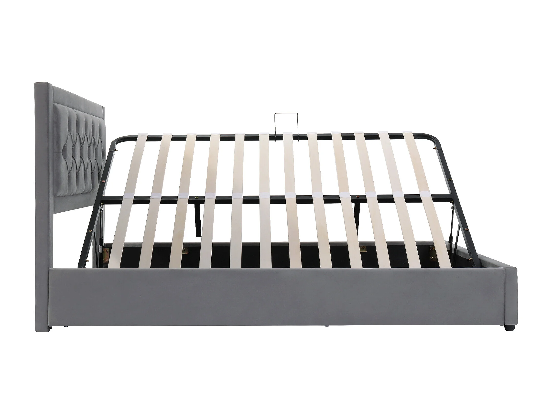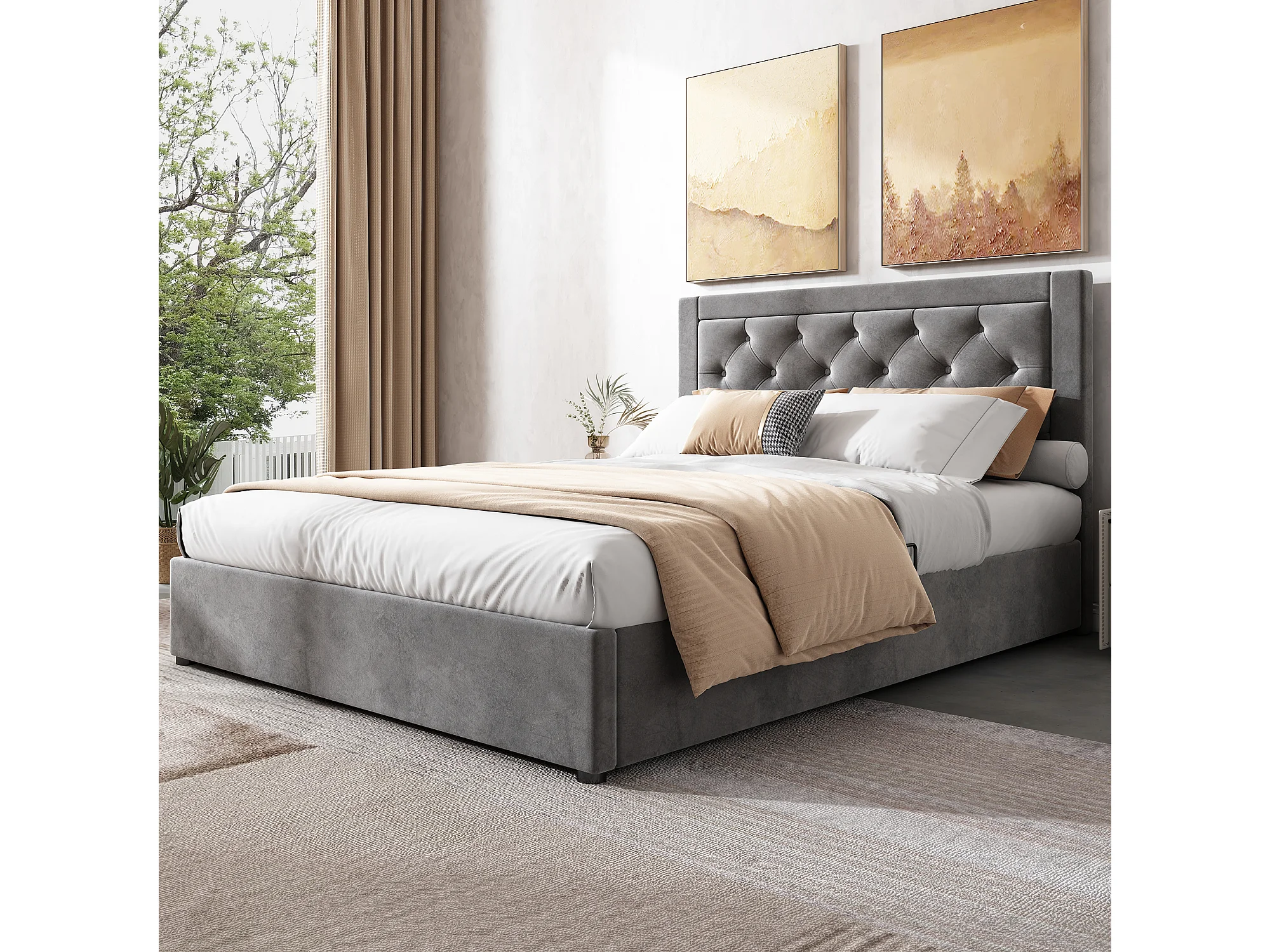 Lit rembourré 140×200 cm en velours gris avec rangement, tête de lit en mousse, style Chesterfield