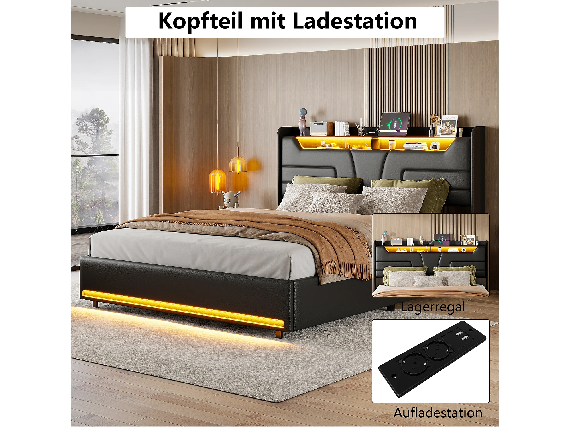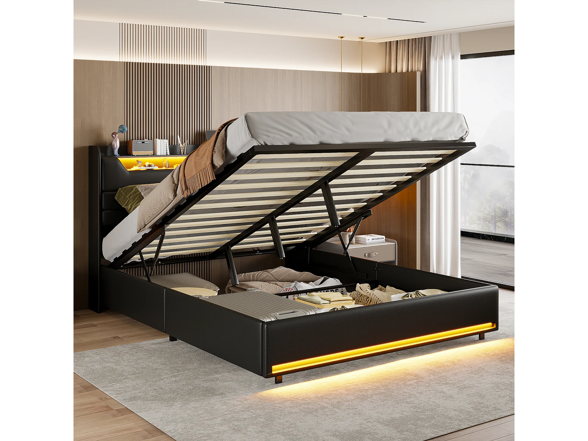 Lit rembourré 160×200 cm avec prises USB et secteur, lit enfant avec sommier à lattes et rangement, lit coffre LED, similicuir noir