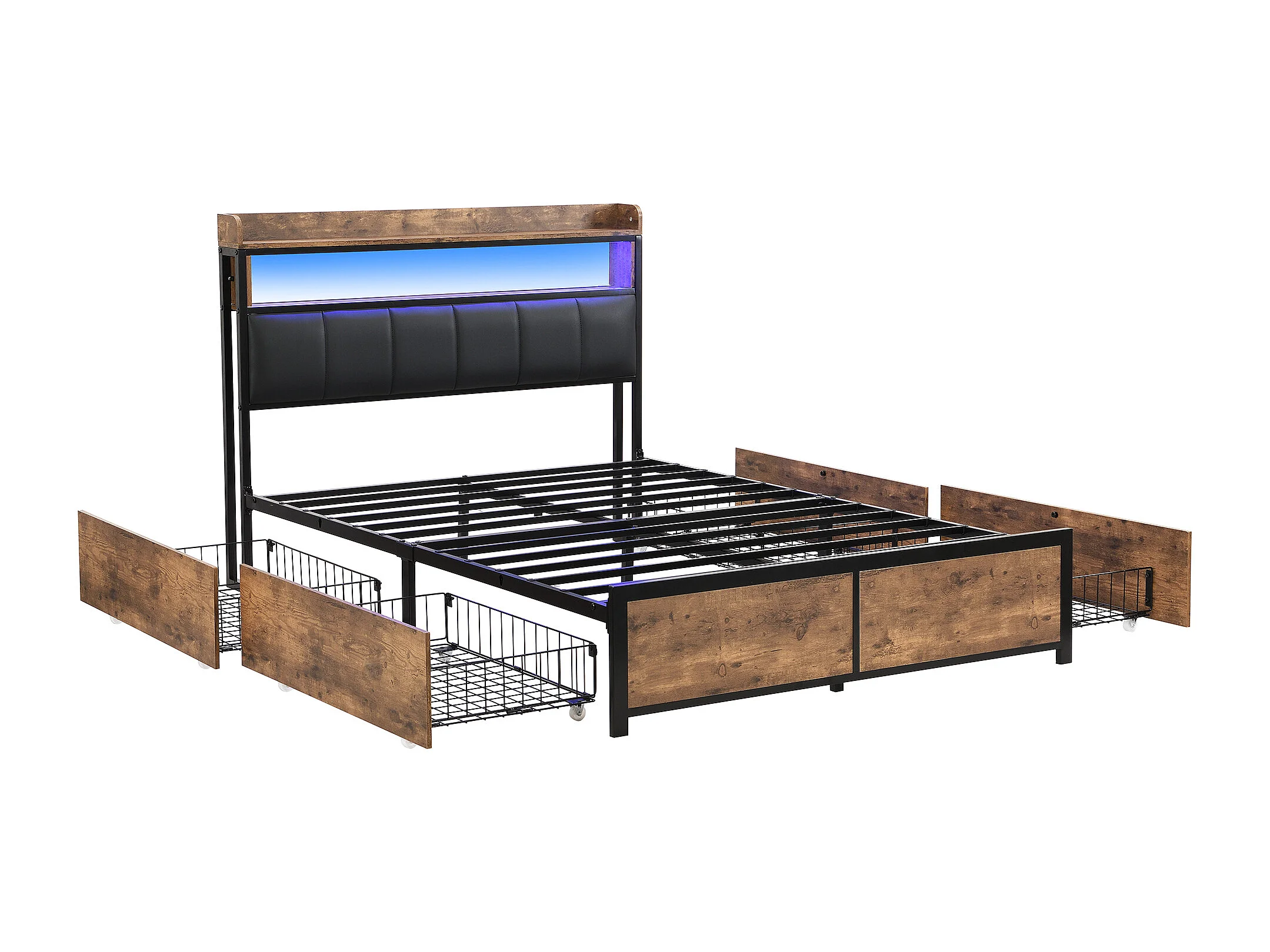 Lit rembourré 160×200 cm avec sommier à lattes et tête de lit, éclairage LED, 4 tiroirs, noir