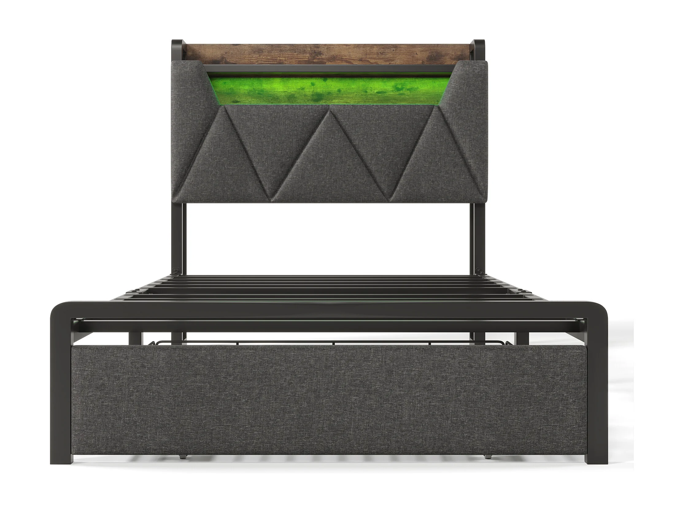 Lit adulte 90x200cm en lin avec LED + USB Type-C, éclairage, avec tiroirs de rangement, gris, sans matelas