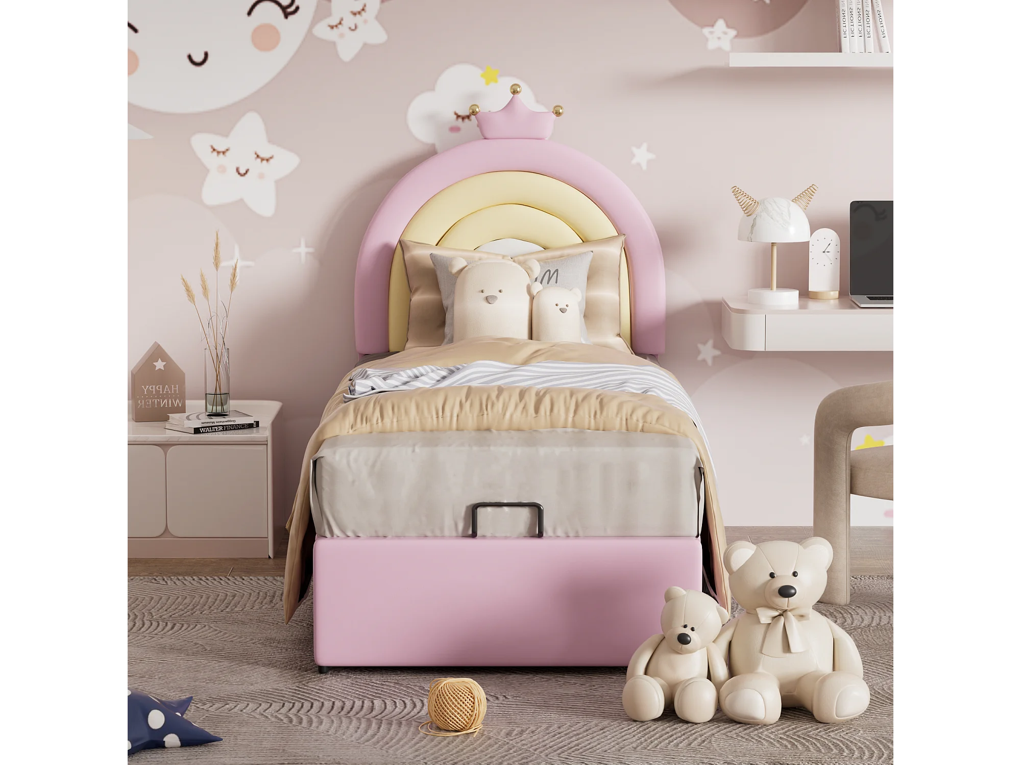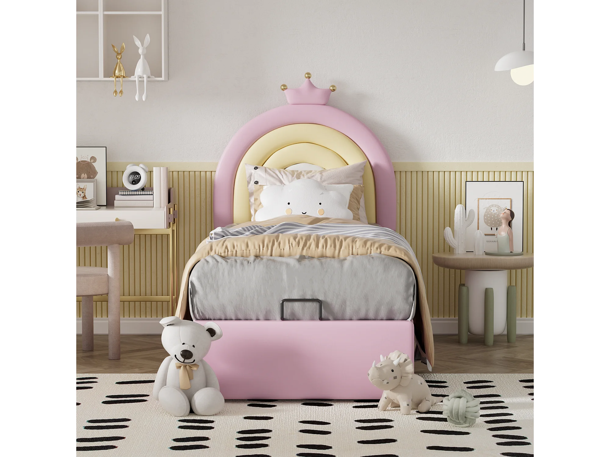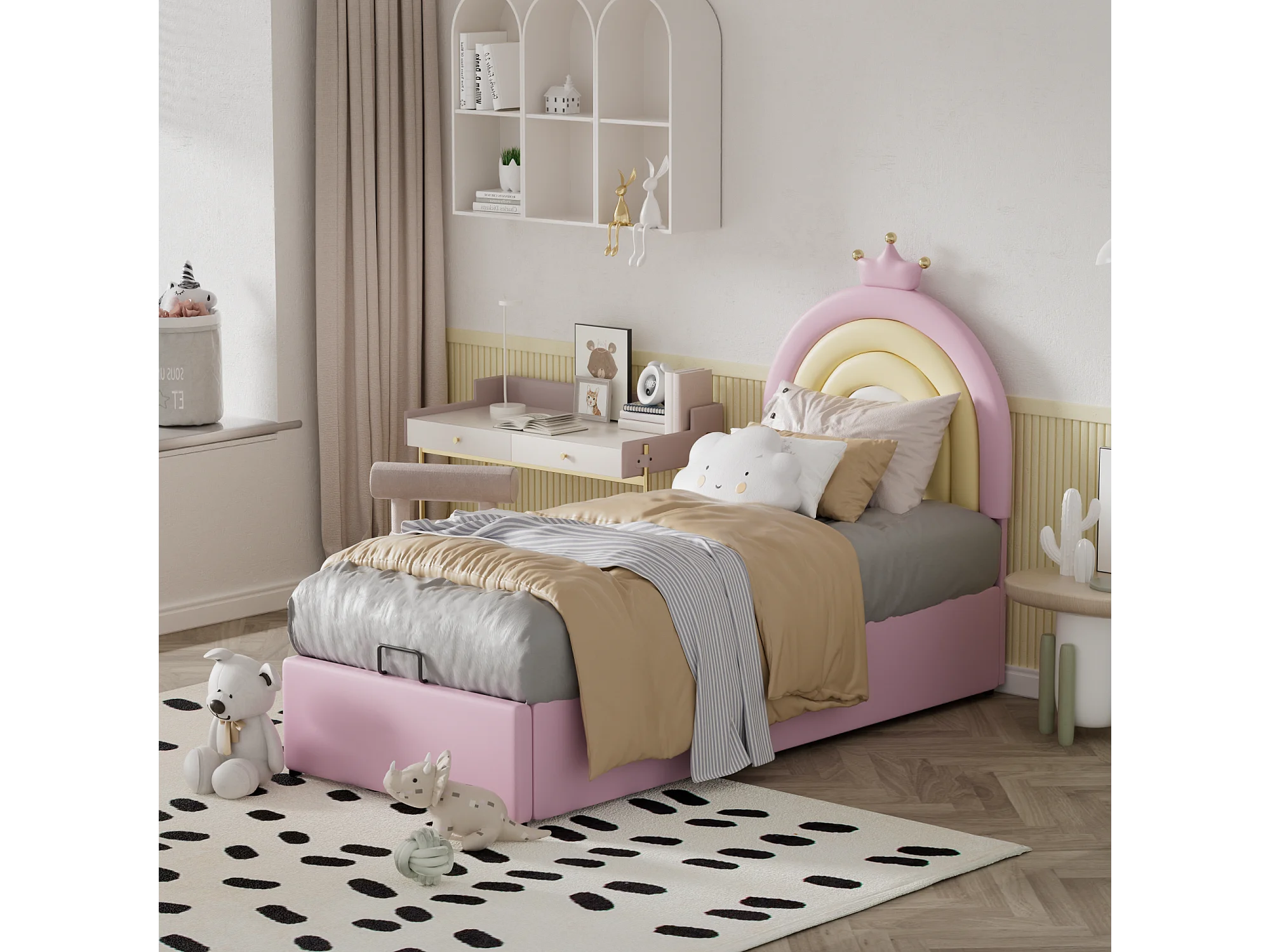 Lit rembourré 90×200 cm, avec échelle, tête de lit réglable, structure en pin naturel, montage facile, rose
