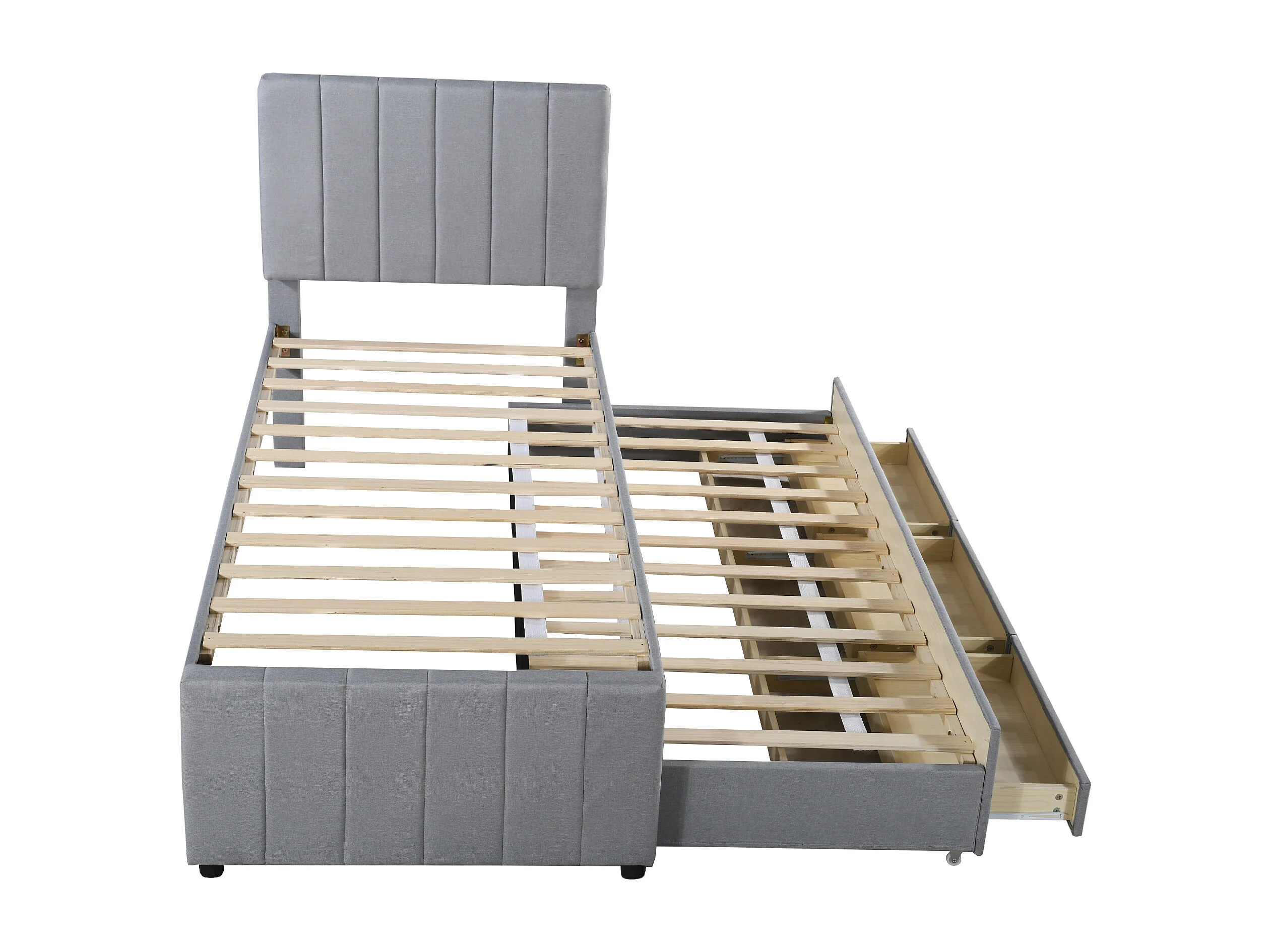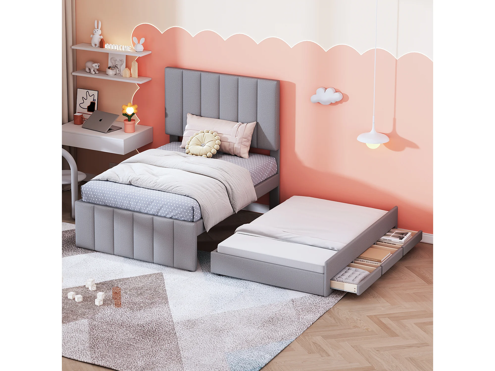 Lit rembourré 90x200 cm avec lit gigogne et tiroirs, revêtement en lin gris doux, lit simple multifonction