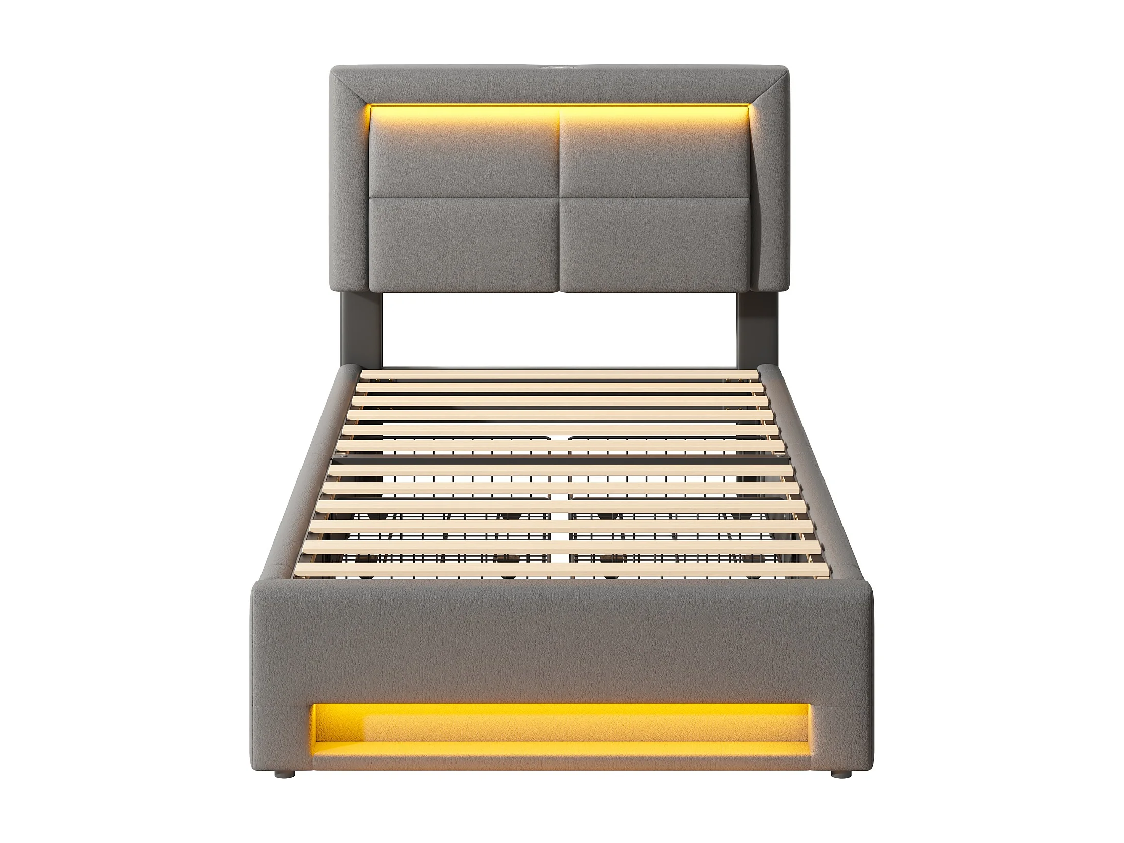 Lit rembourré 90x200 cm avec ports USB, éclairage LED et 4 tiroirs, sans matelas, gris